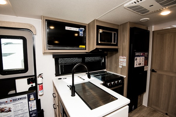 Each Rockwood Mini Lite travel trailer by Forest River is constructed with a fully laminated one-piece walkable roof, sleek frameless windows, and a six-sided full aluminum frame for strength and durability. The 12V thermostatically controlled heated tanks, plus radiant foil in the underbelly and slide out floors will allow you to camp well into the colder months, and the 200W roof solar panel will be perfect for a little off-gridding. Each model includes solid surface kitchen countertops, solid wood cabinet doors, night roller shades, plus many more interior features. Having an AIR 360+ omnidirectional antenna with WiFi prep on board gives you the option to get some work done if it's needed, and the power tongue jack provides hassle-free set up, so you can enjoy more time relaxing!