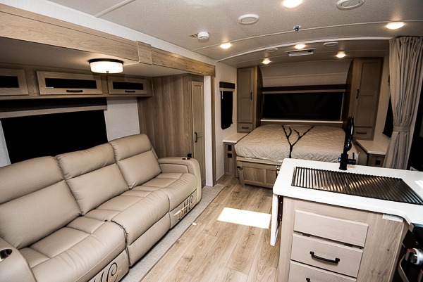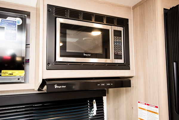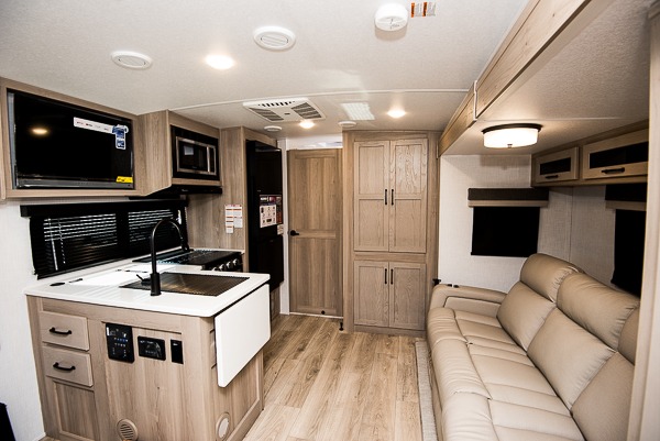 This versatile and cozy travel trailer will be perfect for weekend trips to the lake. Once you arrive at your campground, you can unload the water toys from the pass-thru storage, put out the 15' power awning, then make lunch on the exterior griddle. The U-shaped dinette slide inside will provide a place to dine, play board games, and let a guest or two sleep over, while you take the RV queen-size Murphy bed up front. In the morning, just fold up the bed to expose the 74" sofa! There is a three burner cooktop and microwave oven in the kitchen to make meals each day, along with a 12V refrigerator to keep leftovers fresh.