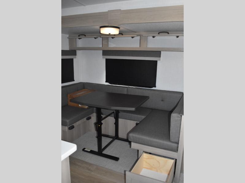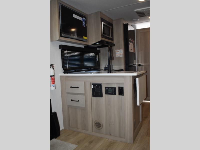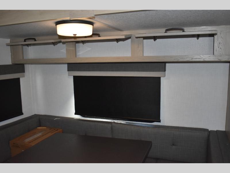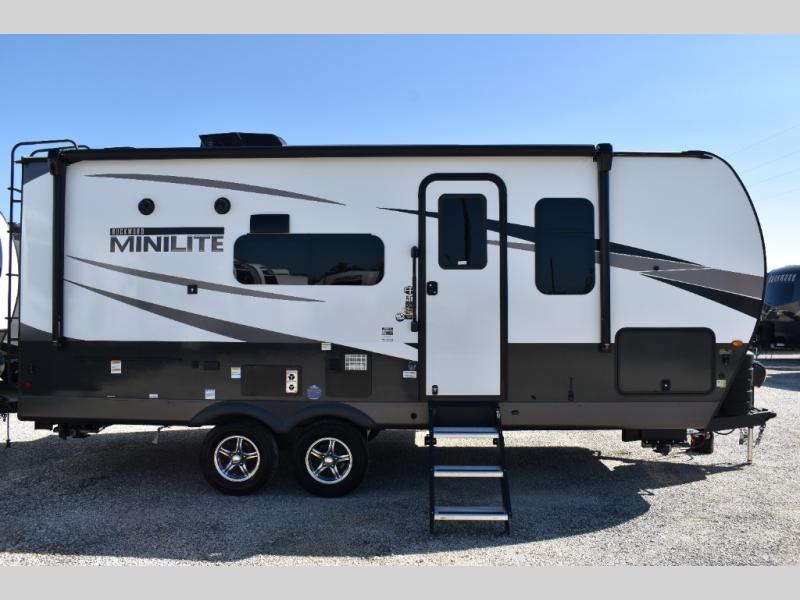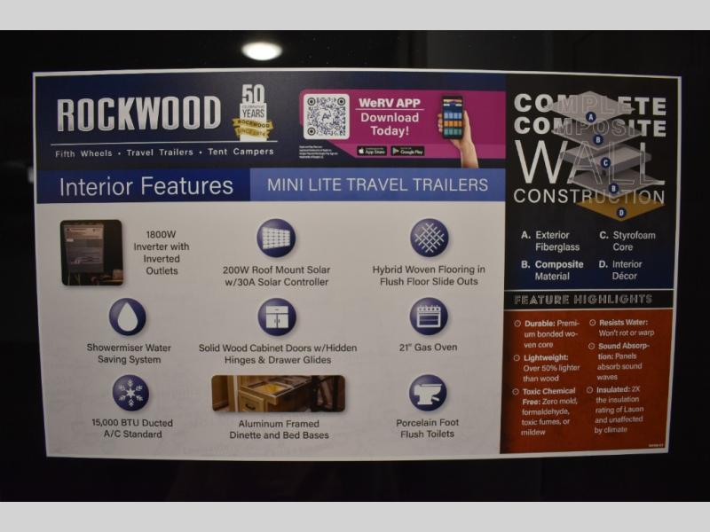 Each Rockwood Mini Lite travel trailer by Forest River is constructed with a fully laminated one-piece walkable roof, sleek frameless windows, and a six-sided full aluminum frame for strength and durability. The 12V thermostatically controlled heated tanks, plus radiant foil in the underbelly and slide out floors will allow you to camp well into the colder months, and the 200W roof solar panel will be perfect for a little off-gridding. Each model includes solid surface kitchen countertops, solid wood cabinet doors, night roller shades, plus many more interior features. Having an AIR 360+ omnidirectional antenna with WiFi prep on board gives you the option to get some work done if it's needed, and the power tongue jack provides hassle-free set up, so you can enjoy more time relaxing!