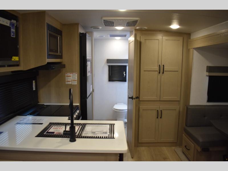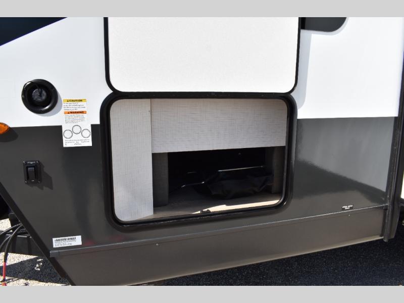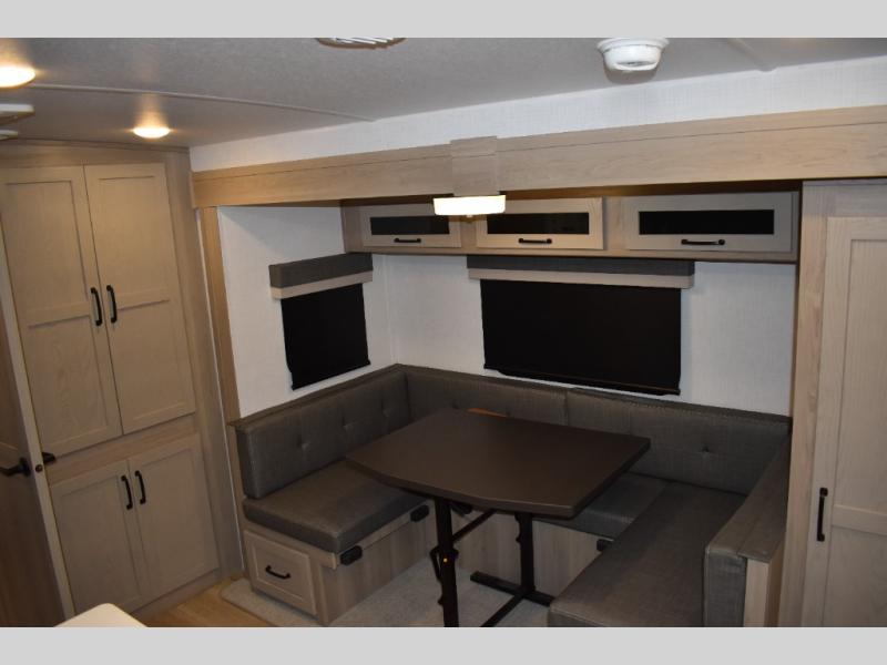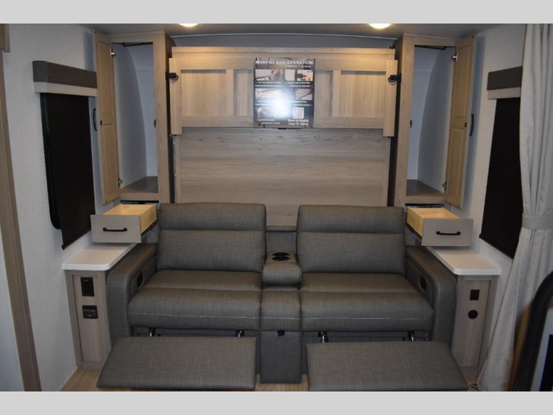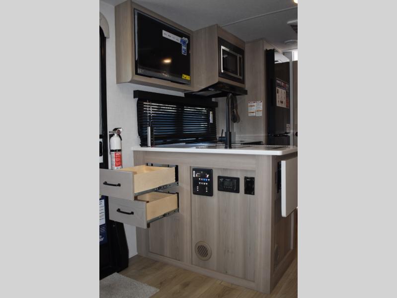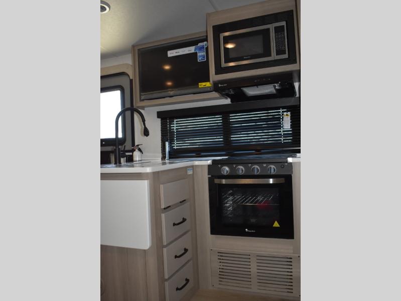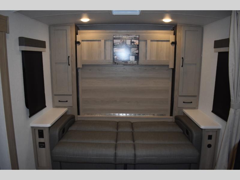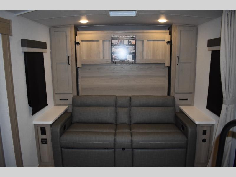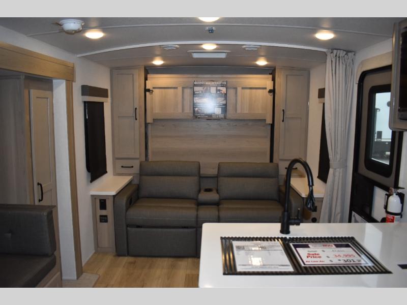 This versatile and cozy travel trailer will be perfect for weekend trips to the lake. Once you arrive at your campground, you can unload the water toys from the pass-thru storage, put out the 15' power awning, then make lunch on the exterior griddle. The U-shaped dinette slide inside will provide a place to dine, play board games, and let a guest or two sleep over, while you take the RV queen-size Murphy bed up front. In the morning, just fold up the bed to expose the 74" sofa! There is a three burner cooktop and microwave oven in the kitchen to make meals each day, along with a 12V refrigerator to keep leftovers fresh.