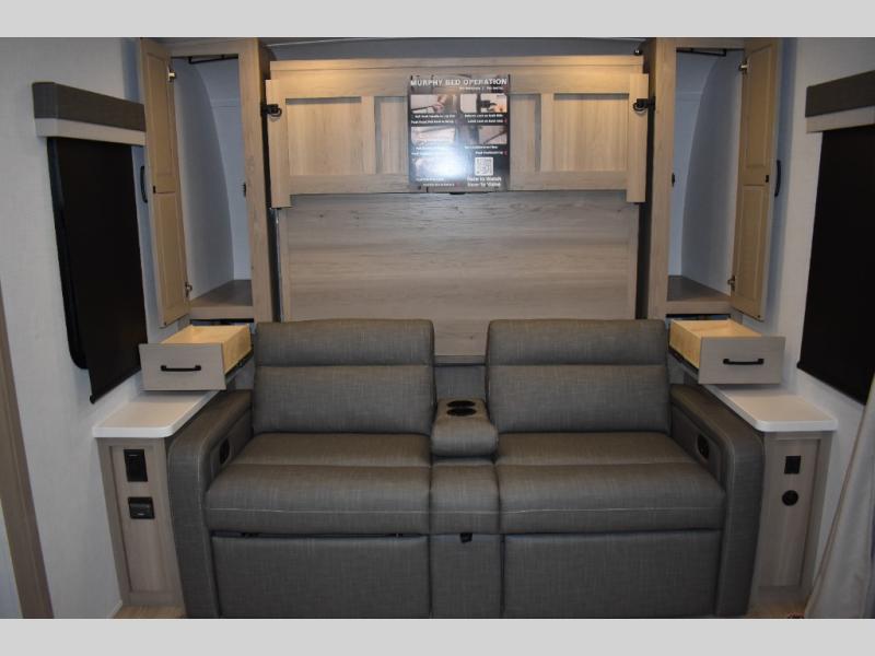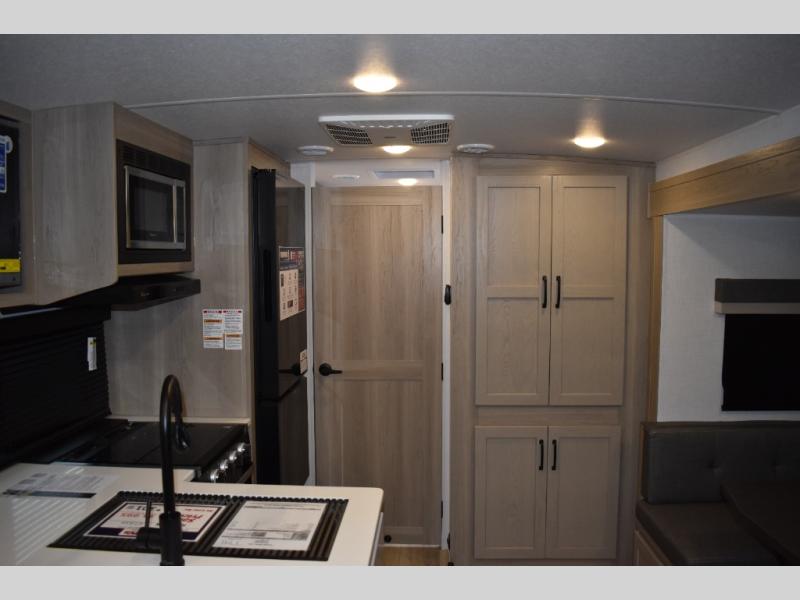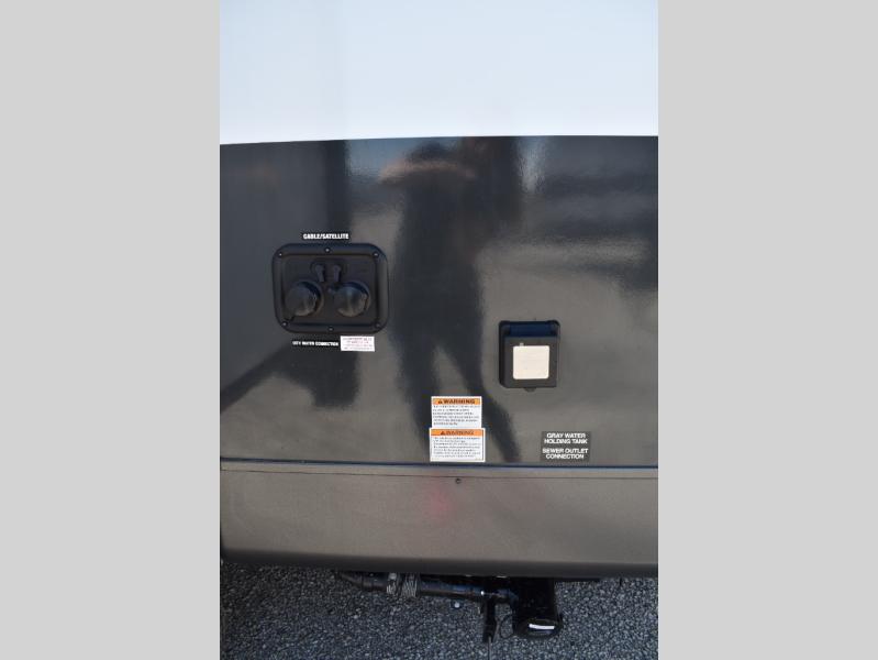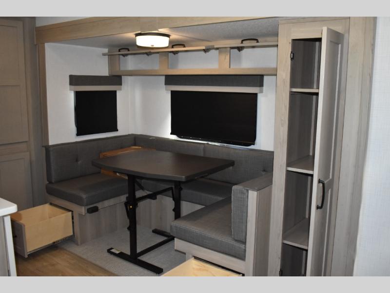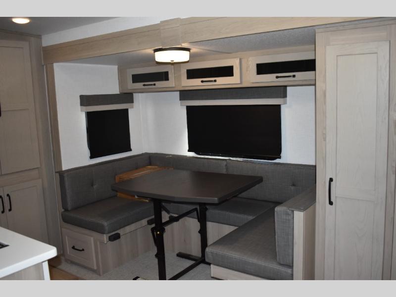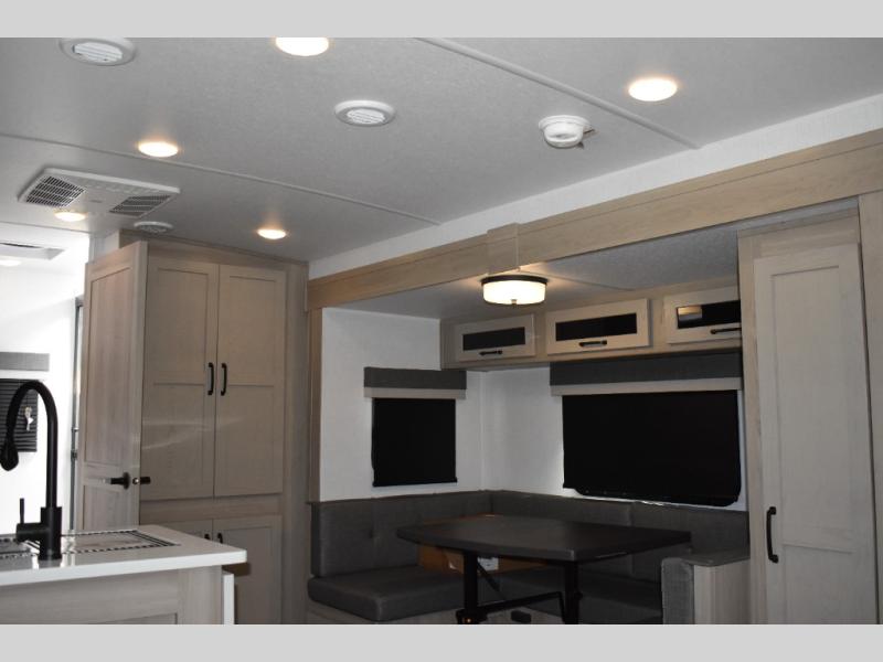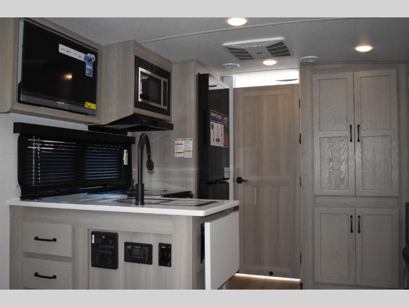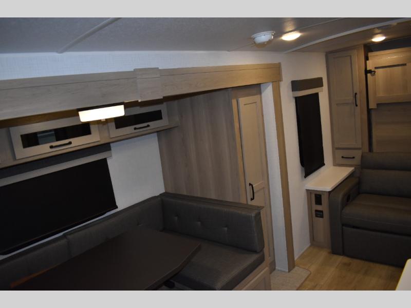 This versatile and cozy travel trailer will be perfect for weekend trips to the lake. Once you arrive at your campground, you can unload the water toys from the pass-thru storage, put out the 15' power awning, then make lunch on the exterior griddle. The U-shaped dinette slide inside will provide a place to dine, play board games, and let a guest or two sleep over, while you take the RV queen-size Murphy bed up front. In the morning, just fold up the bed to expose the 74" sofa! There is a three burner cooktop and microwave oven in the kitchen to make meals each day, along with a 12V refrigerator to keep leftovers fresh.
