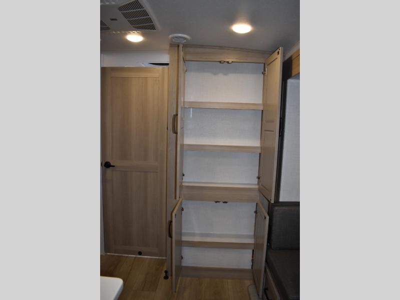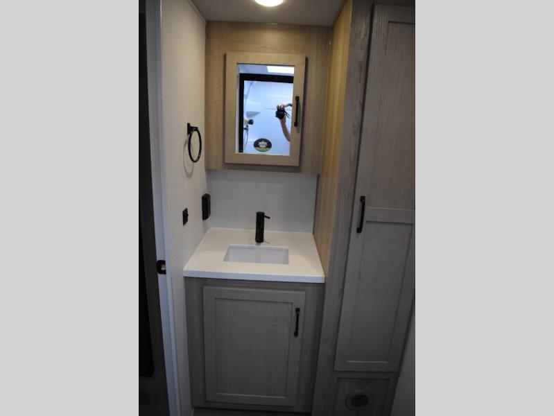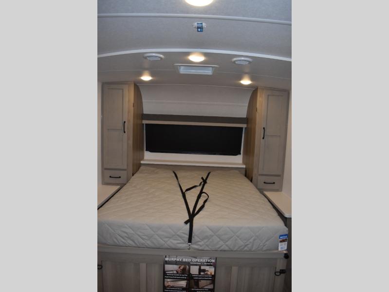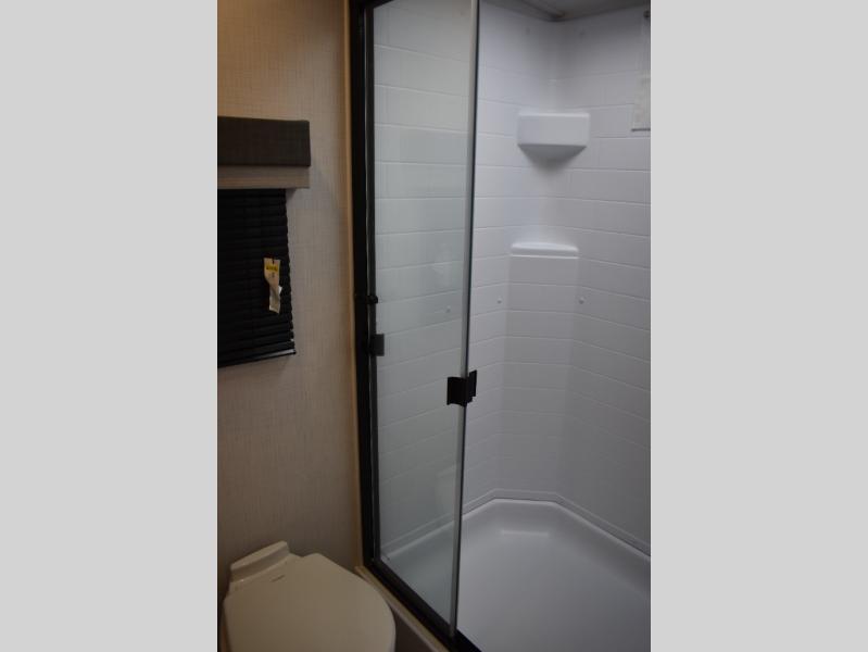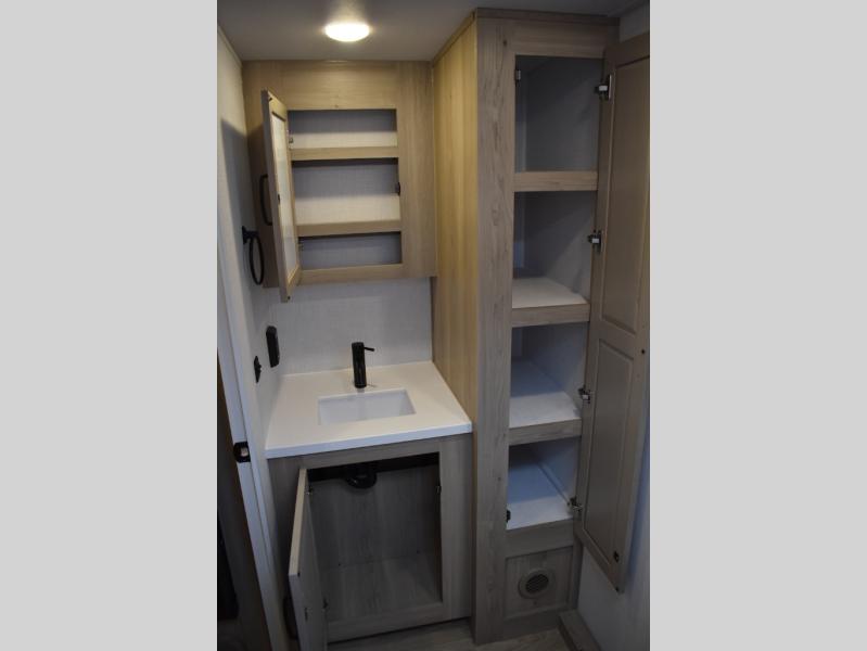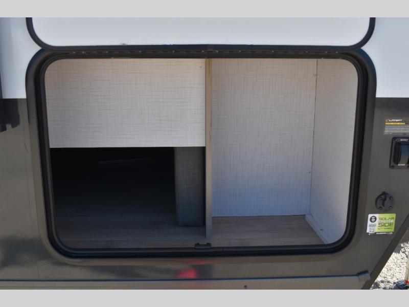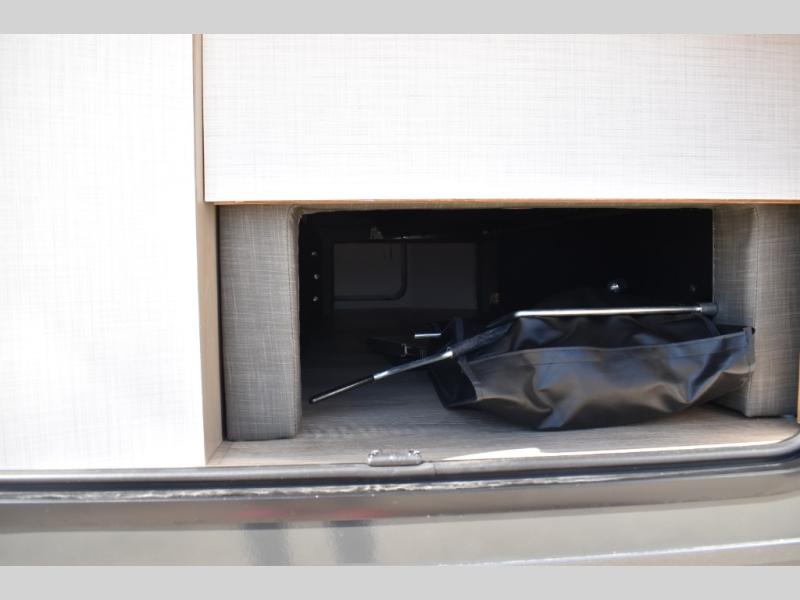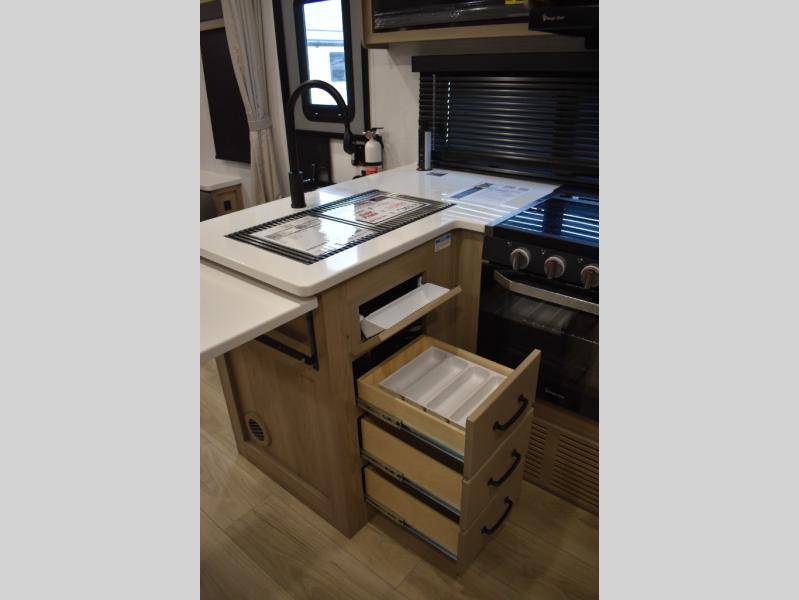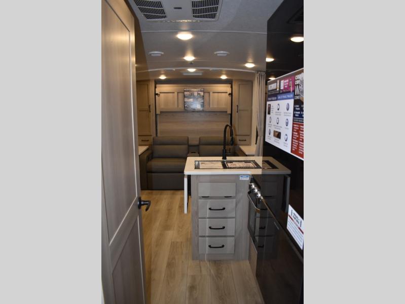 This versatile and cozy travel trailer will be perfect for weekend trips to the lake. Once you arrive at your campground, you can unload the water toys from the pass-thru storage, put out the 15' power awning, then make lunch on the exterior griddle. The U-shaped dinette slide inside will provide a place to dine, play board games, and let a guest or two sleep over, while you take the RV queen-size Murphy bed up front. In the morning, just fold up the bed to expose the 74" sofa! There is a three burner cooktop and microwave oven in the kitchen to make meals each day, along with a 12V refrigerator to keep leftovers fresh.