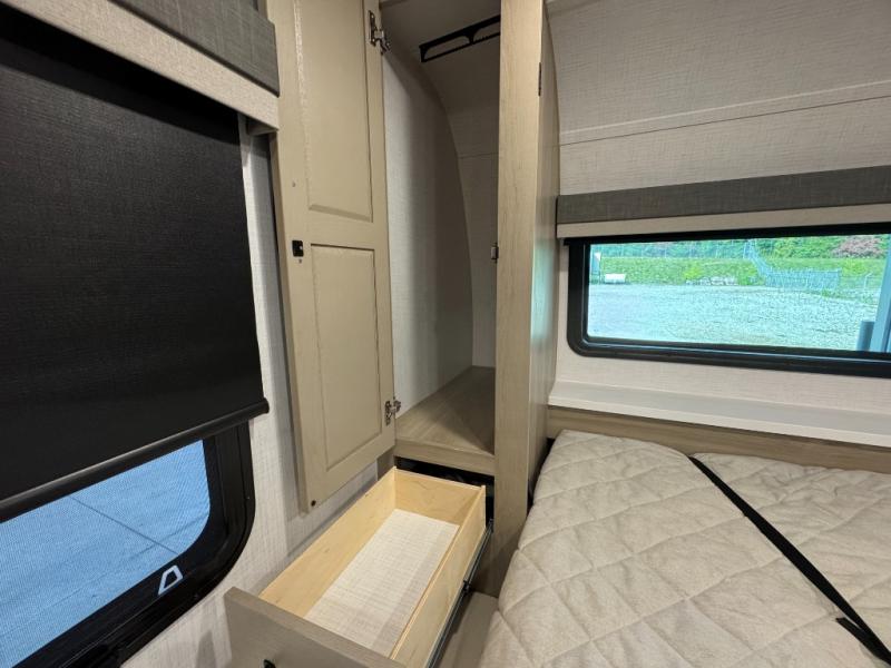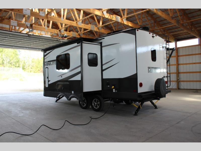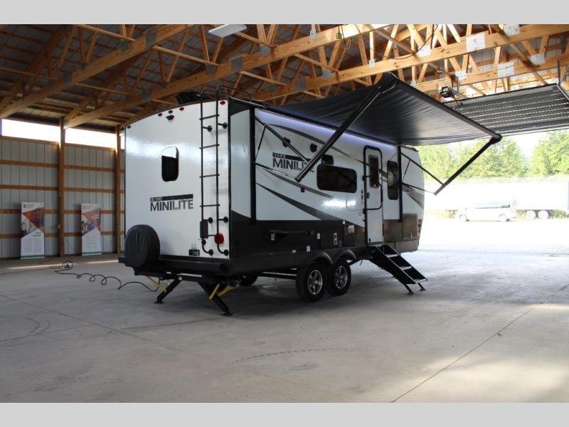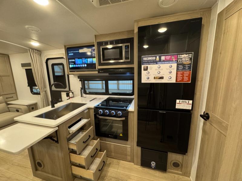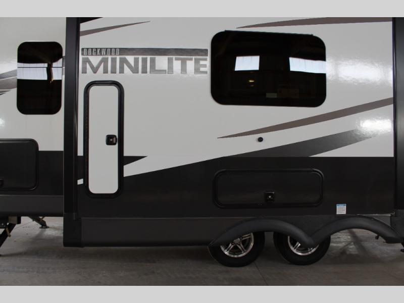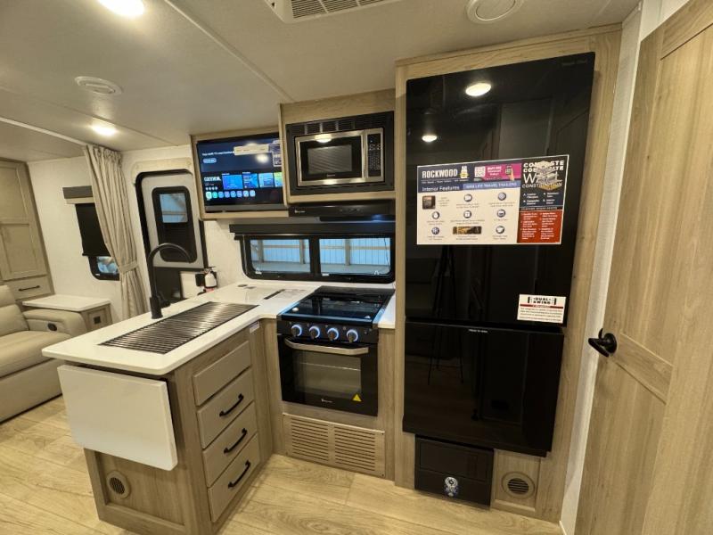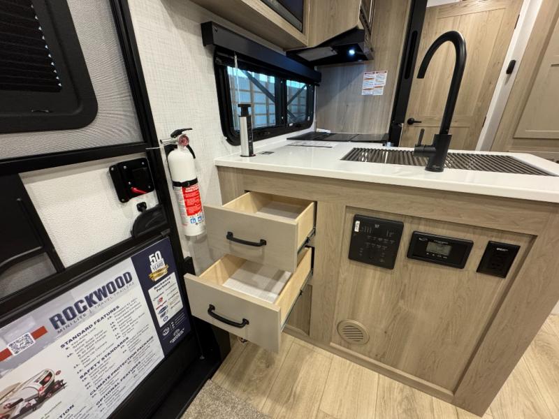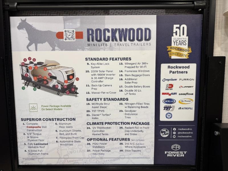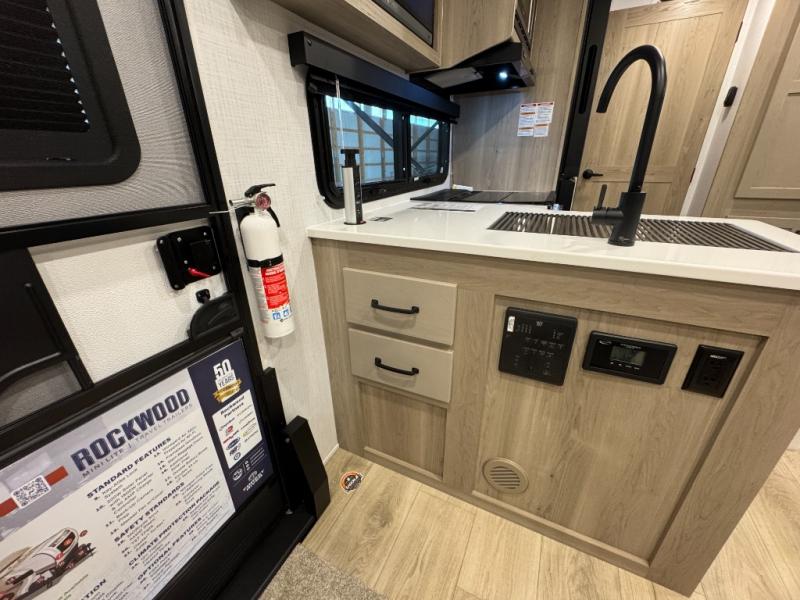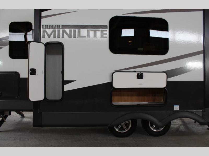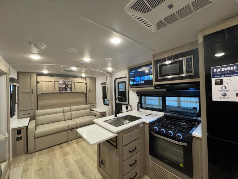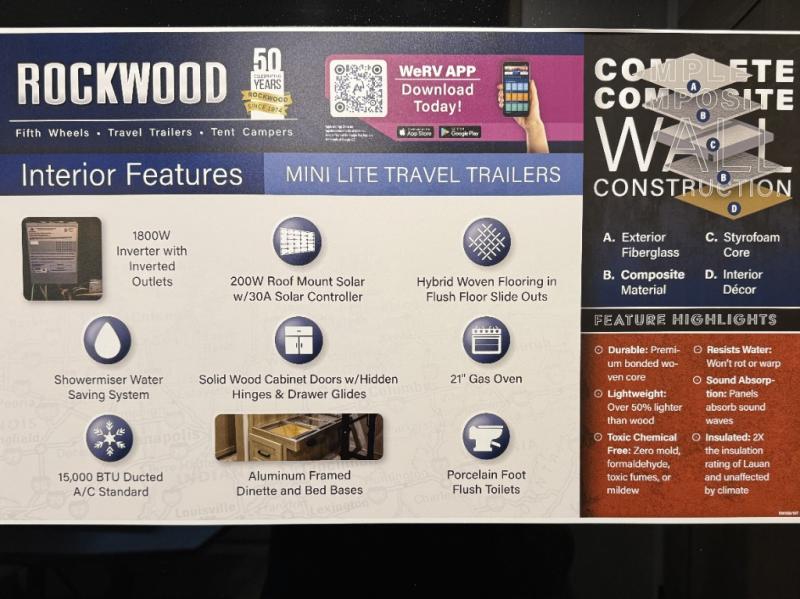 Each Rockwood Mini Lite travel trailer by Forest River is constructed with a fully laminated one-piece walkable roof, sleek frameless windows, and a six-sided full aluminum frame for strength and durability. The 12V thermostatically controlled heated tanks, plus radiant foil in the underbelly and slide out floors will allow you to camp well into the colder months, and the 200W roof solar panel will be perfect for a little off-gridding. Each model includes solid surface kitchen countertops, solid wood cabinet doors, night roller shades, plus many more interior features. Having an AIR 360+ omnidirectional antenna with WiFi prep on board gives you the option to get some work done if it's needed, and the power tongue jack provides hassle-free set up, so you can enjoy more time relaxing!