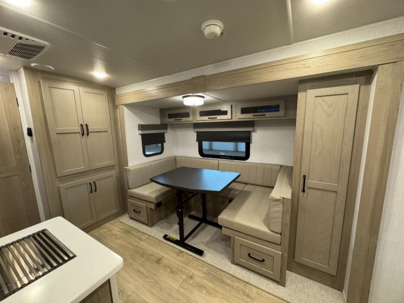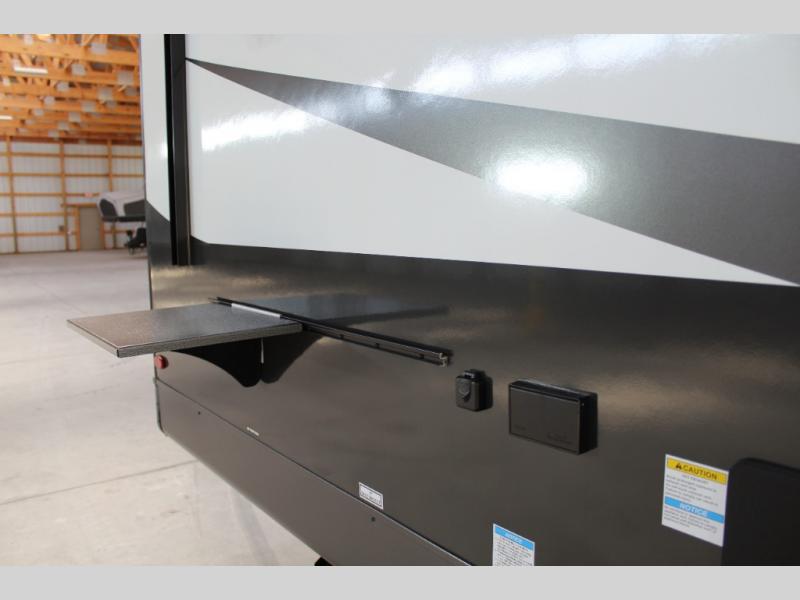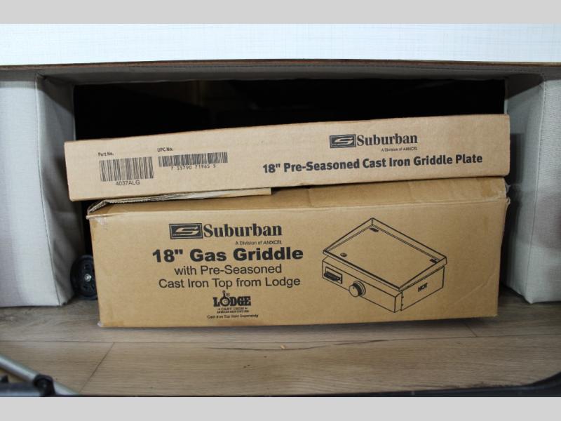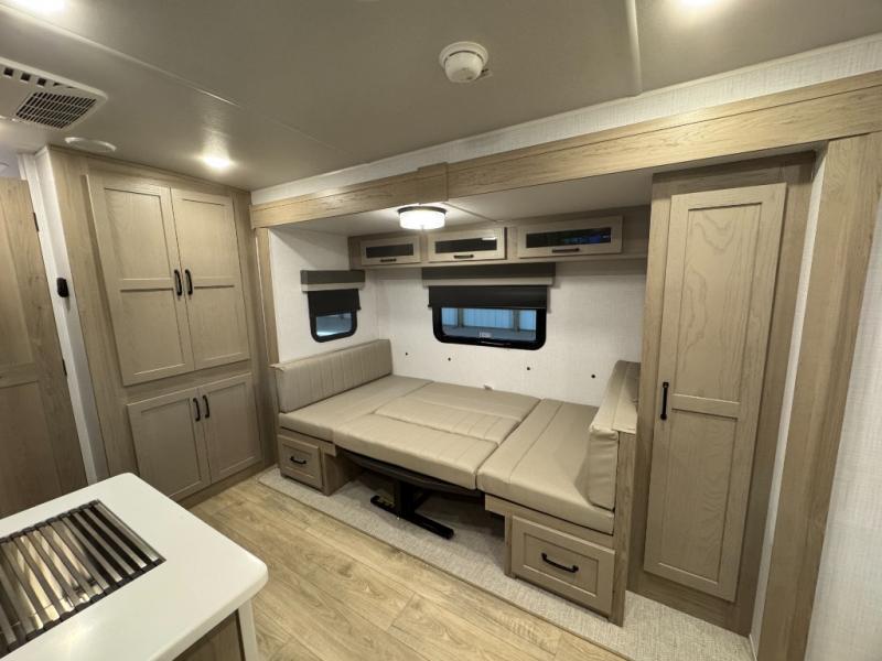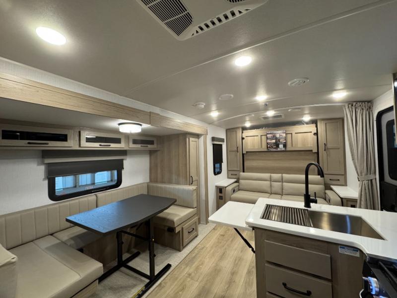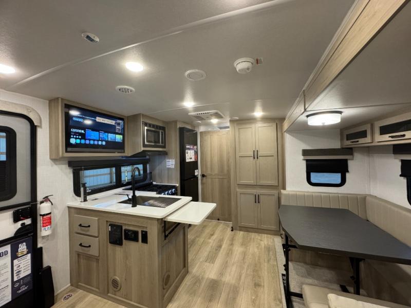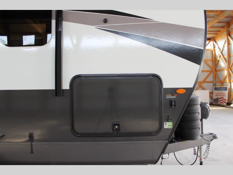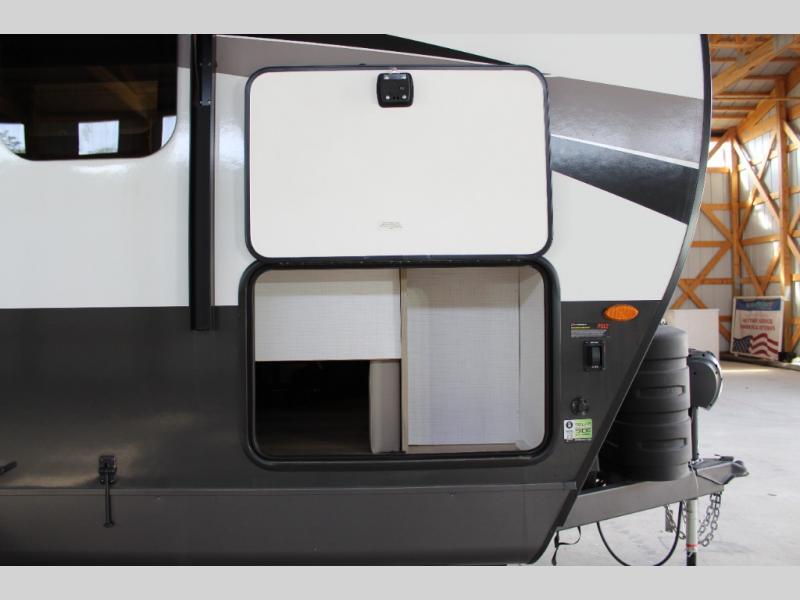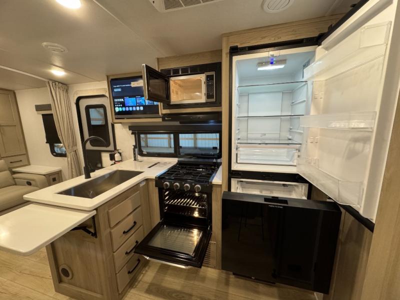 This versatile and cozy travel trailer will be perfect for weekend trips to the lake. Once you arrive at your campground, you can unload the water toys from the pass-thru storage, put out the 15' power awning, then make lunch on the exterior griddle. The U-shaped dinette slide inside will provide a place to dine, play board games, and let a guest or two sleep over, while you take the RV queen-size Murphy bed up front. In the morning, just fold up the bed to expose the 74" sofa! There is a three burner cooktop and microwave oven in the kitchen to make meals each day, along with a 12V refrigerator to keep leftovers fresh.