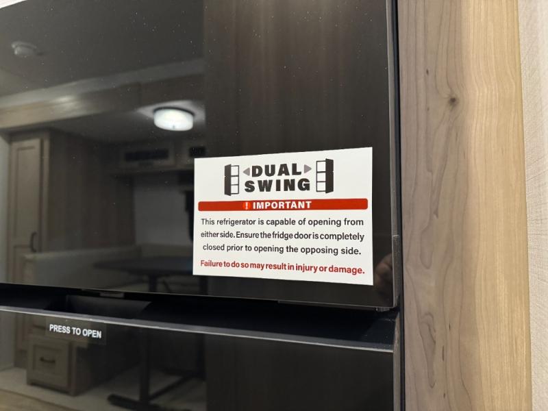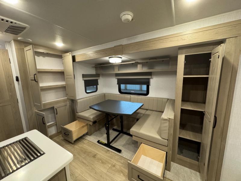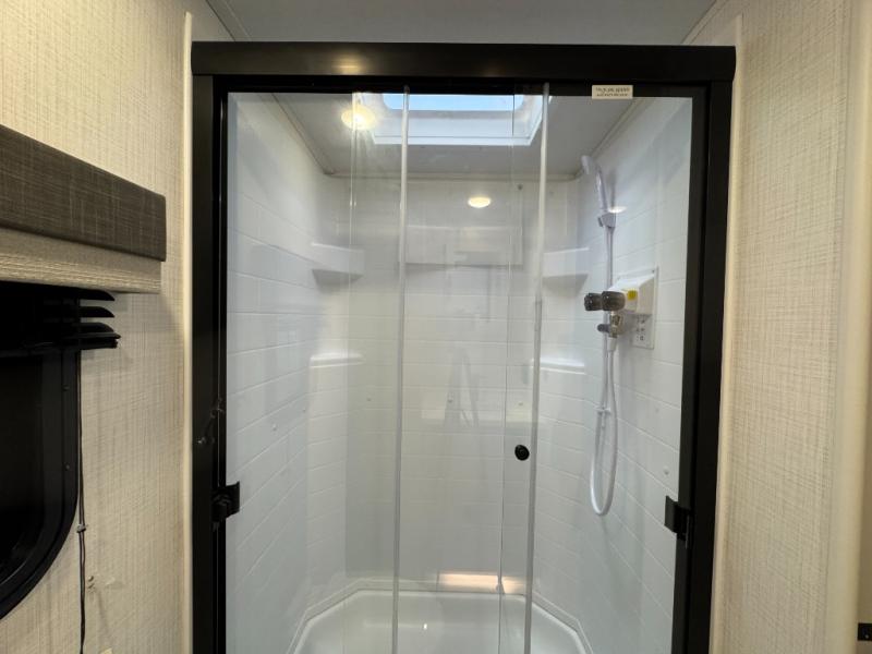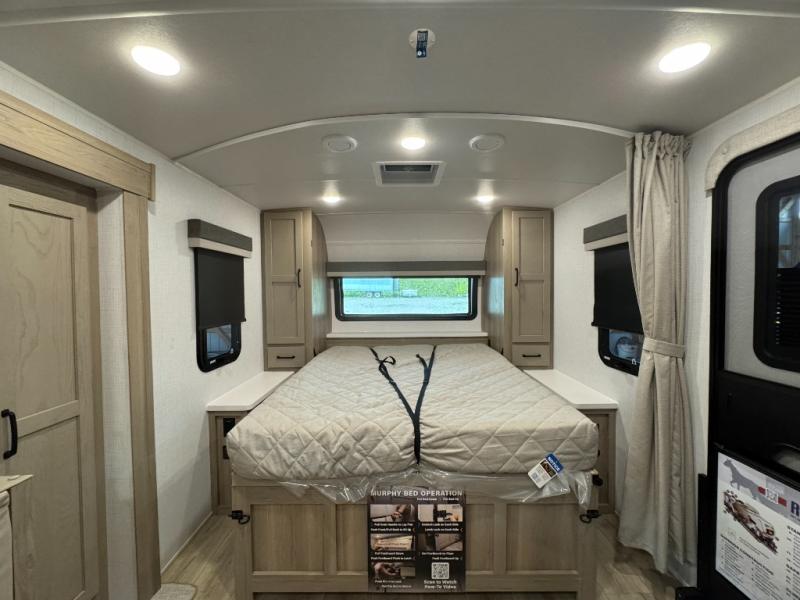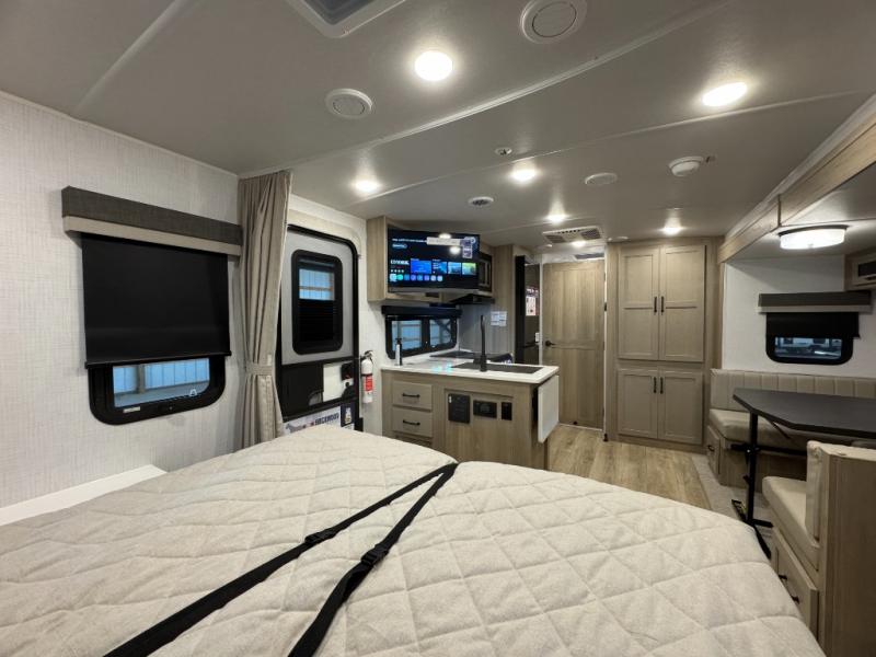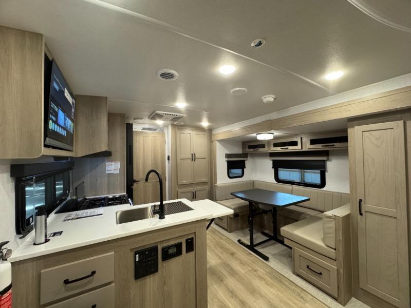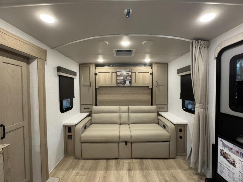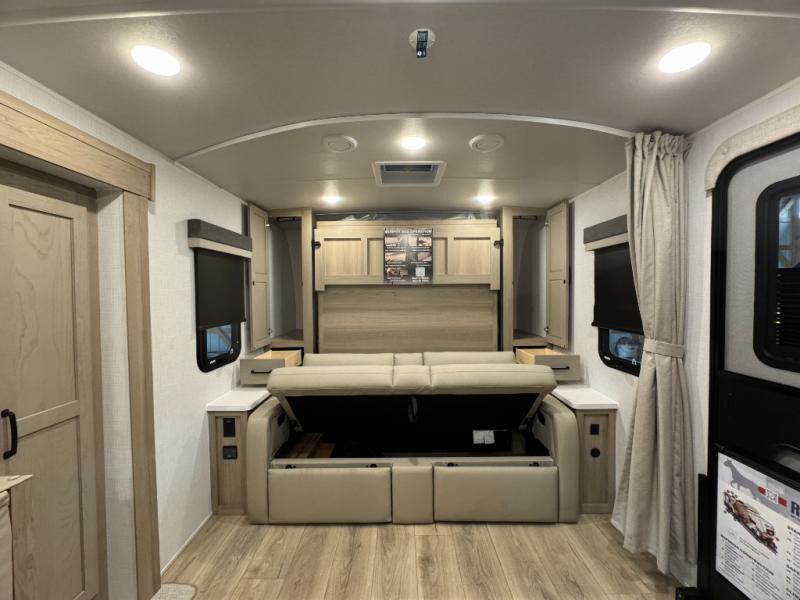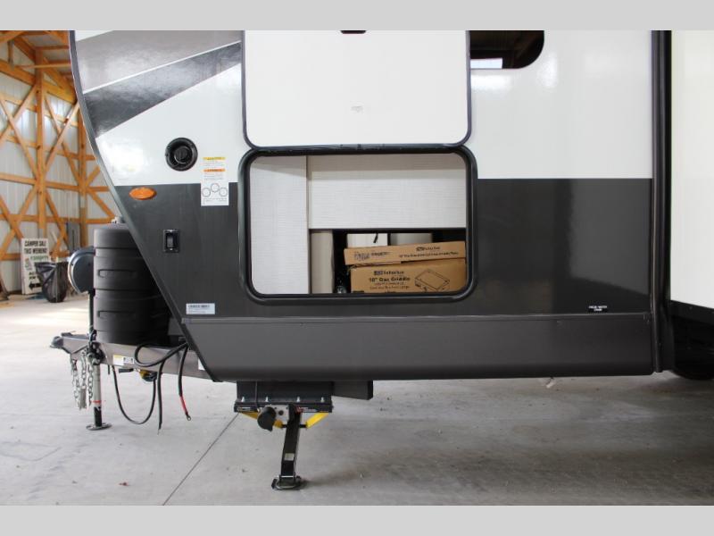 This versatile and cozy travel trailer will be perfect for weekend trips to the lake. Once you arrive at your campground, you can unload the water toys from the pass-thru storage, put out the 15' power awning, then make lunch on the exterior griddle. The U-shaped dinette slide inside will provide a place to dine, play board games, and let a guest or two sleep over, while you take the RV queen-size Murphy bed up front. In the morning, just fold up the bed to expose the 74" sofa! There is a three burner cooktop and microwave oven in the kitchen to make meals each day, along with a 12V refrigerator to keep leftovers fresh.