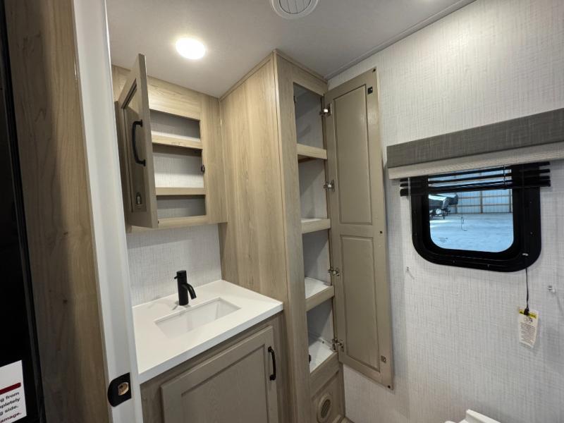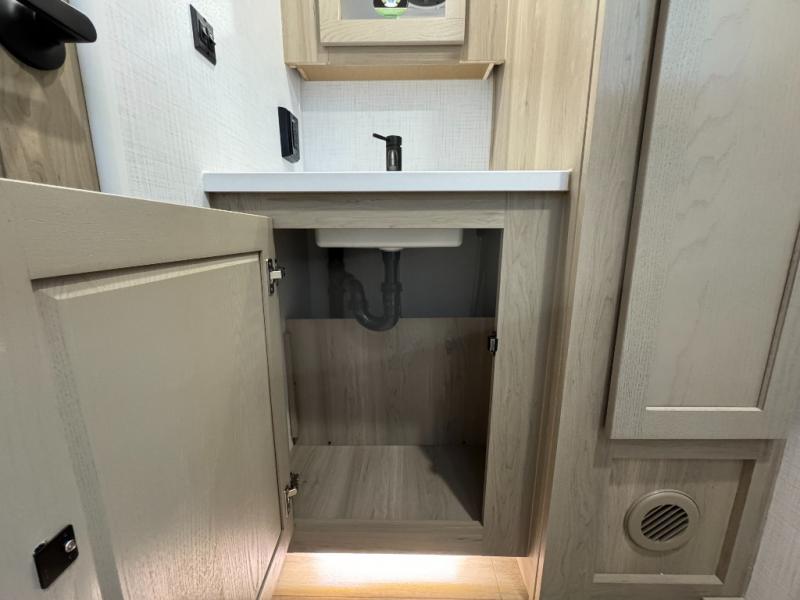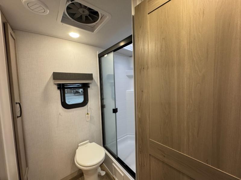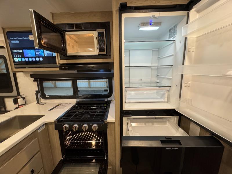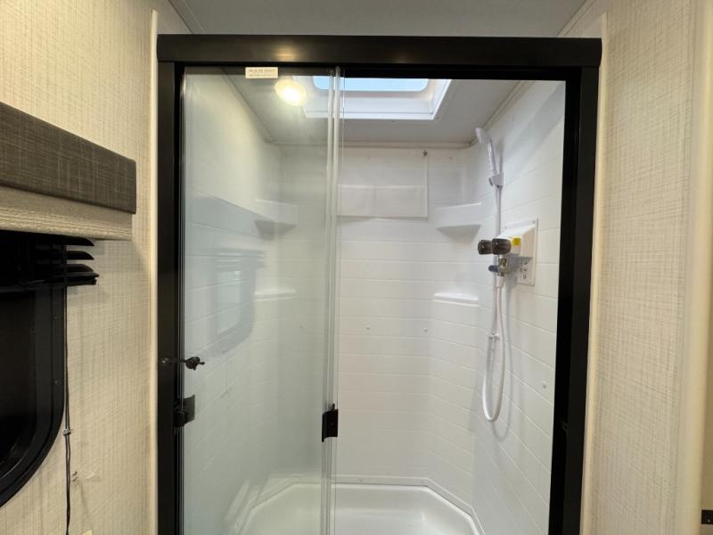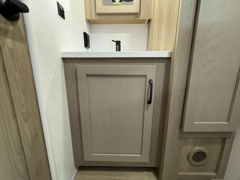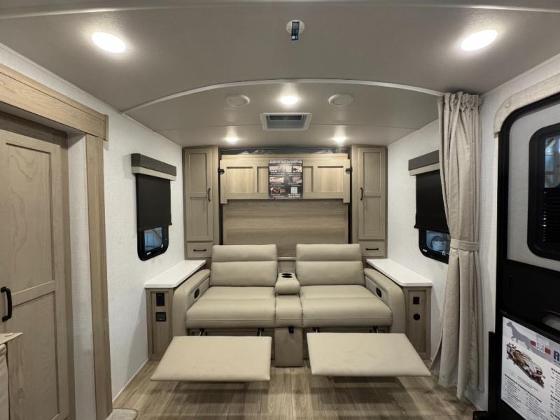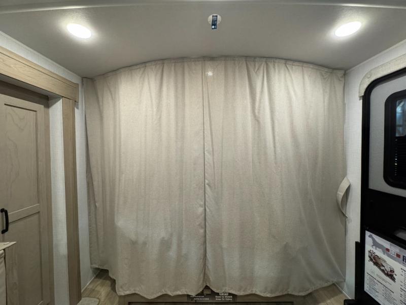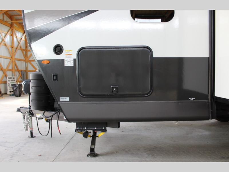 This versatile and cozy travel trailer will be perfect for weekend trips to the lake. Once you arrive at your campground, you can unload the water toys from the pass-thru storage, put out the 15' power awning, then make lunch on the exterior griddle. The U-shaped dinette slide inside will provide a place to dine, play board games, and let a guest or two sleep over, while you take the RV queen-size Murphy bed up front. In the morning, just fold up the bed to expose the 74" sofa! There is a three burner cooktop and microwave oven in the kitchen to make meals each day, along with a 12V refrigerator to keep leftovers fresh.