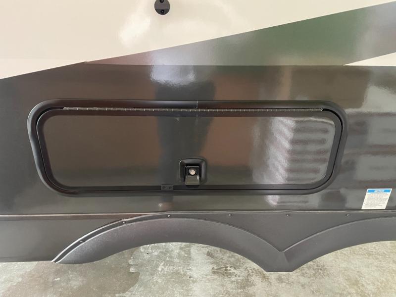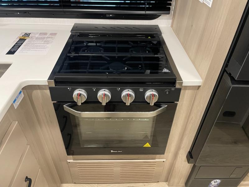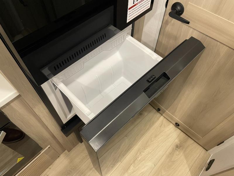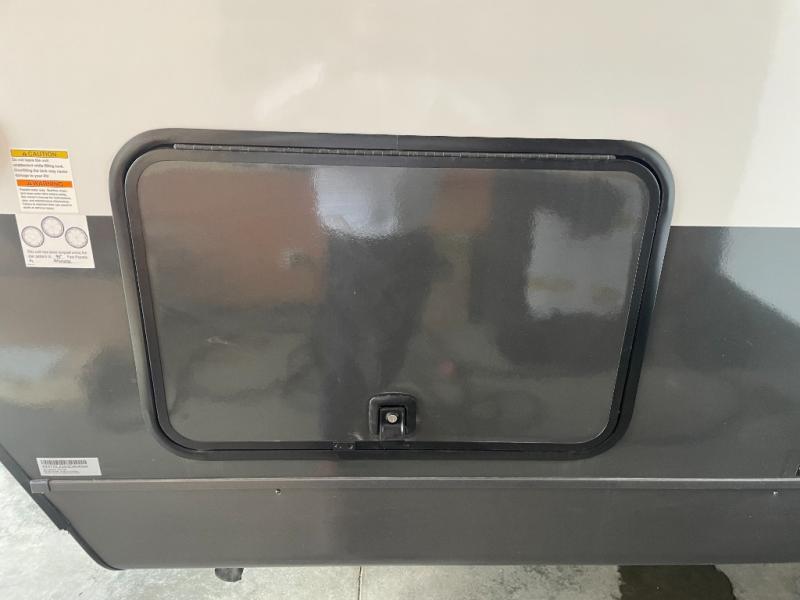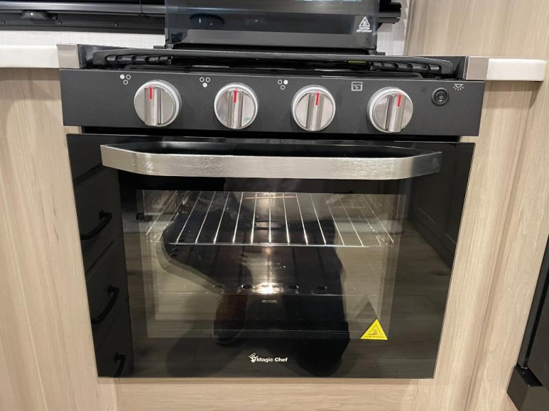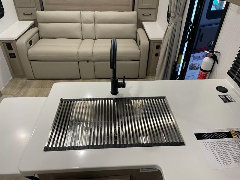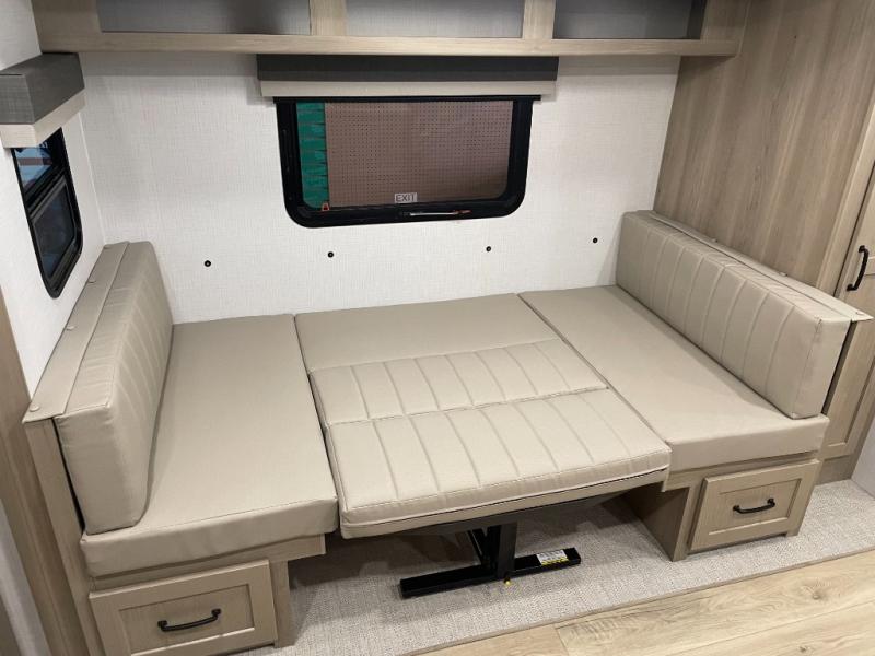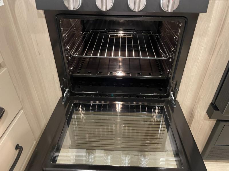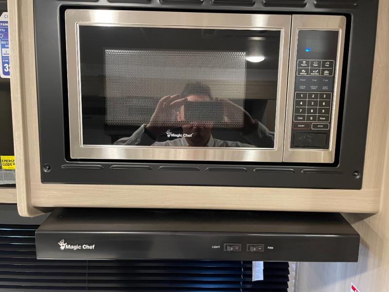 This versatile and cozy travel trailer will be perfect for weekend trips to the lake. Once you arrive at your campground, you can unload the water toys from the pass-thru storage, put out the 15' power awning, then make lunch on the exterior griddle. The U-shaped dinette slide inside will provide a place to dine, play board games, and let a guest or two sleep over, while you take the RV queen-size Murphy bed up front. In the morning, just fold up the bed to expose the 74" sofa! There is a three burner cooktop and microwave oven in the kitchen to make meals each day, along with a 12V refrigerator to keep leftovers fresh.