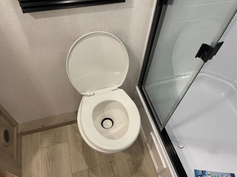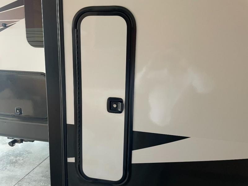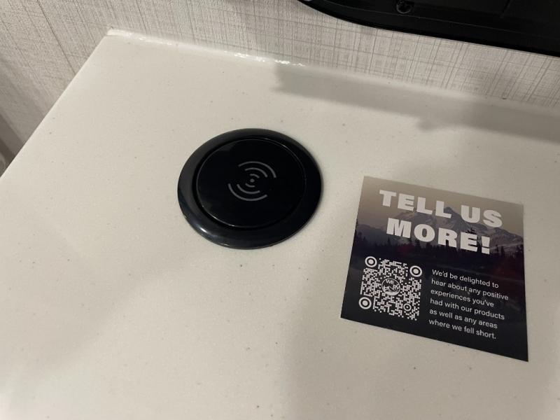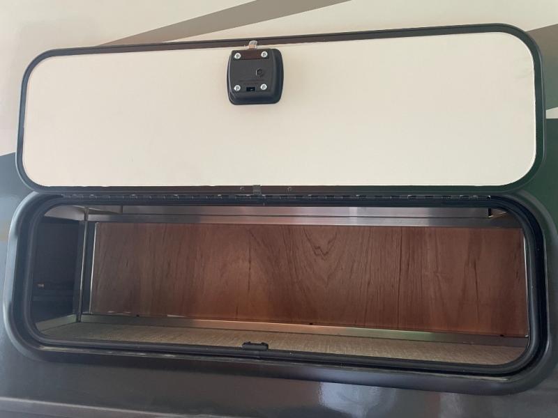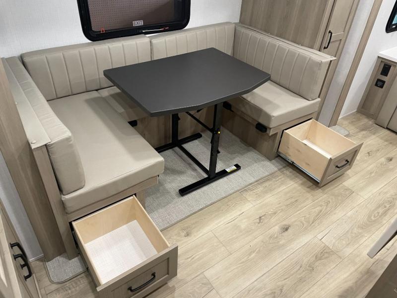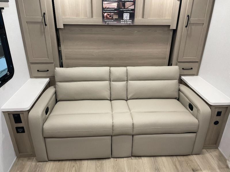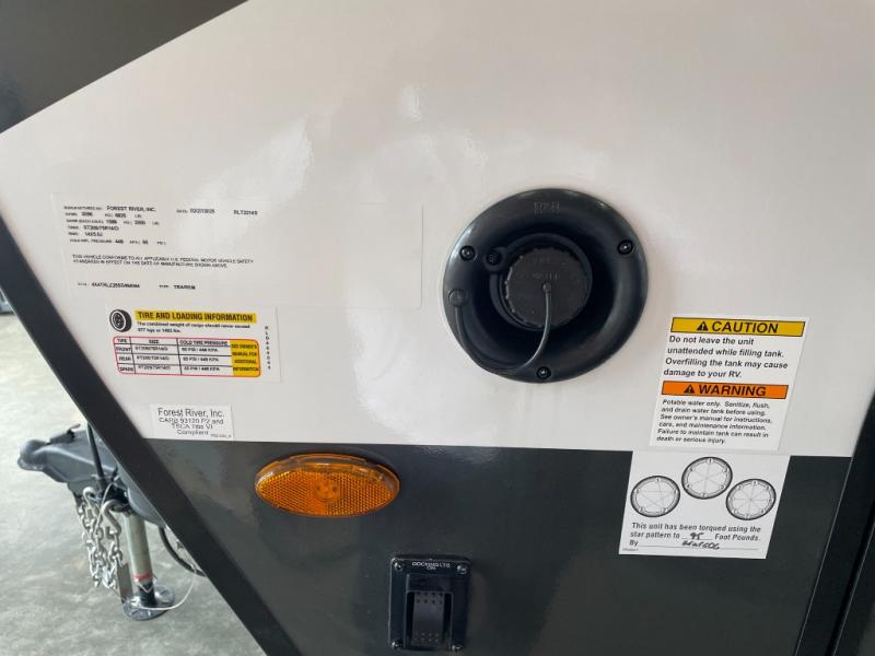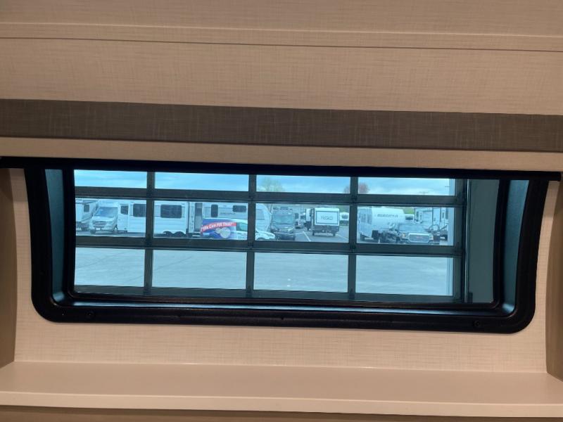 This versatile and cozy travel trailer will be perfect for weekend trips to the lake. Once you arrive at your campground, you can unload the water toys from the pass-thru storage, put out the 15' power awning, then make lunch on the exterior griddle. The U-shaped dinette slide inside will provide a place to dine, play board games, and let a guest or two sleep over, while you take the RV queen-size Murphy bed up front. In the morning, just fold up the bed to expose the 74" sofa! There is a three burner cooktop and microwave oven in the kitchen to make meals each day, along with a 12V refrigerator to keep leftovers fresh.