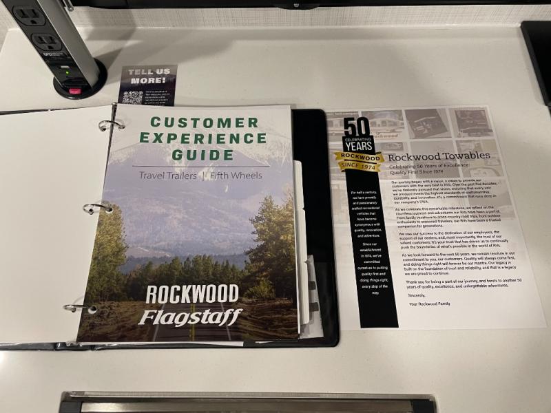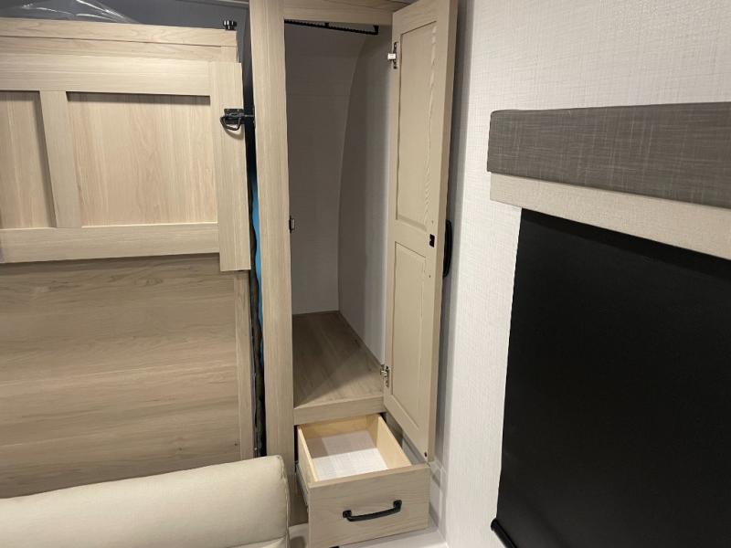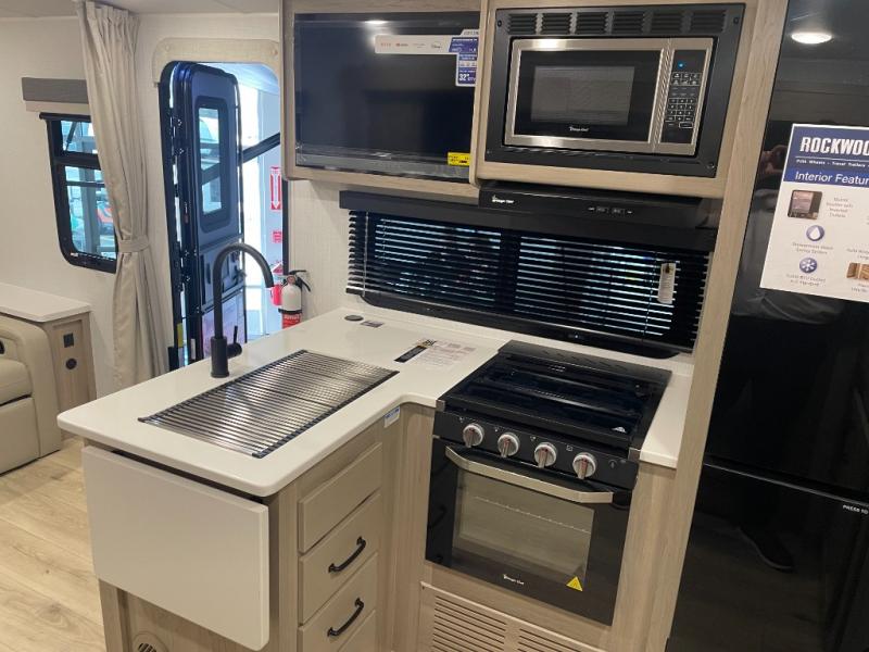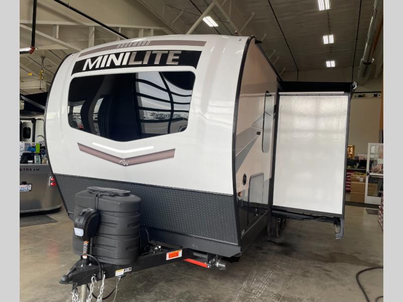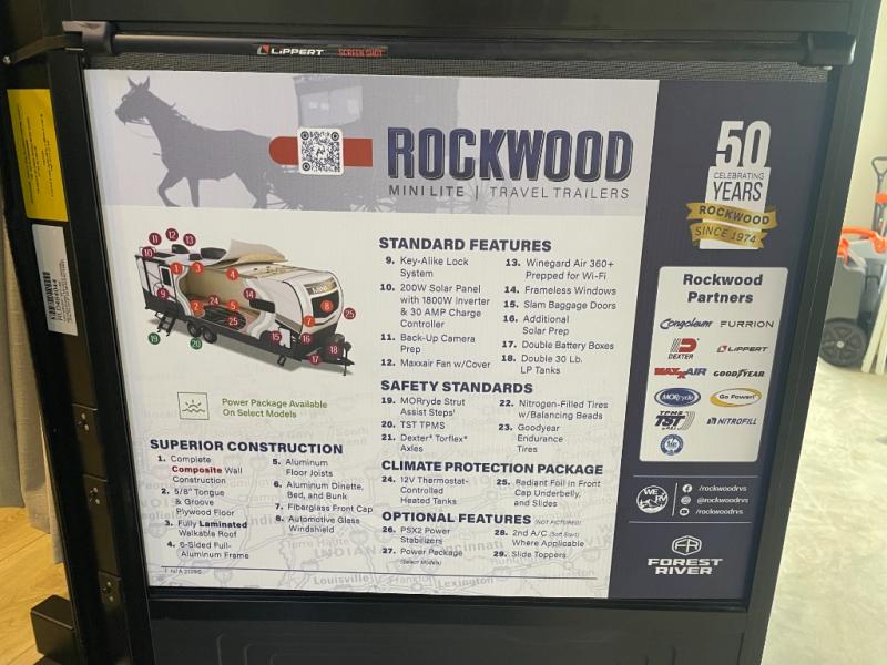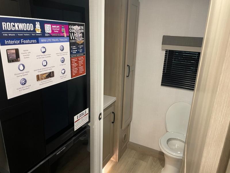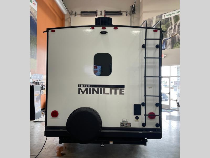 Each Rockwood Mini Lite travel trailer by Forest River is constructed with a fully laminated one-piece walkable roof, sleek frameless windows, and a six-sided full aluminum frame for strength and durability. The 12V thermostatically controlled heated tanks, plus radiant foil in the underbelly and slide out floors will allow you to camp well into the colder months, and the 200W roof solar panel will be perfect for a little off-gridding. Each model includes solid surface kitchen countertops, solid wood cabinet doors, night roller shades, plus many more interior features. Having an AIR 360+ omnidirectional antenna with WiFi prep on board gives you the option to get some work done if it's needed, and the power tongue jack provides hassle-free set up, so you can enjoy more time relaxing!