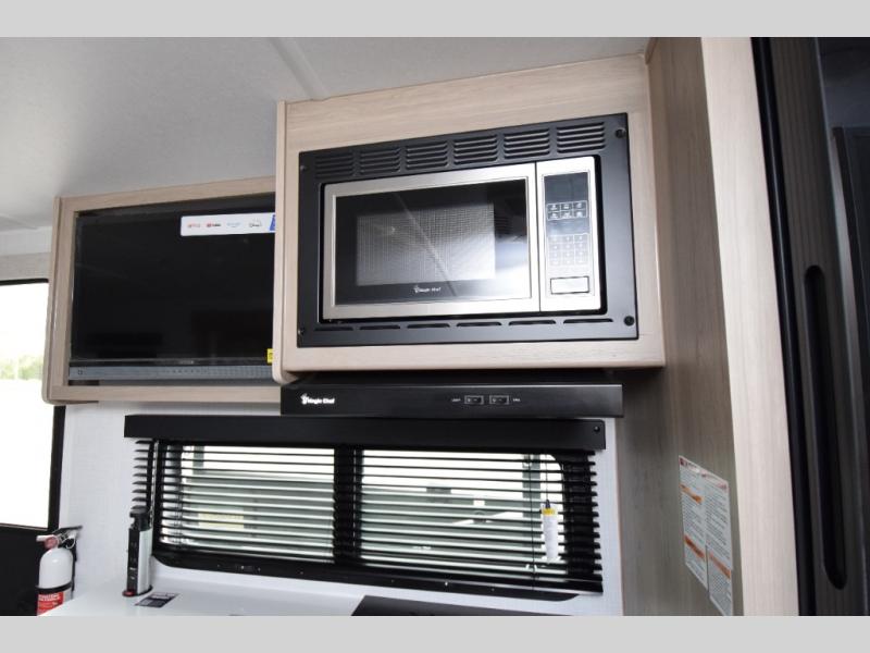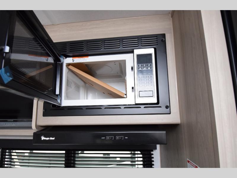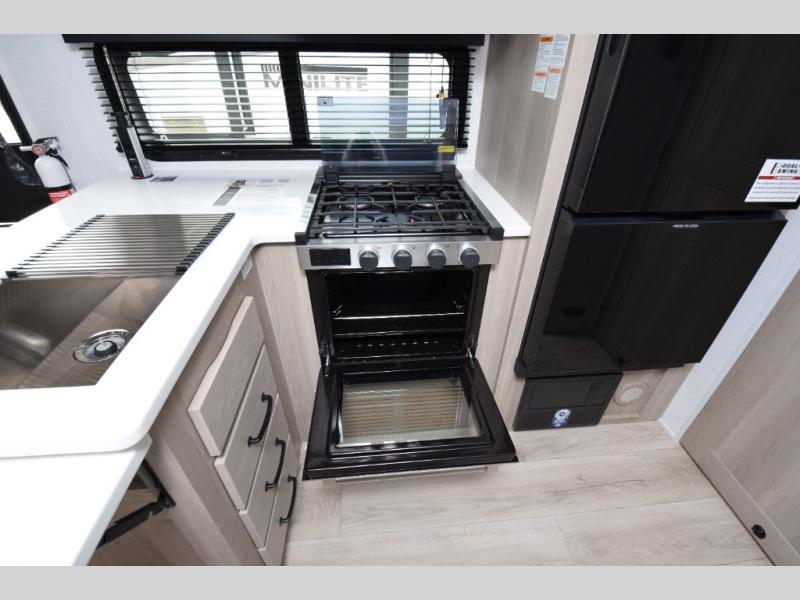 - Well-Equipped Kitchen – Includes a three-burner cooktop, microwave oven, and 12V refrigerator