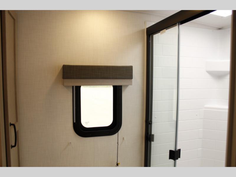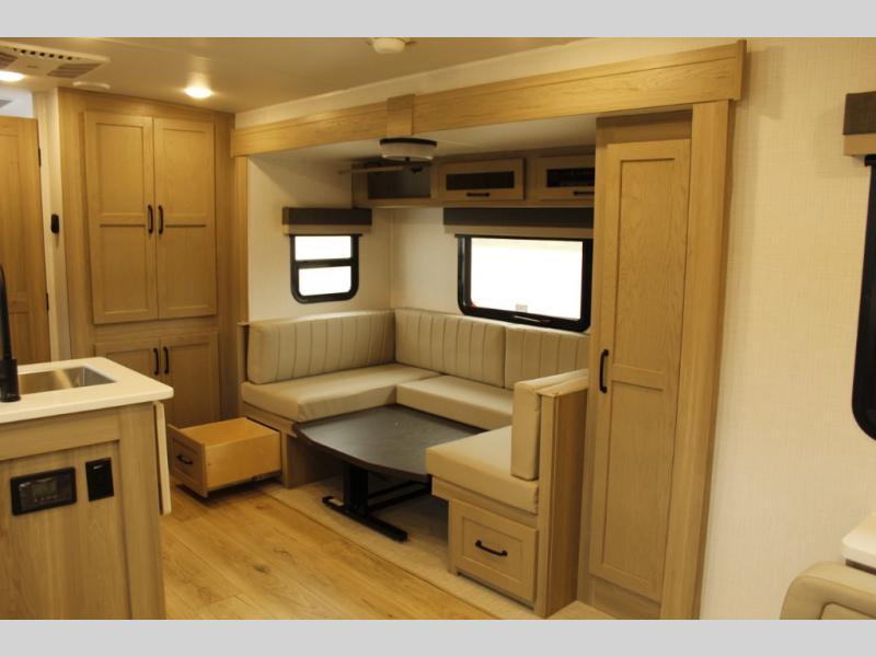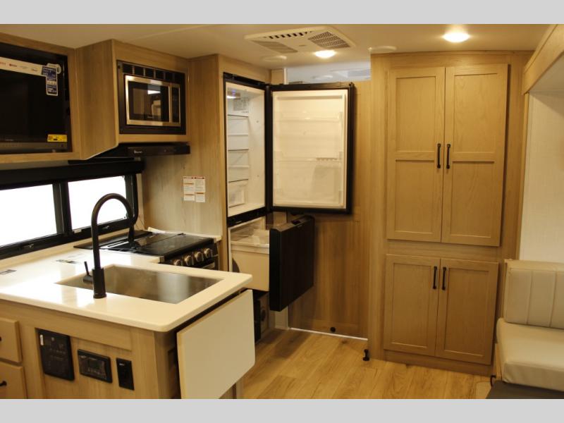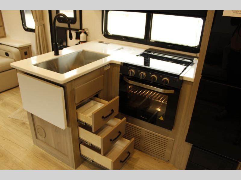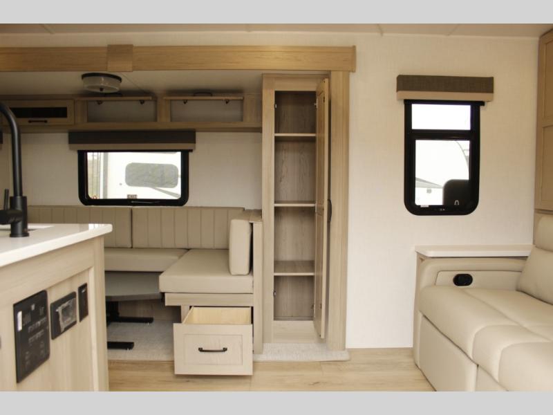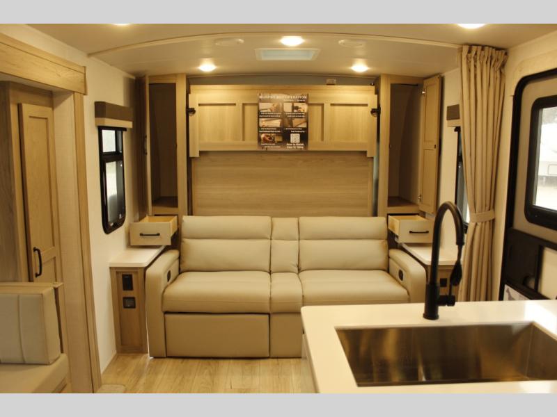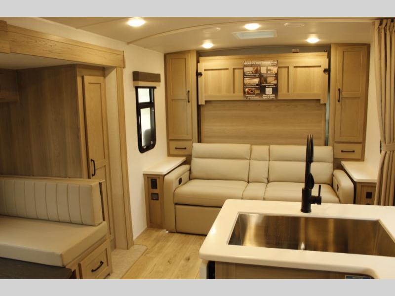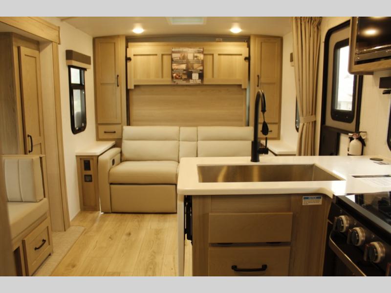 This versatile and cozy travel trailer will be perfect for weekend trips to the lake. Once you arrive at your campground, you can unload the water toys from the pass-thru storage, put out the 15' power awning, then make lunch on the exterior griddle. The U-shaped dinette slide inside will provide a place to dine, play board games, and let a guest or two sleep over, while you take the RV queen-size Murphy bed up front. In the morning, just fold up the bed to expose the 74" sofa! There is a three burner cooktop and microwave oven in the kitchen to make meals each day, along with a 12V refrigerator to keep leftovers fresh.