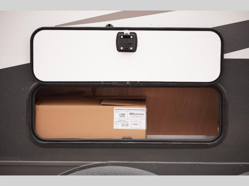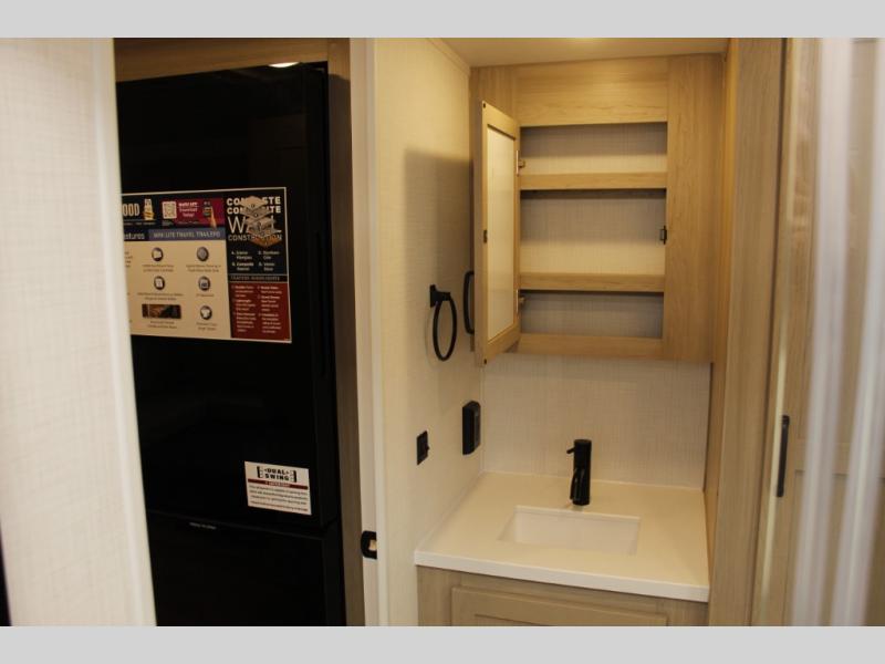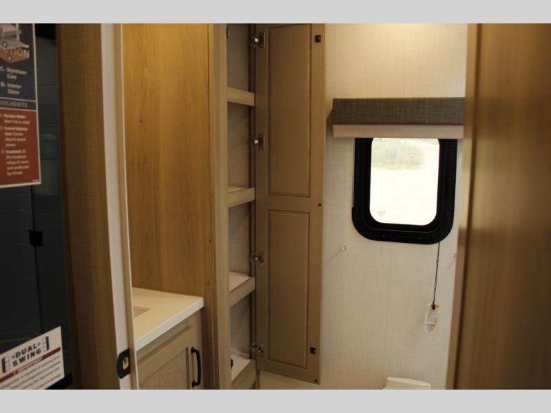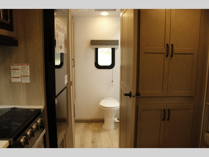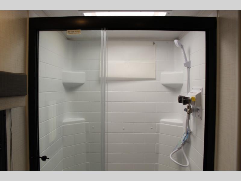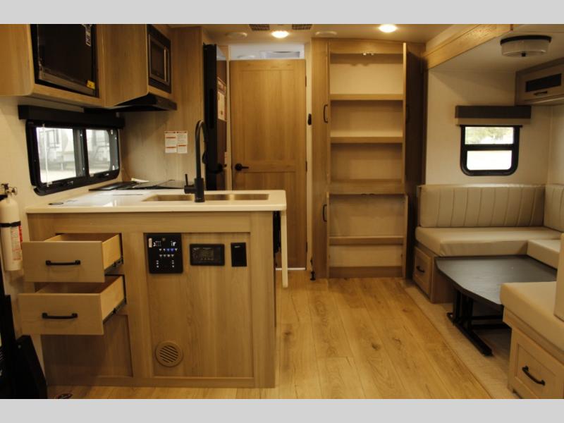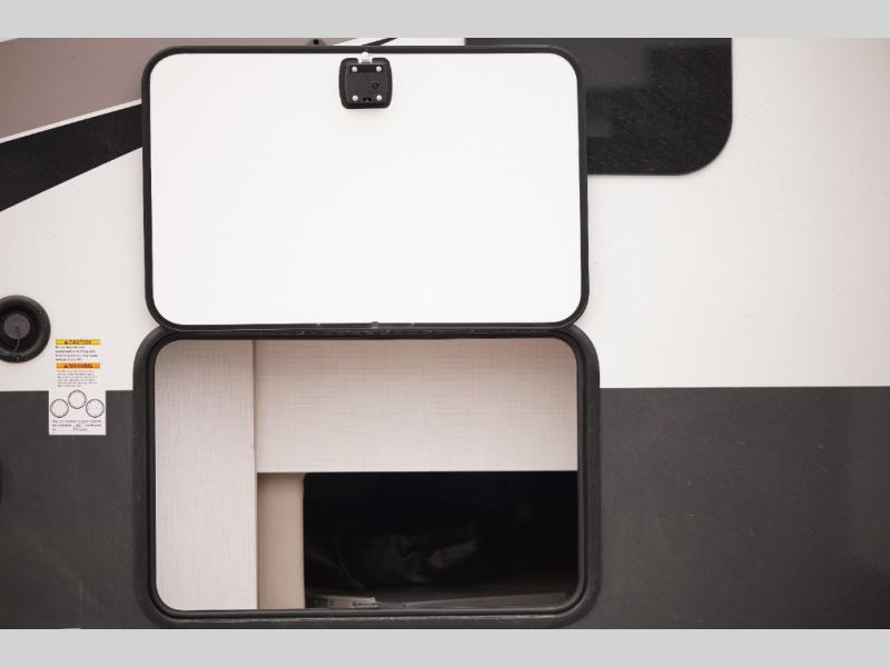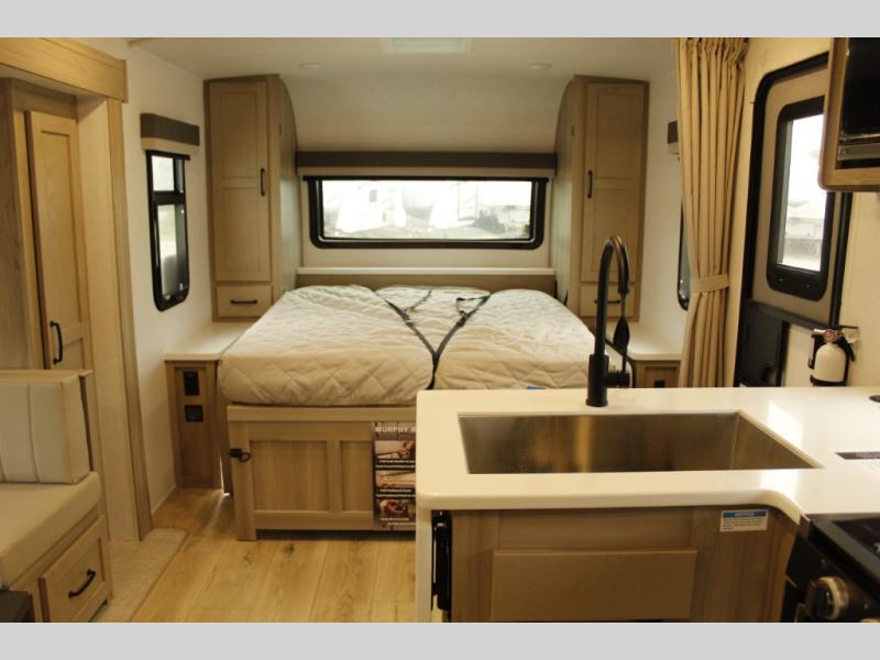 This versatile and cozy travel trailer will be perfect for weekend trips to the lake. Once you arrive at your campground, you can unload the water toys from the pass-thru storage, put out the 15' power awning, then make lunch on the exterior griddle. The U-shaped dinette slide inside will provide a place to dine, play board games, and let a guest or two sleep over, while you take the RV queen-size Murphy bed up front. In the morning, just fold up the bed to expose the 74" sofa! There is a three burner cooktop and microwave oven in the kitchen to make meals each day, along with a 12V refrigerator to keep leftovers fresh.