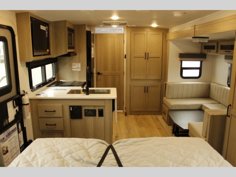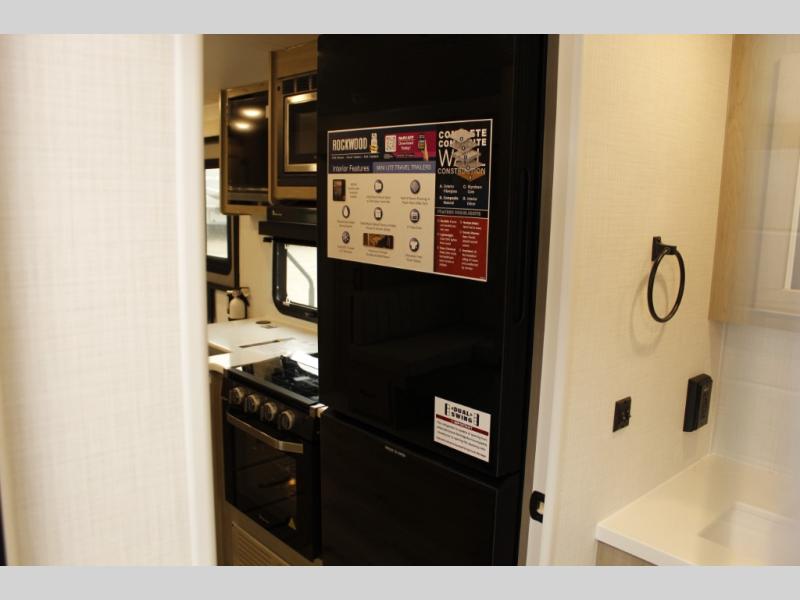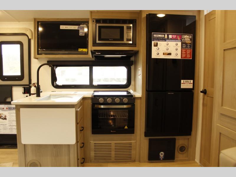 Each Rockwood Mini Lite travel trailer by Forest River is constructed with a fully laminated one-piece walkable roof, sleek frameless windows, and a six-sided full aluminum frame for strength and durability. The 12V thermostatically controlled heated tanks, plus radiant foil in the underbelly and slide out floors will allow you to camp well into the colder months, and the 200W roof solar panel will be perfect for a little off-gridding. Each model includes solid surface kitchen countertops, solid wood cabinet doors, night roller shades, plus many more interior features. Having an AIR 360+ omnidirectional antenna with WiFi prep on board gives you the option to get some work done if it's needed, and the power tongue jack provides hassle-free set up, so you can enjoy more time relaxing!
