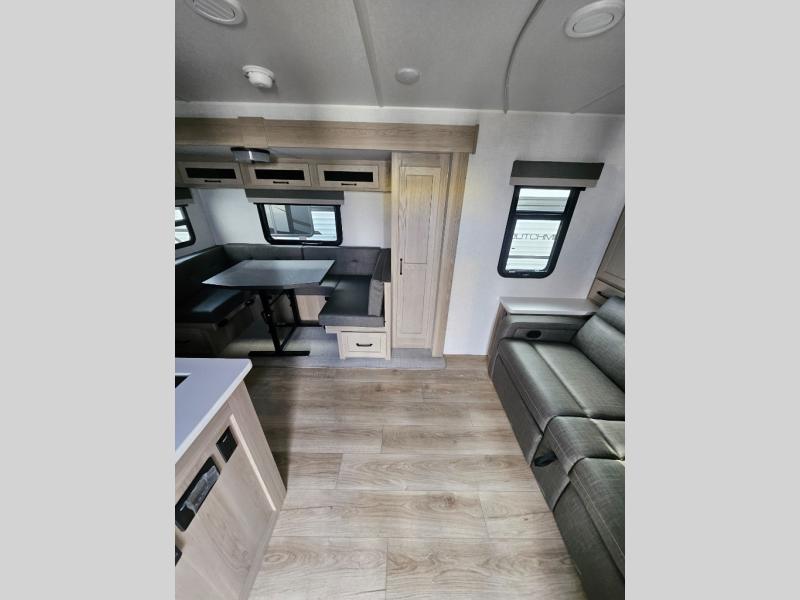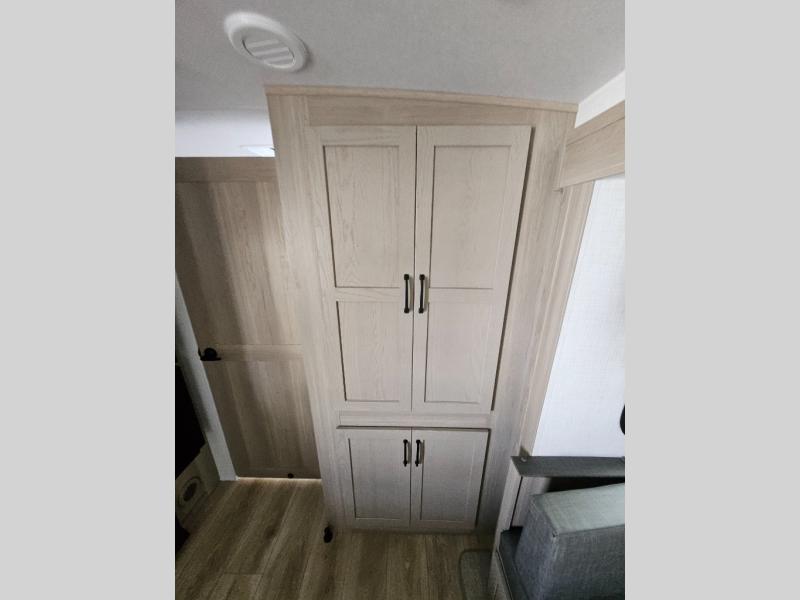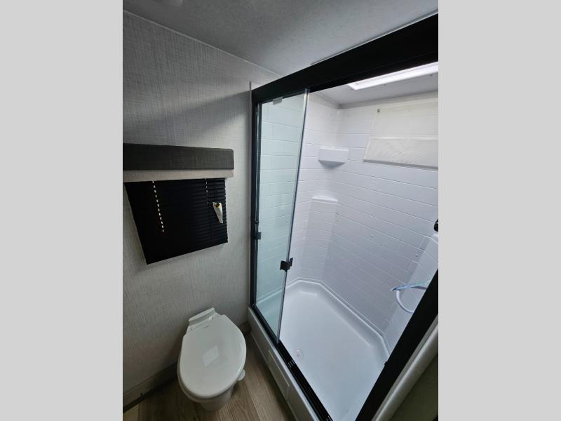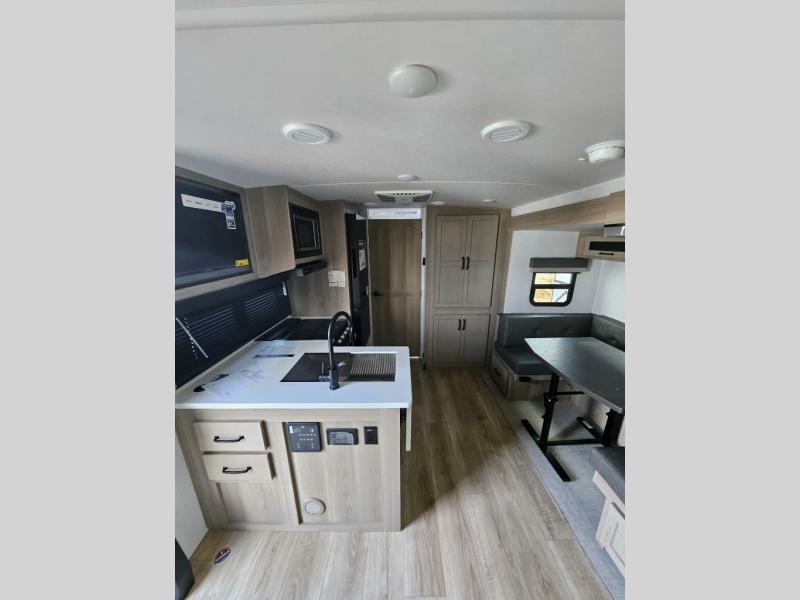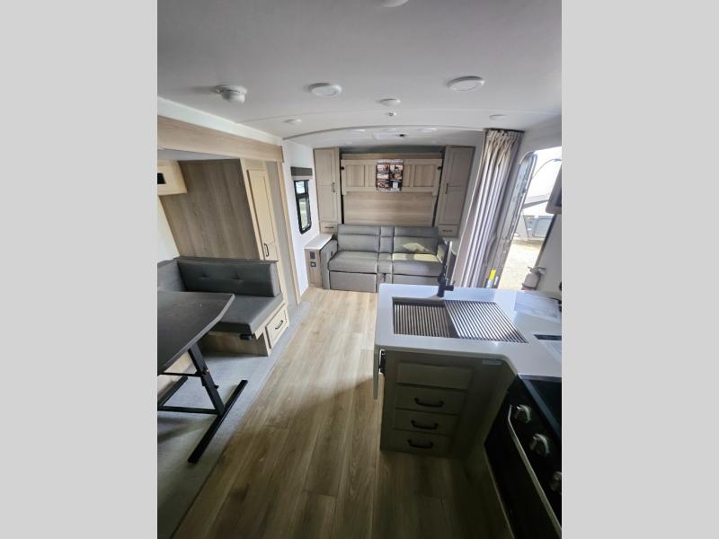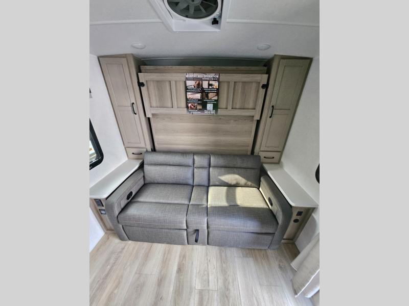 This versatile and cozy travel trailer will be perfect for weekend trips to the lake. Once you arrive at your campground, you can unload the water toys from the pass-thru storage, put out the 15' power awning, then make lunch on the exterior griddle. The U-shaped dinette slide inside will provide a place to dine, play board games, and let a guest or two sleep over, while you take the RV queen-size Murphy bed up front. In the morning, just fold up the bed to expose the 74" sofa! There is a three burner cooktop and microwave oven in the kitchen to make meals each day, along with a 12V refrigerator to keep leftovers fresh.