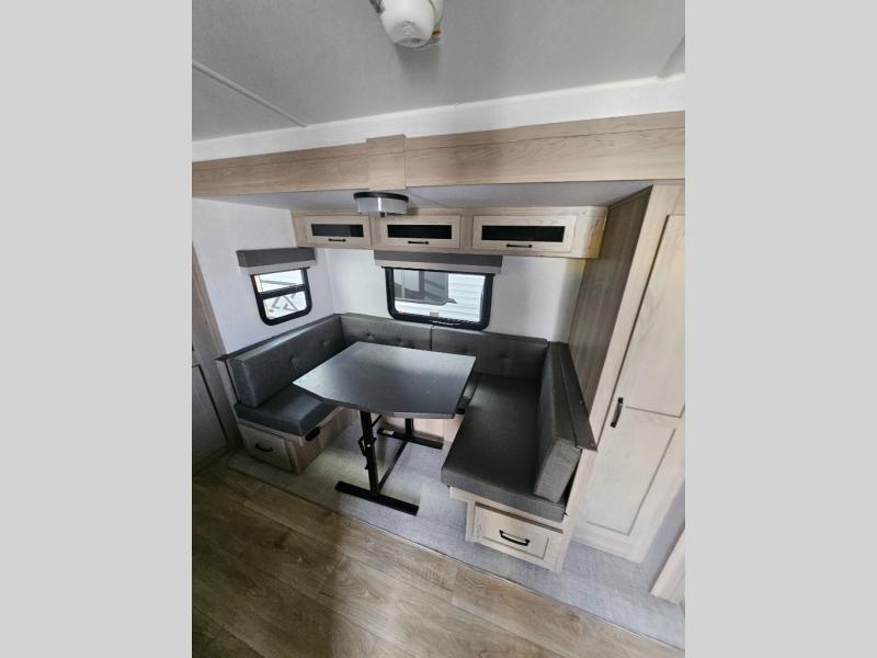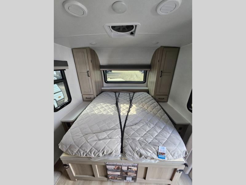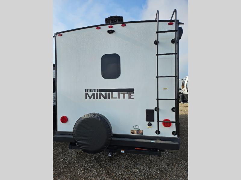 Each Rockwood Mini Lite travel trailer by Forest River is constructed with a fully laminated one-piece walkable roof, sleek frameless windows, and a six-sided full aluminum frame for strength and durability. The 12V thermostatically controlled heated tanks, plus radiant foil in the underbelly and slide out floors will allow you to camp well into the colder months, and the 200W roof solar panel will be perfect for a little off-gridding. Each model includes solid surface kitchen countertops, solid wood cabinet doors, night roller shades, plus many more interior features. Having an AIR 360+ omnidirectional antenna with WiFi prep on board gives you the option to get some work done if it's needed, and the power tongue jack provides hassle-free set up, so you can enjoy more time relaxing!