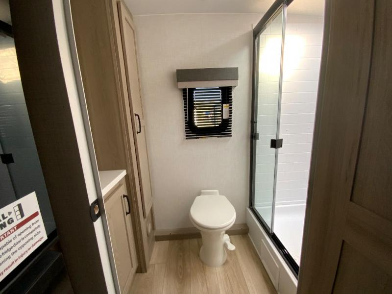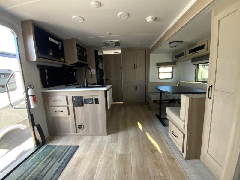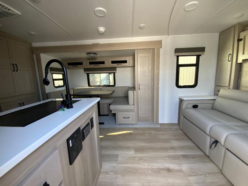 This versatile and cozy travel trailer will be perfect for weekend trips to the lake. Once you arrive at your campground, you can unload the water toys from the pass-thru storage, put out the 15' power awning, then make lunch on the exterior griddle. The U-shaped dinette slide inside will provide a place to dine, play board games, and let a guest or two sleep over, while you take the RV queen-size Murphy bed up front. In the morning, just fold up the bed to expose the 74" sofa! There is a three burner cooktop and microwave oven in the kitchen to make meals each day, along with a 12V refrigerator to keep leftovers fresh.