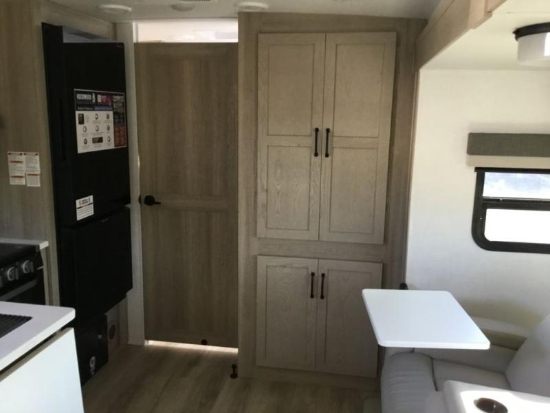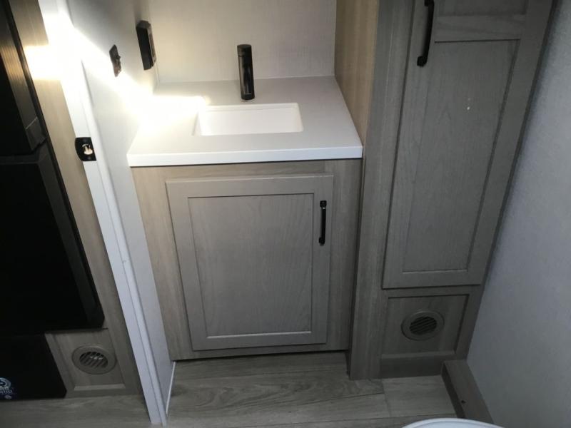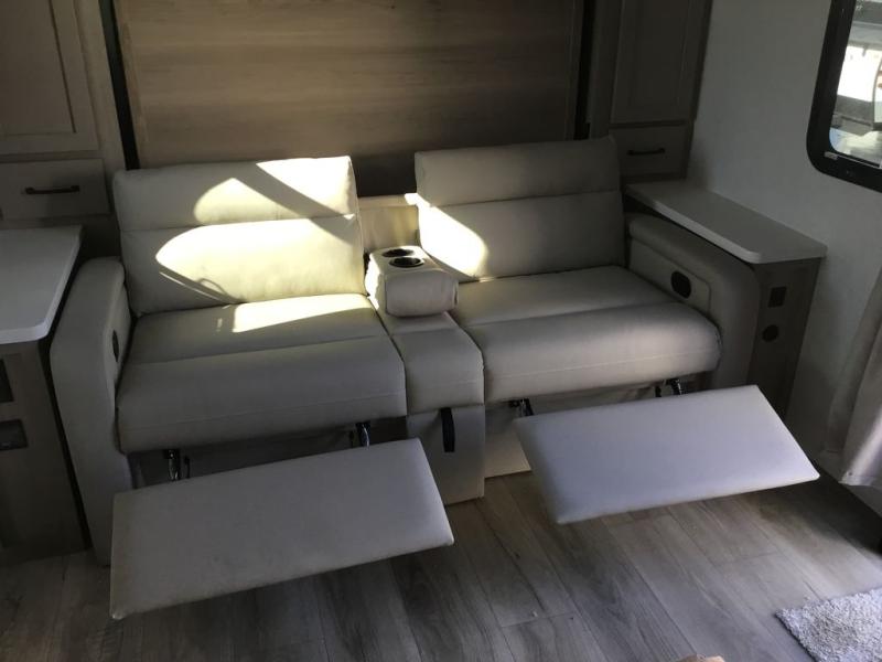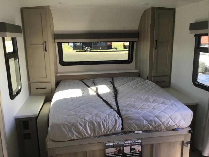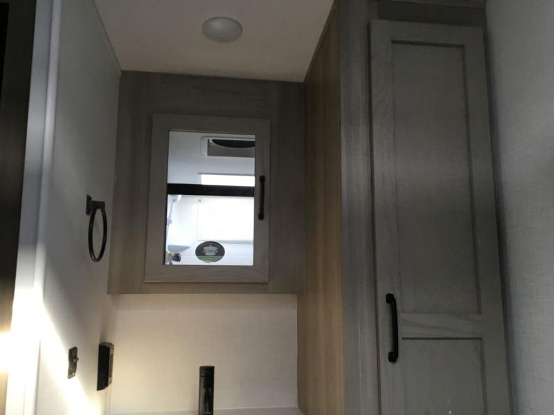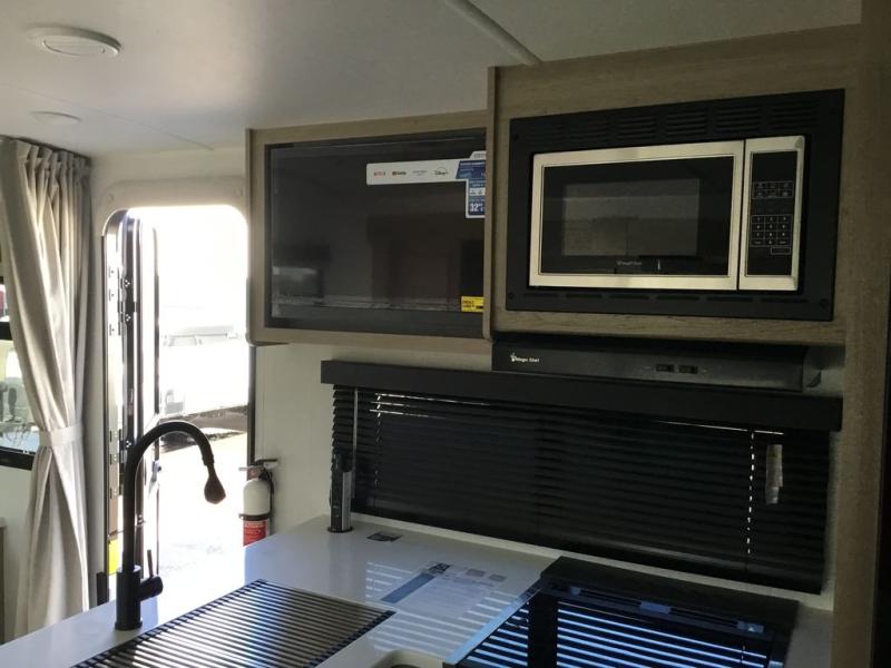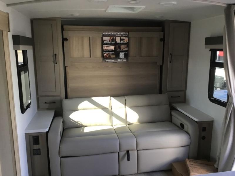 This versatile and cozy travel trailer will be perfect for weekend trips to the lake. Once you arrive at your campground, you can unload the water toys from the pass-thru storage, put out the 15' power awning, then make lunch on the exterior griddle. The U-shaped dinette slide inside will provide a place to dine, play board games, and let a guest or two sleep over, while you take the RV queen-size Murphy bed up front. In the morning, just fold up the bed to expose the 74" sofa! There is a three burner cooktop and microwave oven in the kitchen to make meals each day, along with a 12V refrigerator to keep leftovers fresh.