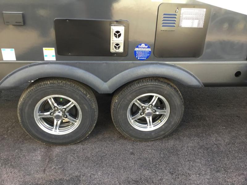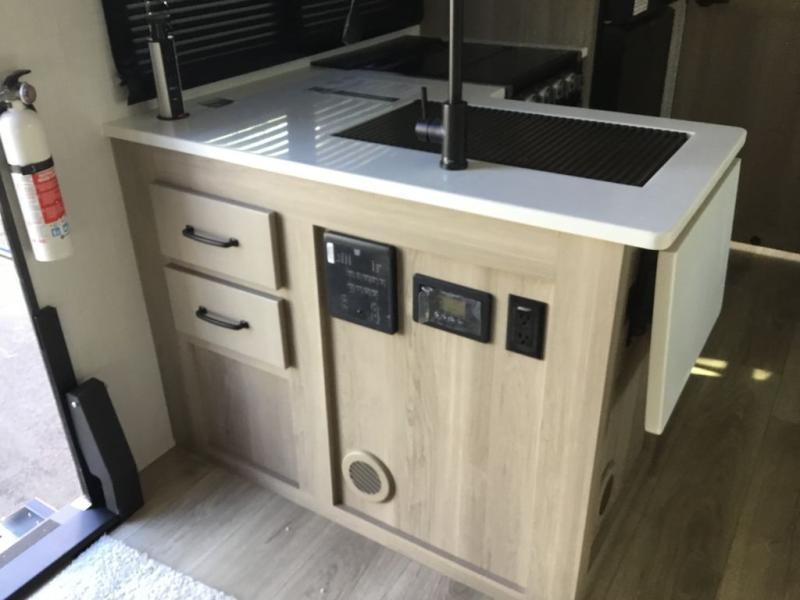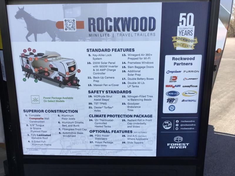 Each Rockwood Mini Lite travel trailer by Forest River is constructed with a fully laminated one-piece walkable roof, sleek frameless windows, and a six-sided full aluminum frame for strength and durability. The 12V thermostatically controlled heated tanks, plus radiant foil in the underbelly and slide out floors will allow you to camp well into the colder months, and the 200W roof solar panel will be perfect for a little off-gridding. Each model includes solid surface kitchen countertops, solid wood cabinet doors, night roller shades, plus many more interior features. Having an AIR 360+ omnidirectional antenna with WiFi prep on board gives you the option to get some work done if it's needed, and the power tongue jack provides hassle-free set up, so you can enjoy more time relaxing!