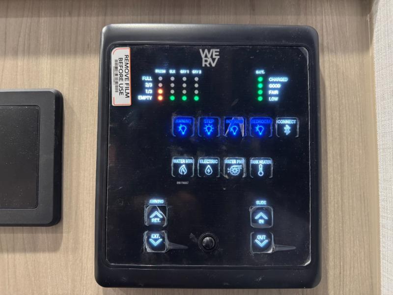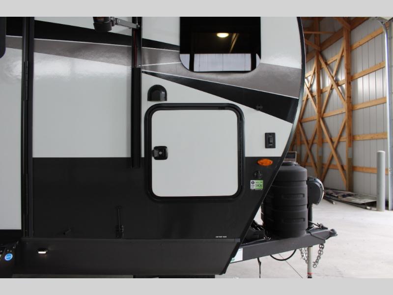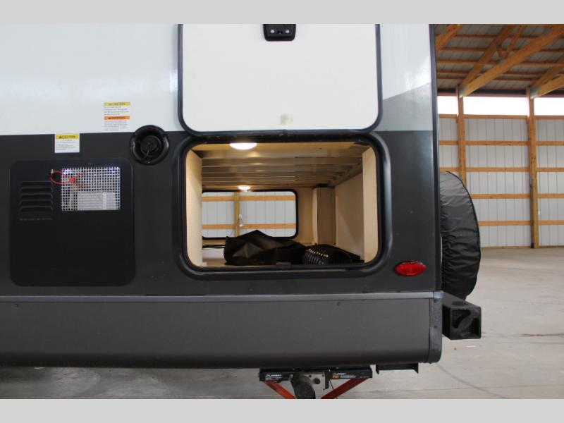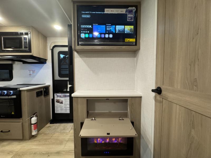 If you like the front kitchen layout, you're going to love this one! You'll have plenty of counter space to prepare and cook meals, or you may just want to head outdoors to cook on the outside griddle. There is a 19' power awning with LED lights to keep you protected from the sun and rain, and there are three exterior storage compartments for lawn chairs, fishing poles, and firewood! This model includes a U-shaped dinette slide in perfect view of the 12V smart entertainment TV and fireplace, and this area can double as your guests' sleeping space at night. You'll stay comfortable in the rear bedroom that includes an RV queen bed, dual bedroom wardrobes, and an optional TV if you enjoy movies in bed!