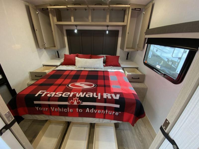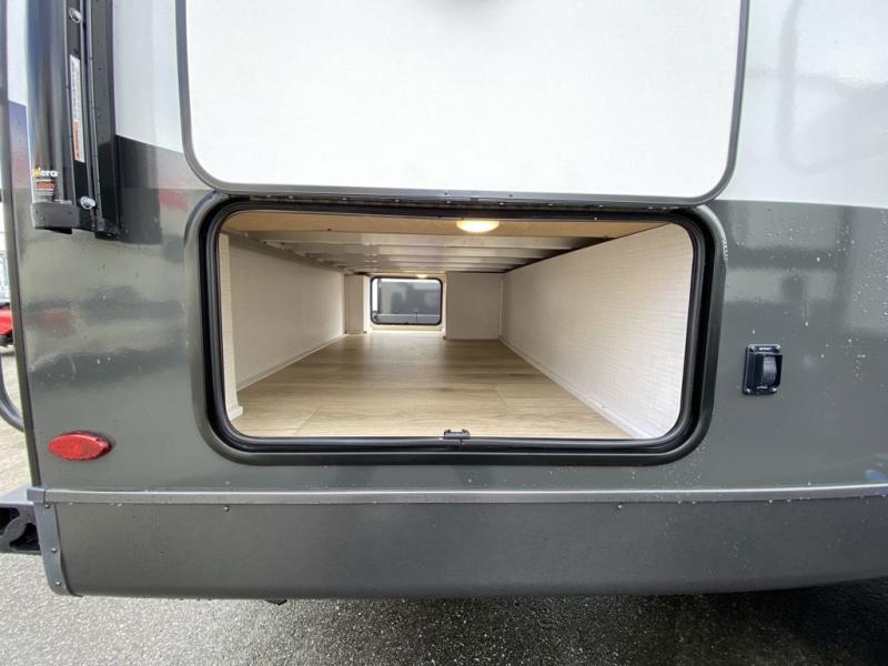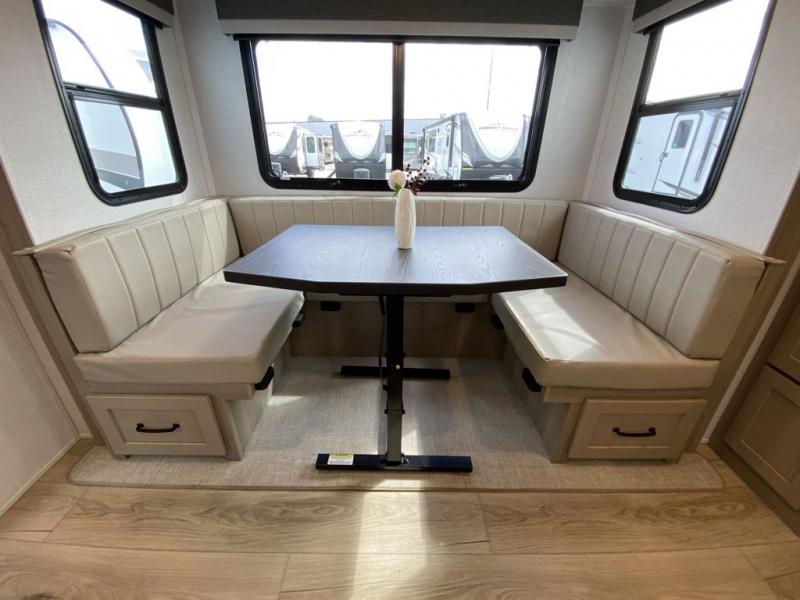 If you like the front kitchen layout, you're going to love this one! You'll have plenty of counter space to prepare and cook meals, or you may just want to head outdoors to cook on the outside griddle. There is a 19' power awning with LED lights to keep you protected from the sun and rain, and there are three exterior storage compartments for lawn chairs, fishing poles, and firewood! This model includes a U-shaped dinette slide in perfect view of the 12V smart entertainment TV and fireplace, and this area can double as your guests' sleeping space at night. You'll stay comfortable in the rear bedroom that includes an RV queen bed, dual bedroom wardrobes, and an optional TV if you enjoy movies in bed!