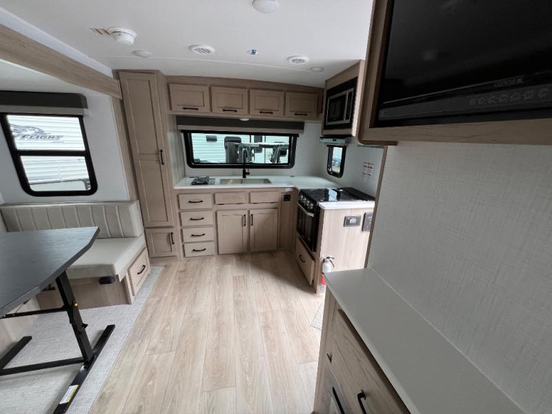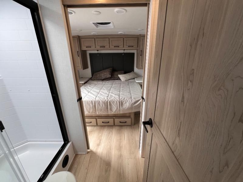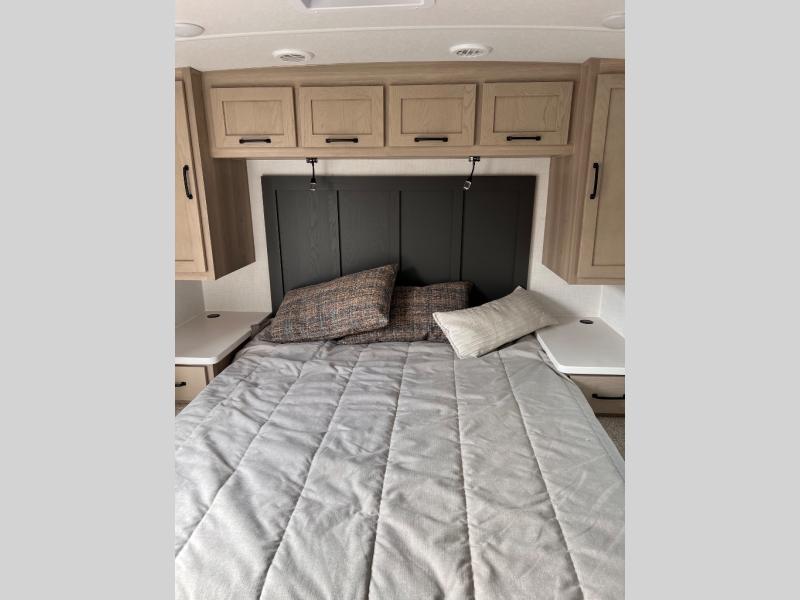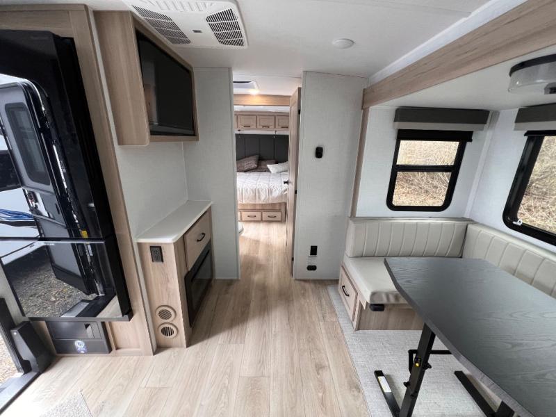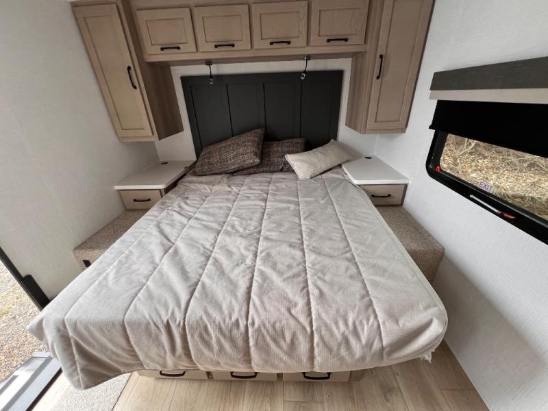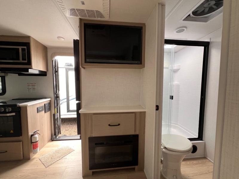If you like the front kitchen layout, you're going to love this one! You'll have plenty of counter space to prepare and cook meals, or you may just want to head outdoors to cook on the outside griddle. There is a 19' power awning with LED lights to keep you protected from the sun and rain, and there are three exterior storage compartments for lawn chairs, fishing poles, and firewood! This model includes a U-shaped dinette slide in perfect view of the 12V smart entertainment TV and fireplace, and this area can double as your guests' sleeping space at night. You'll stay comfortable in the rear bedroom that includes an RV queen bed, dual bedroom wardrobes, and an optional TV if you enjoy movies in bed!