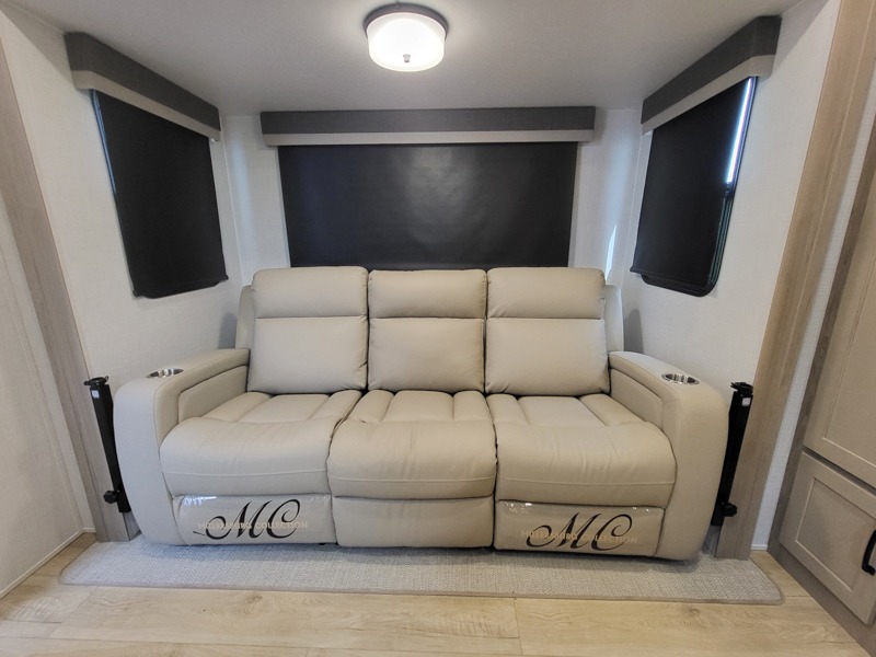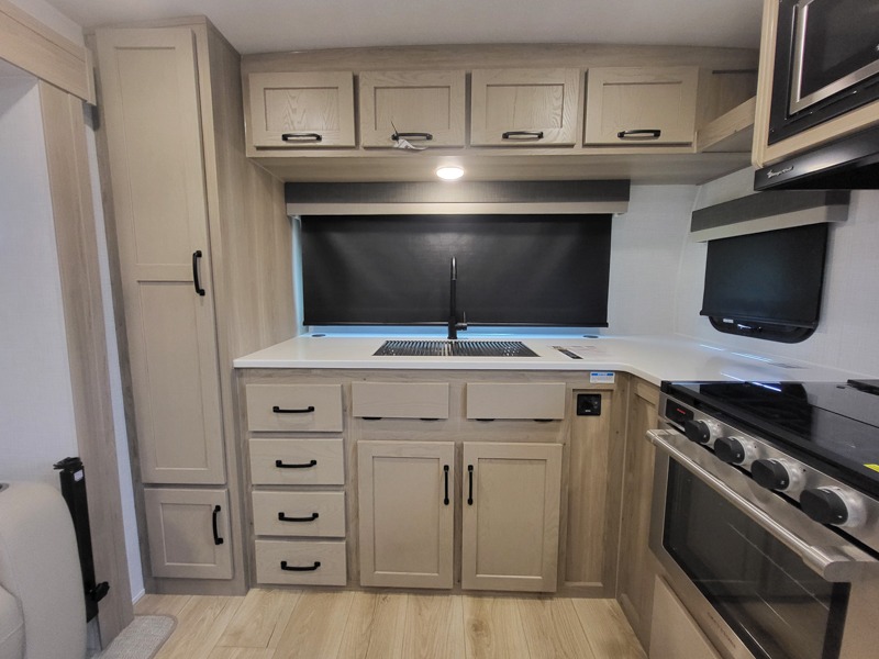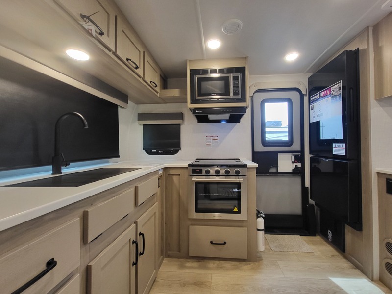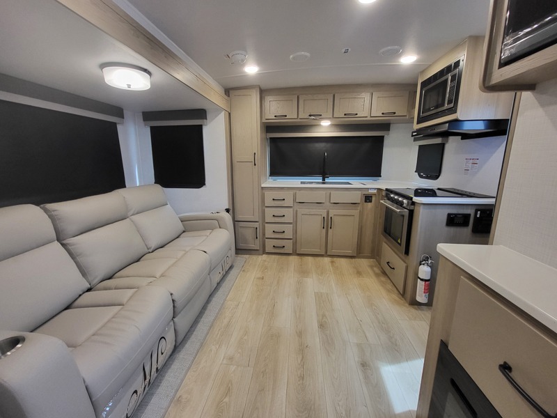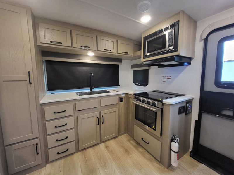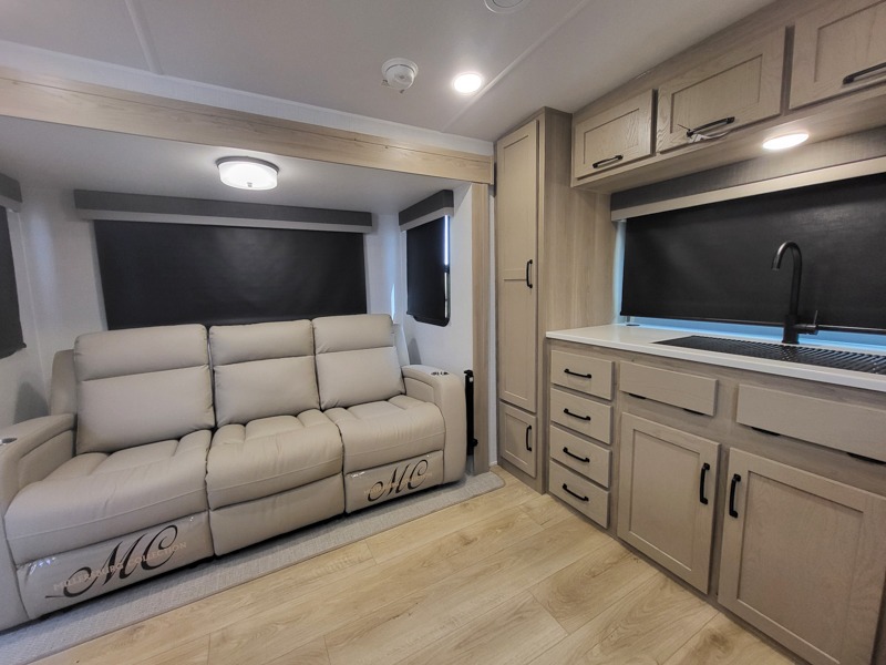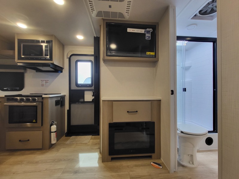 If you like the front kitchen layout, you're going to love this one! You'll have plenty of counter space to prepare and cook meals, or you may just want to head outdoors to cook on the outside griddle. There is a 19' power awning with LED lights to keep you protected from the sun and rain, and there are three exterior storage compartments for lawn chairs, fishing poles, and firewood! This model includes a U-shaped dinette slide in perfect view of the 12V smart entertainment TV and fireplace, and this area can double as your guests' sleeping space at night. You'll stay comfortable in the rear bedroom that includes an RV queen bed, dual bedroom wardrobes, and an optional TV if you enjoy movies in bed!