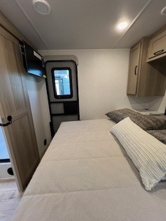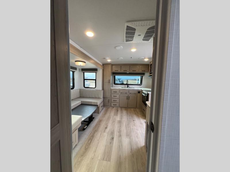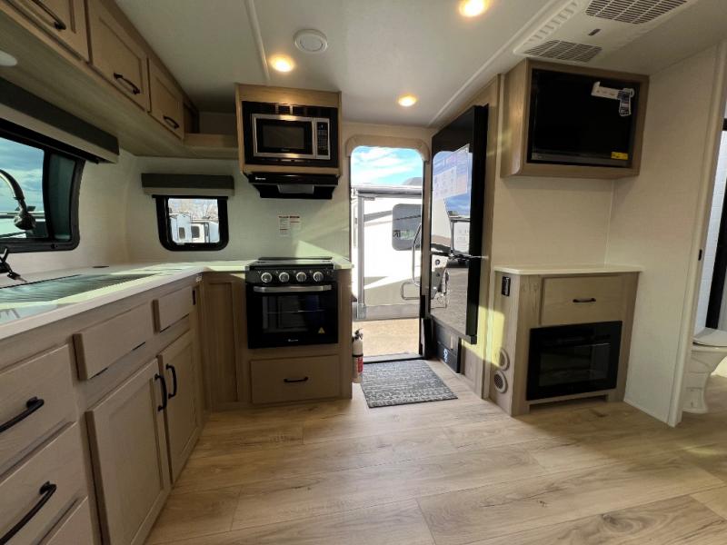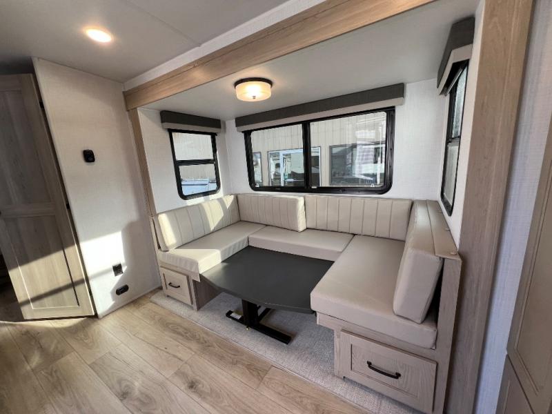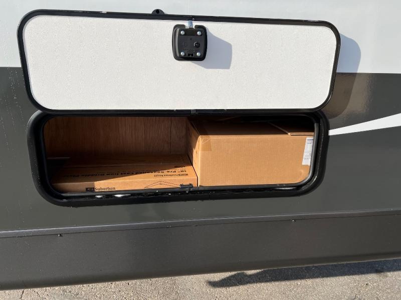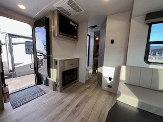 If you like the front kitchen layout, you're going to love this one! You'll have plenty of counter space to prepare and cook meals, or you may just want to head outdoors to cook on the outside griddle. There is a 19' power awning with LED lights to keep you protected from the sun and rain, and there are three exterior storage compartments for lawn chairs, fishing poles, and firewood! This model includes a U-shaped dinette slide in perfect view of the 12V smart entertainment TV and fireplace, and this area can double as your guests' sleeping space at night. You'll stay comfortable in the rear bedroom that includes an RV queen bed, dual bedroom wardrobes, and an optional TV if you enjoy movies in bed!