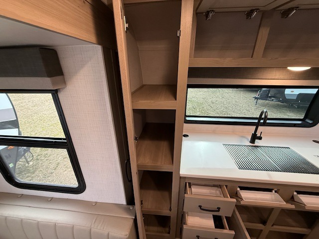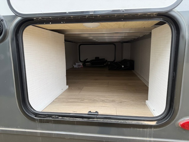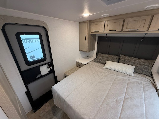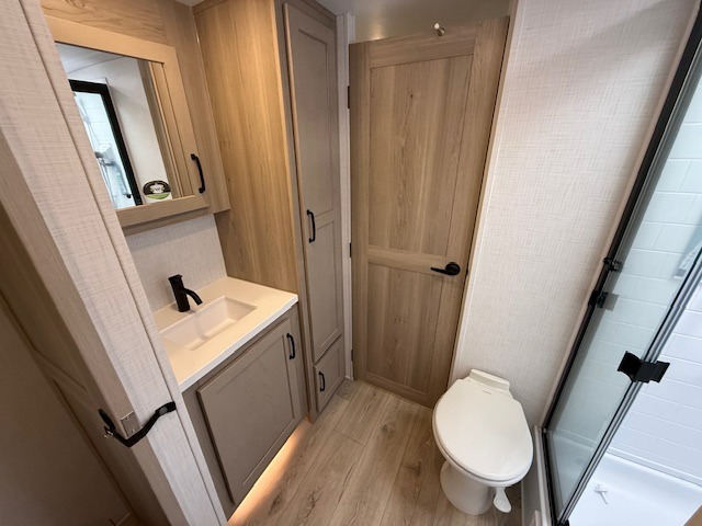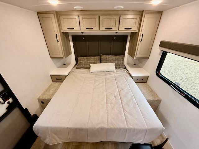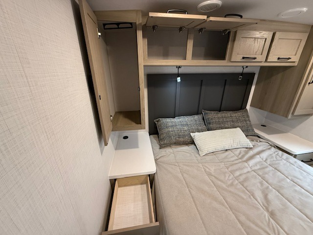 At the end of the day, retreat to your private rear bedroom featuring an RV queen bed, dual wardrobes, and the option to add a second TV for movie nights. The walk-through bath provides convenient access from both the bedroom and main living area.