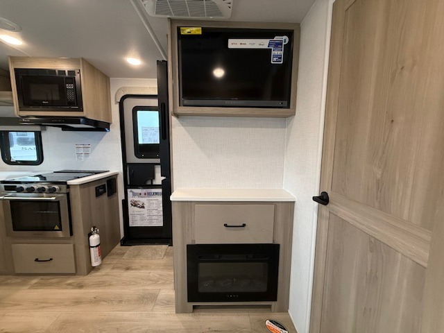 Inside, the U-shaped dinette slide offers comfortable seating and transforms easily into an extra sleeping area for guests. The cozy entertainment center with a 32" smart TV and fireplace brings a touch of home to the campground.