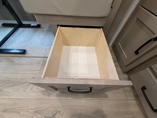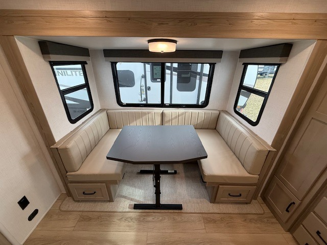 Premium interior details like solid surface countertops, solid wood cabinetry, and night roller shades elevate the experience even more. The AIR 360+ WiFi-ready antenna keeps you connected when needed, and the power tongue jack ensures fast, easy setup.