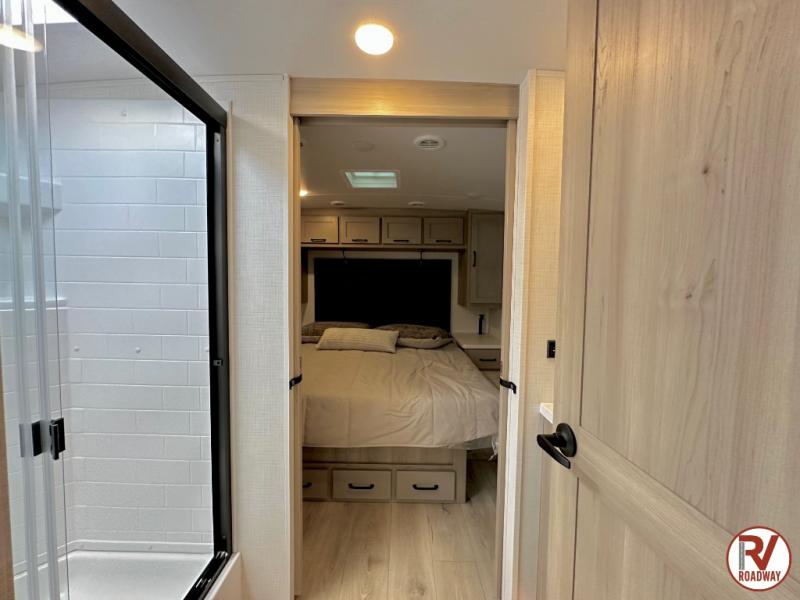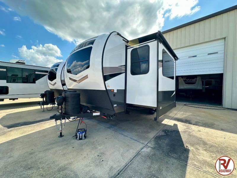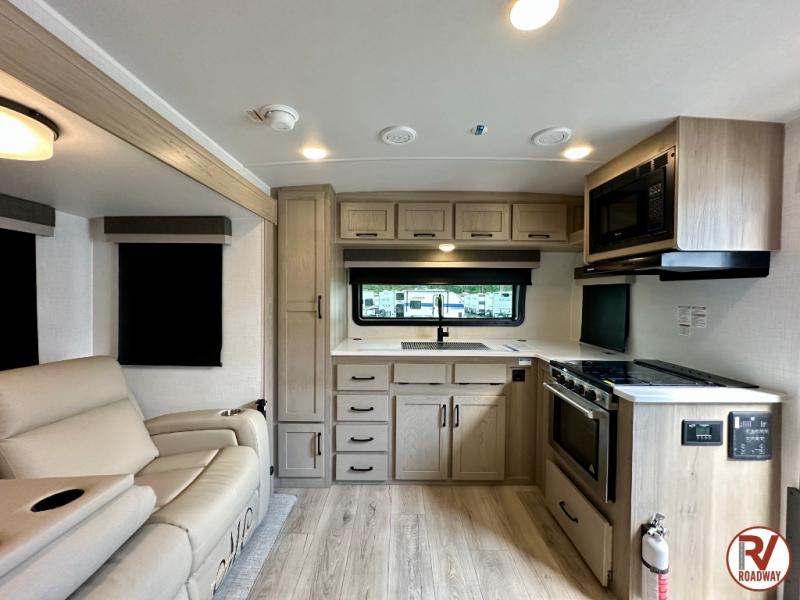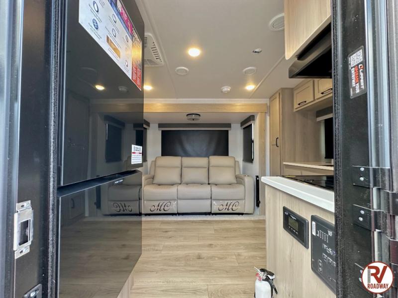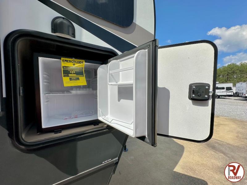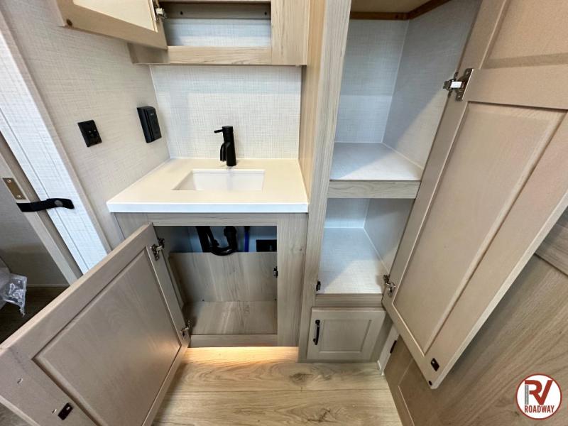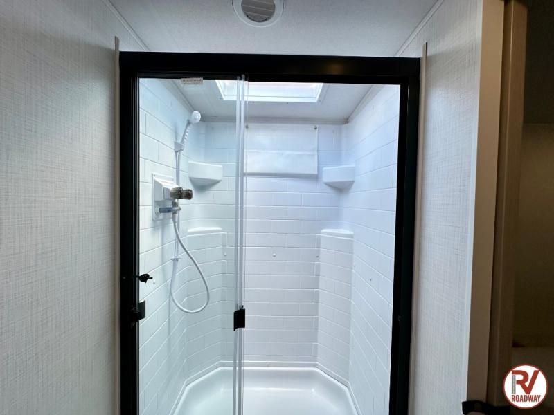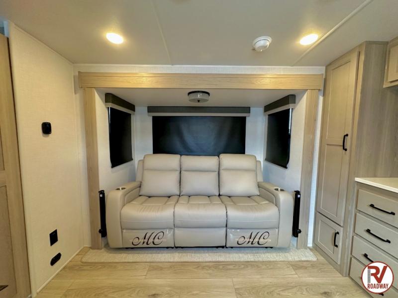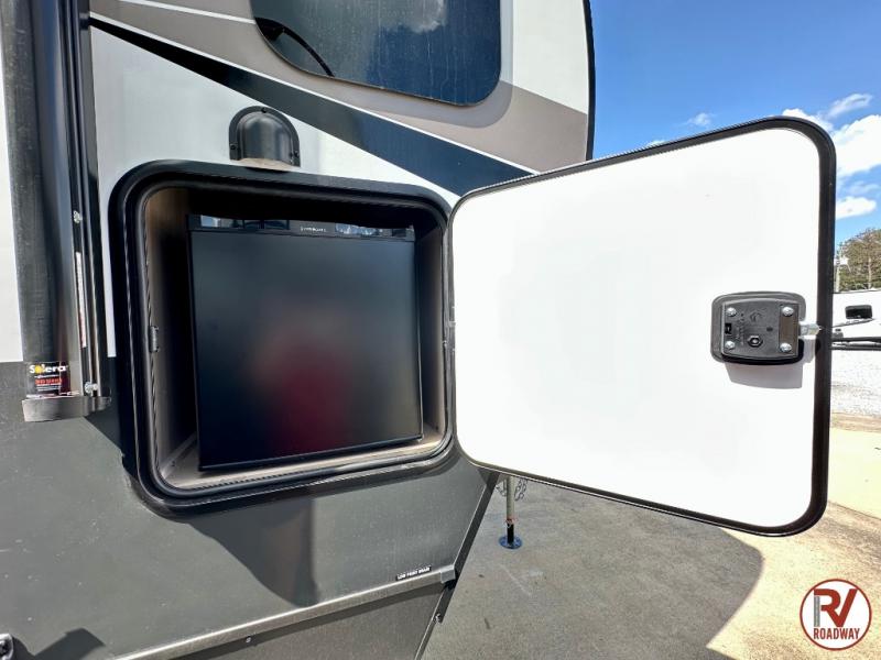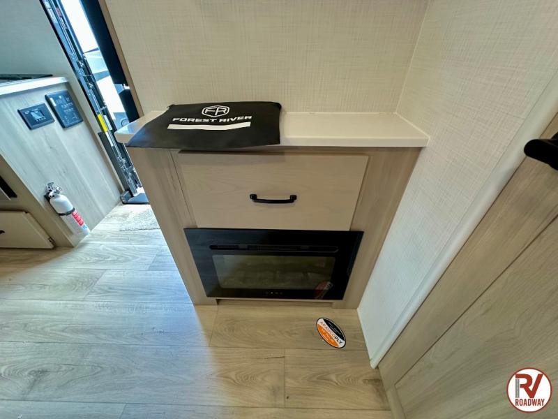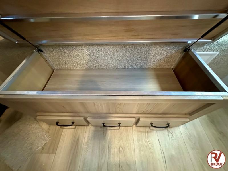 If you like the front kitchen layout, you're going to love this one! You'll have plenty of counter space to prepare and cook meals, or you may just want to head outdoors to cook on the outside griddle. There is a 19' power awning with LED lights to keep you protected from the sun and rain, and there are three exterior storage compartments for lawn chairs, fishing poles, and firewood! This model includes a U-shaped dinette slide in perfect view of the 12V smart entertainment TV and fireplace, and this area can double as your guests' sleeping space at night. You'll stay comfortable in the rear bedroom that includes an RV queen bed, dual bedroom wardrobes, and an optional TV if you enjoy movies in bed!