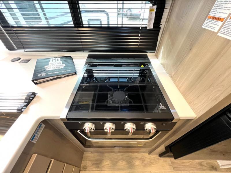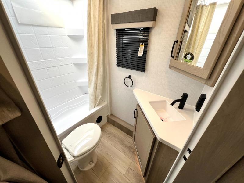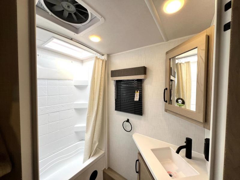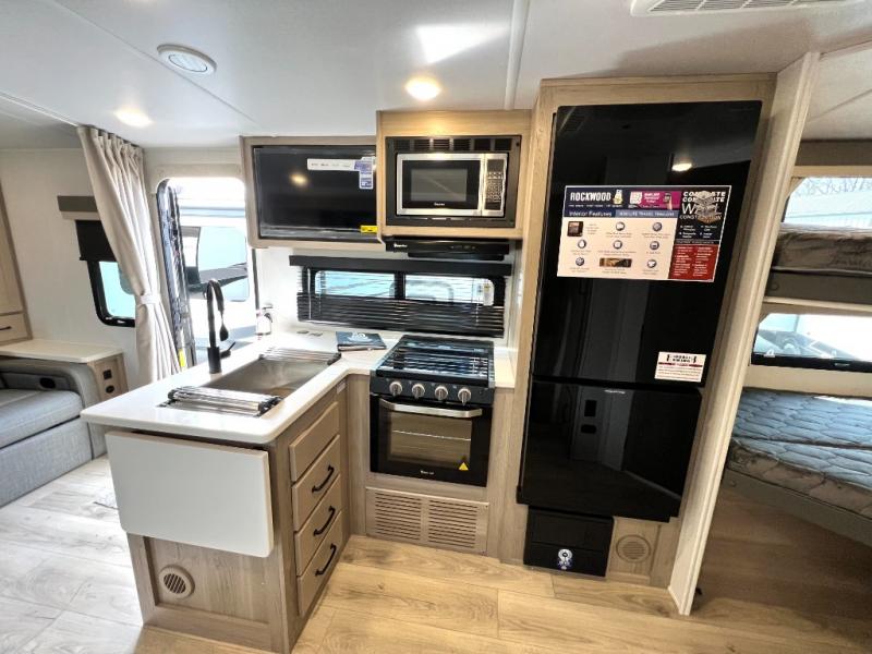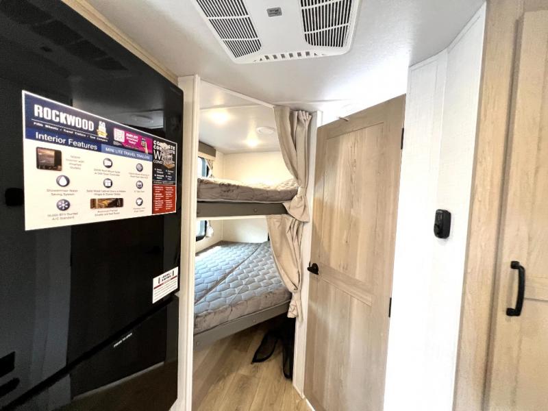 Each Rockwood Mini Lite travel trailer by Forest River is constructed with a fully laminated one-piece walkable roof, sleek frameless windows, and a six-sided full aluminum frame for strength and durability. The 12V thermostatically controlled heated tanks, plus radiant foil in the underbelly and slide out floors will allow you to camp well into the colder months, and the 200W roof solar panel will be perfect for a little off-gridding. Each model includes solid surface kitchen countertops, solid wood cabinet doors, night roller shades, plus many more interior features. Having an AIR 360+ omnidirectional antenna with WiFi prep on board gives you the option to get some work done if it's needed, and the power tongue jack provides hassle-free set up, so you can enjoy more time relaxing!