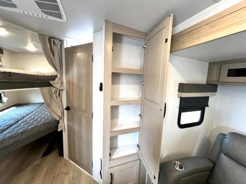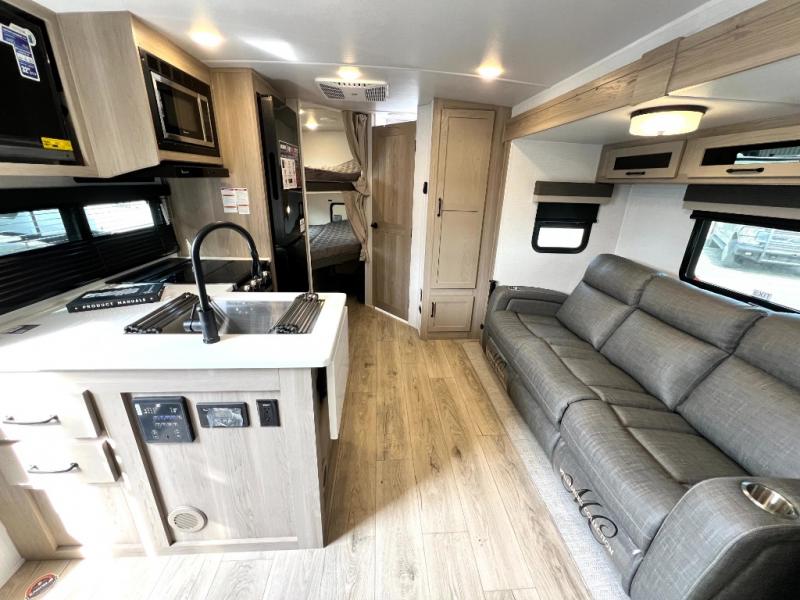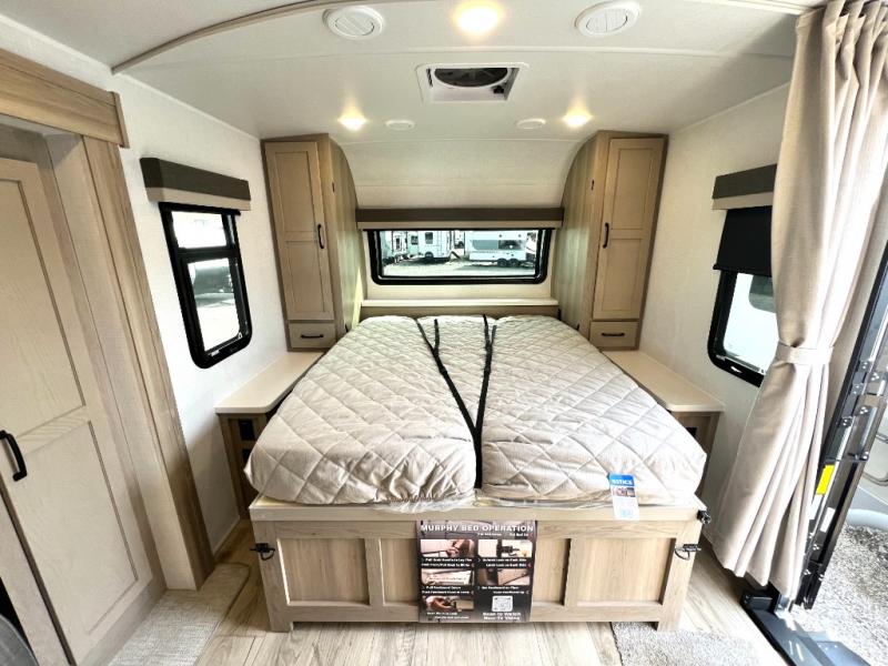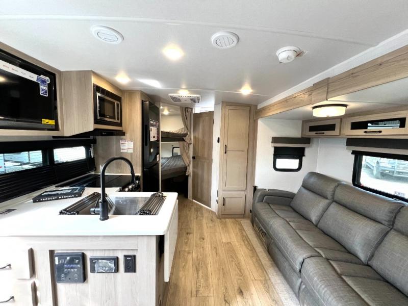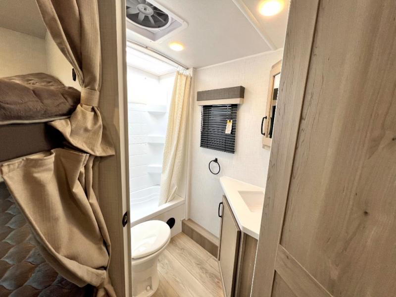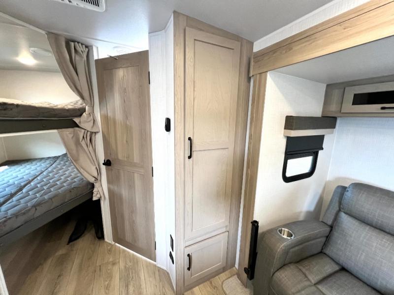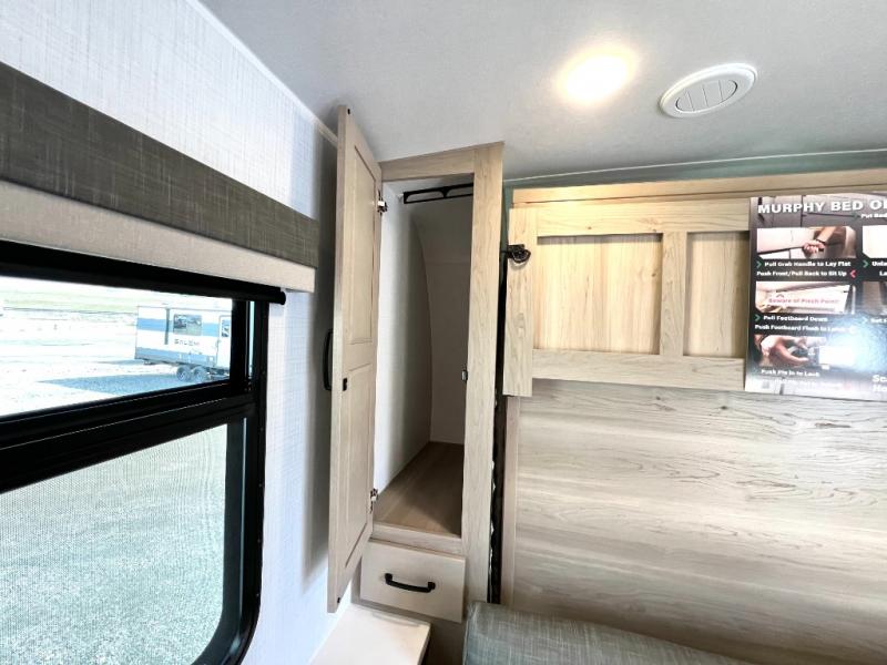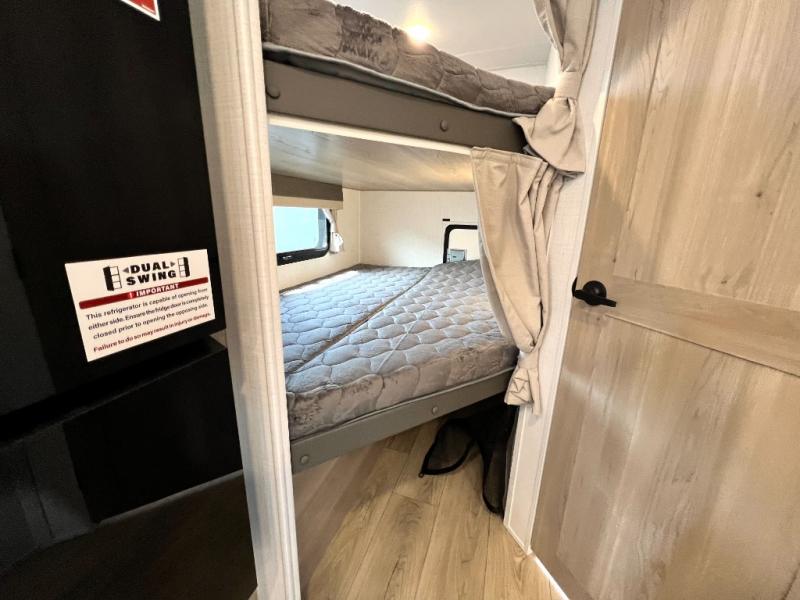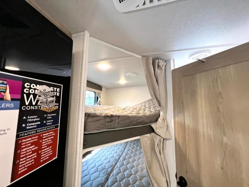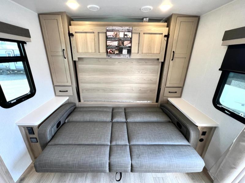 Finally, a lightweight travel trailer with double-size bunks for the kids or your guests! You'll find the versatile Murphy bed up front will be super convenient when you need more space to move around, and the 72" sofa will provide comfy seating space when the bed is put up. This model also includes a U-shaped dinette slide perfect to dine around, play games, and sleep additional guests. A 32" TV in the main living area will allow you to watch your favorite shows in the evenings, or you may just find yourselves outdoors under the 18' power awning with LED lights. And check out the pass-through storage, plus additional exterior storage for your hiking gear!
