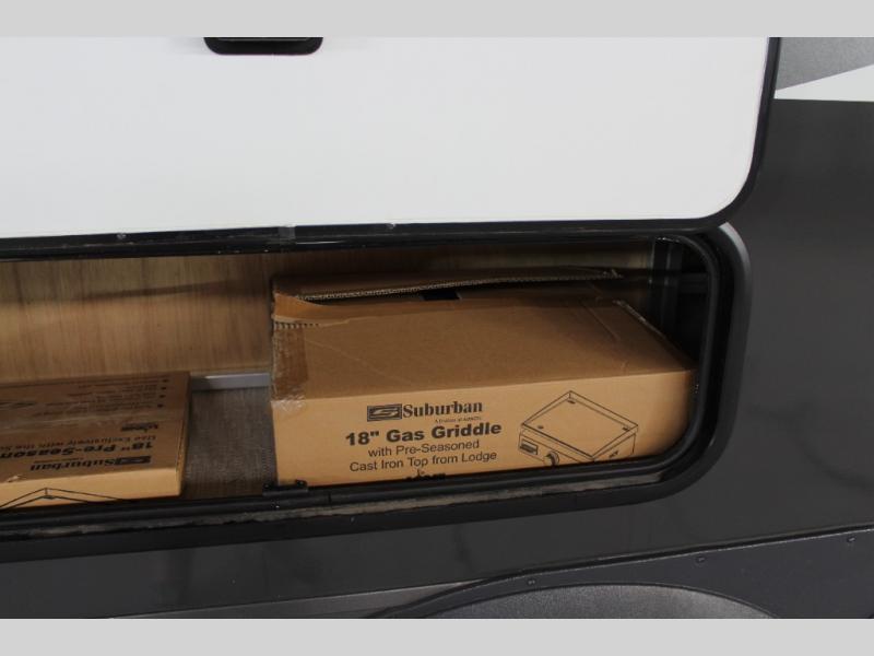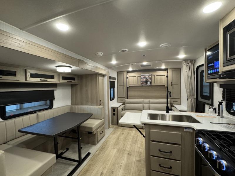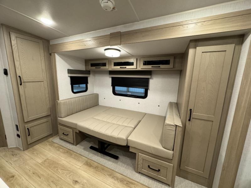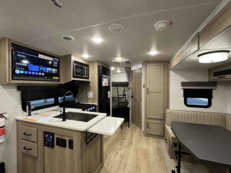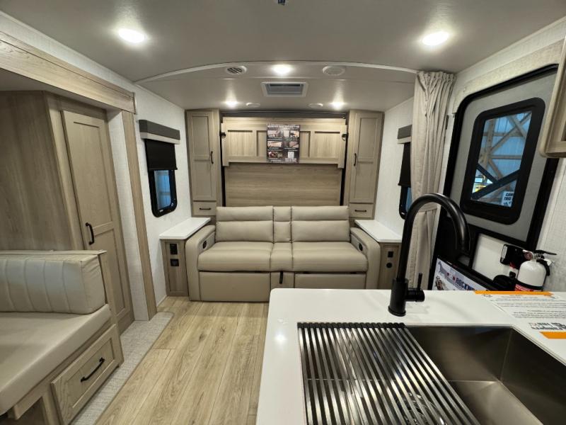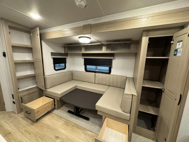 Finally, a lightweight travel trailer with double-size bunks for the kids or your guests! You'll find the versatile Murphy bed up front will be super convenient when you need more space to move around, and the 72" sofa will provide comfy seating space when the bed is put up. This model also includes a U-shaped dinette slide perfect to dine around, play games, and sleep additional guests. A 32" TV in the main living area will allow you to watch your favorite shows in the evenings, or you may just find yourselves outdoors under the 18' power awning with LED lights. And check out the pass-through storage, plus additional exterior storage for your hiking gear!