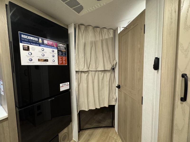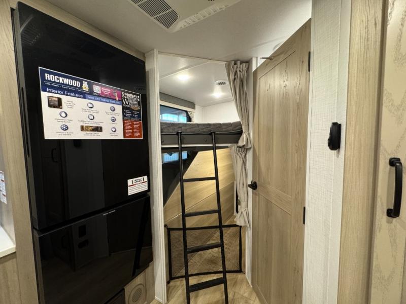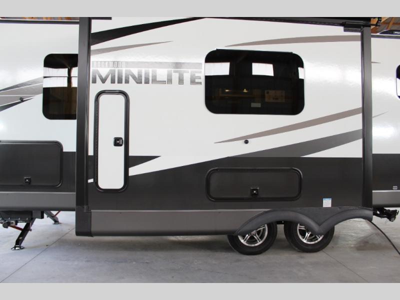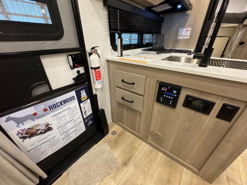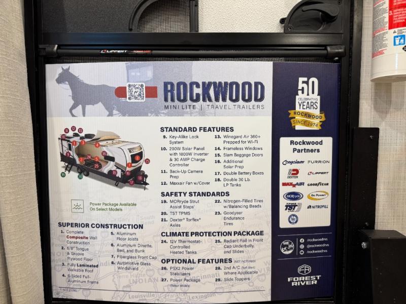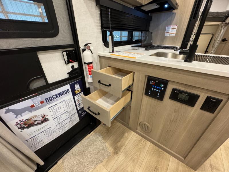 Each Rockwood Mini Lite travel trailer by Forest River is constructed with a fully laminated one-piece walkable roof, sleek frameless windows, and a six-sided full aluminum frame for strength and durability. The 12V thermostatically controlled heated tanks, plus radiant foil in the underbelly and slide out floors will allow you to camp well into the colder months, and the 200W roof solar panel will be perfect for a little off-gridding. Each model includes solid surface kitchen countertops, solid wood cabinet doors, night roller shades, plus many more interior features. Having an AIR 360+ omnidirectional antenna with WiFi prep on board gives you the option to get some work done if it's needed, and the power tongue jack provides hassle-free set up, so you can enjoy more time relaxing!