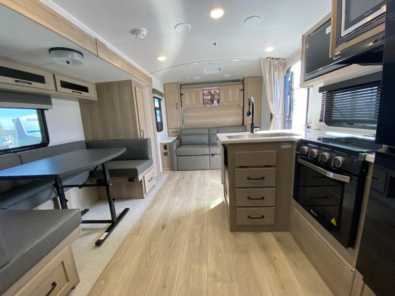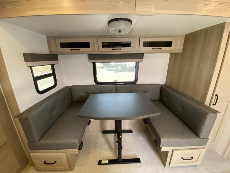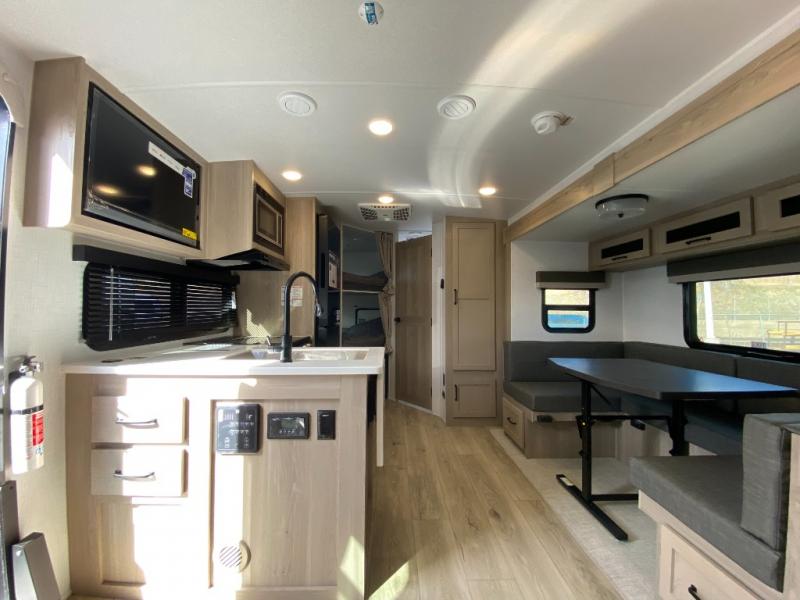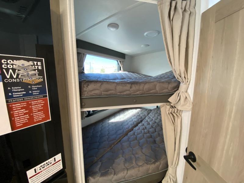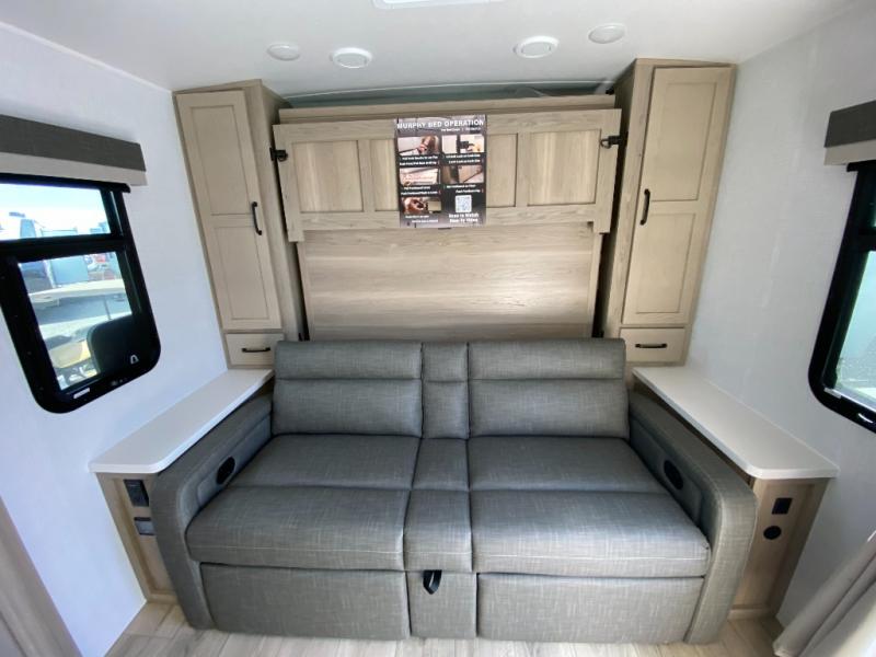 Finally, a lightweight travel trailer with double-size bunks for the kids or your guests! You'll find the versatile Murphy bed up front will be super convenient when you need more space to move around, and the 72" sofa will provide comfy seating space when the bed is put up. This model also includes a U-shaped dinette slide perfect to dine around, play games, and sleep additional guests. A 32" TV in the main living area will allow you to watch your favorite shows in the evenings, or you may just find yourselves outdoors under the 18' power awning with LED lights. And check out the pass-through storage, plus additional exterior storage for your hiking gear!