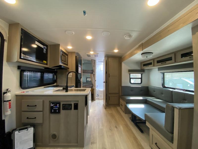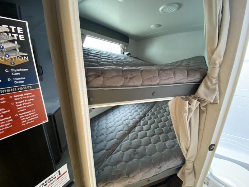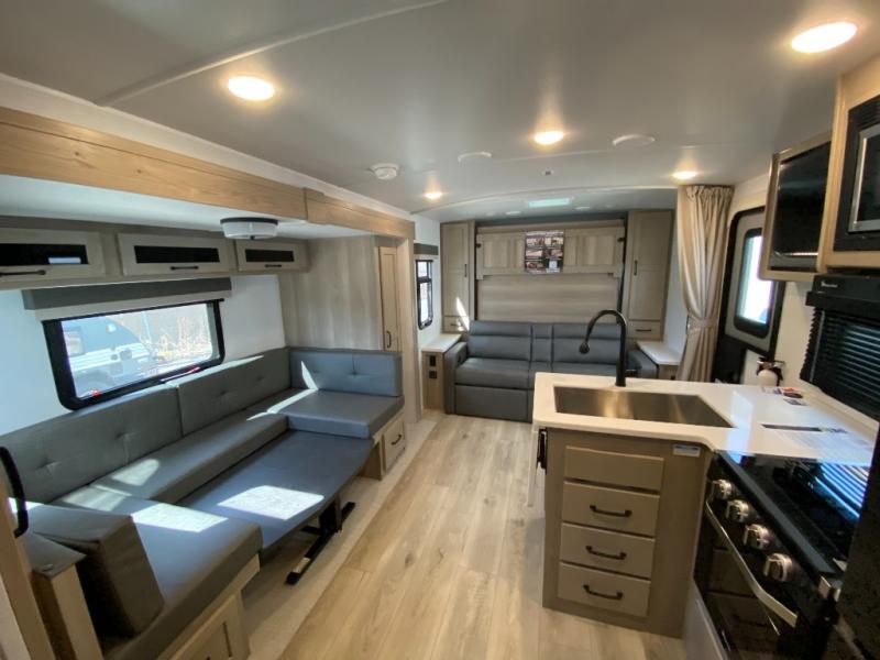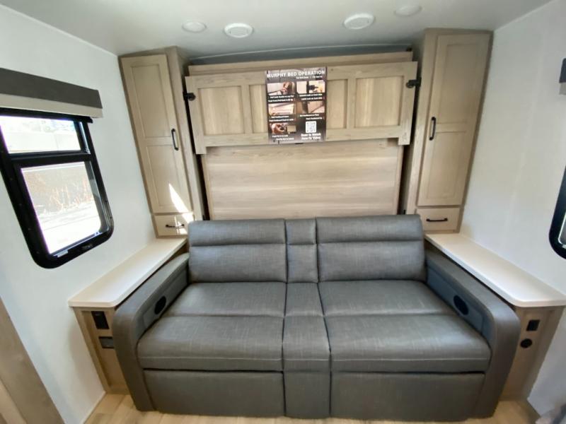 Finally, a lightweight travel trailer with double-size bunks for the kids or your guests! You'll find the versatile Murphy bed up front will be super convenient when you need more space to move around, and the 72" sofa will provide comfy seating space when the bed is put up. This model also includes a U-shaped dinette slide perfect to dine around, play games, and sleep additional guests. A 32" TV in the main living area will allow you to watch your favorite shows in the evenings, or you may just find yourselves outdoors under the 18' power awning with LED lights. And check out the pass-through storage, plus additional exterior storage for your hiking gear!