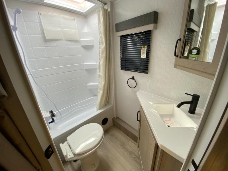 Each Rockwood Mini Lite travel trailer by Forest River is constructed with a fully laminated one-piece walkable roof, sleek frameless windows, and a six-sided full aluminum frame for strength and durability. The 12V thermostatically controlled heated tanks, plus radiant foil in the underbelly and slide out floors will allow you to camp well into the colder months, and the 200W roof solar panel will be perfect for a little off-gridding. Each model includes solid surface kitchen countertops, solid wood cabinet doors, night roller shades, plus many more interior features. Having an AIR 360+ omnidirectional antenna with WiFi prep on board gives you the option to get some work done if it's needed, and the power tongue jack provides hassle-free set up, so you can enjoy more time relaxing!