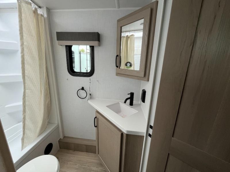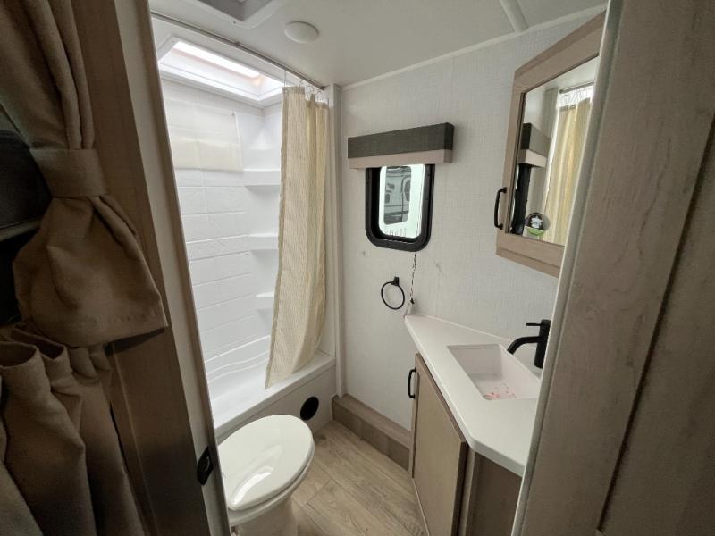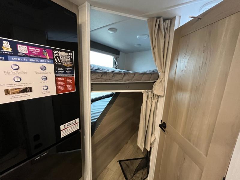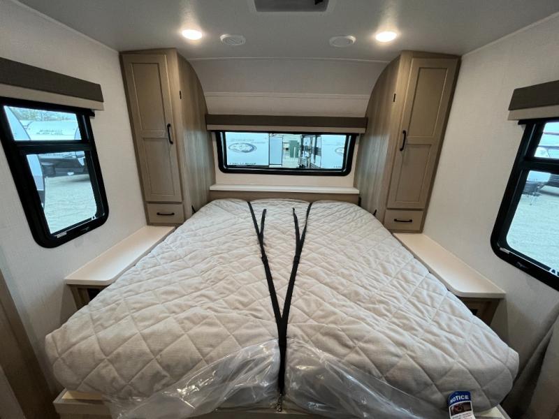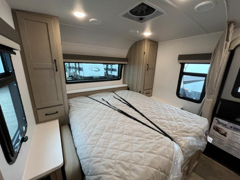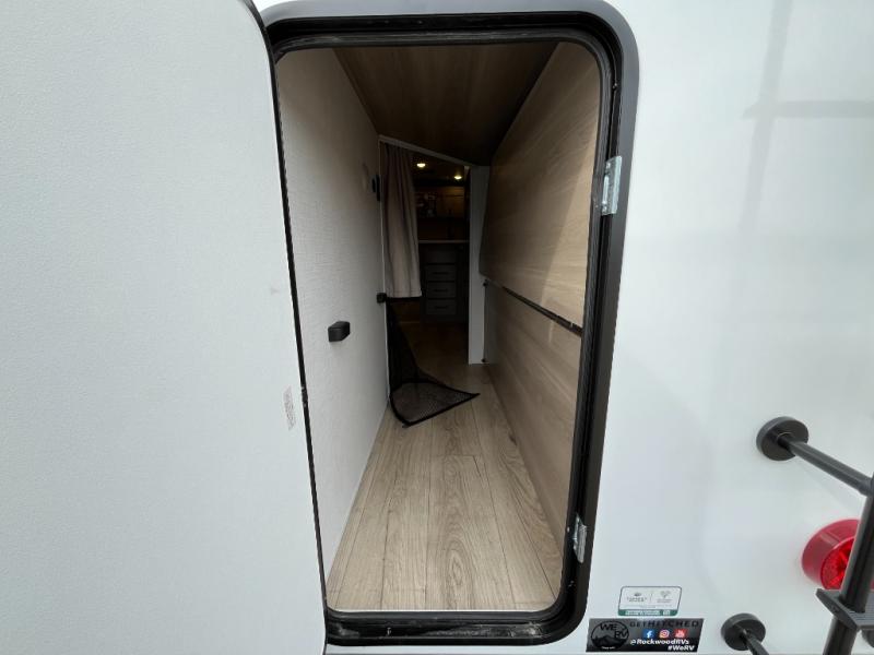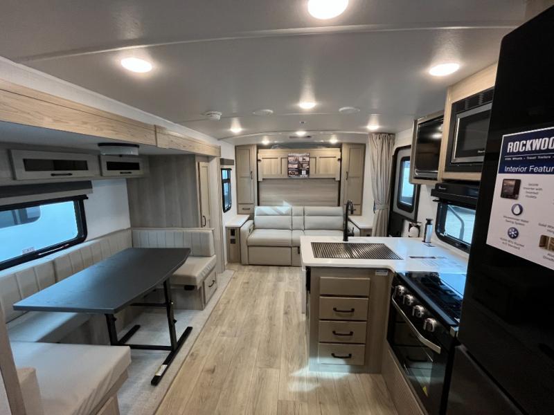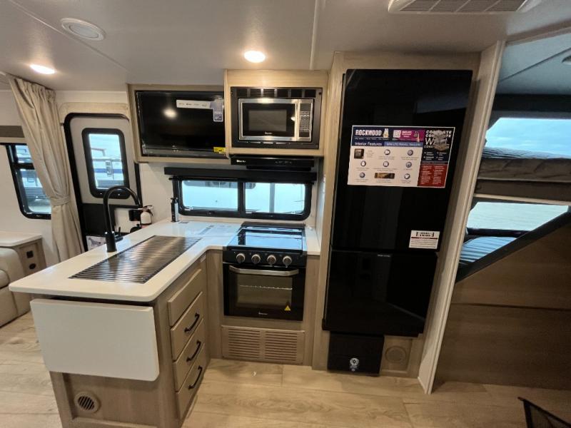 Each Rockwood Mini Lite travel trailer by Forest River is constructed with a fully laminated one-piece walkable roof, sleek frameless windows, and a six-sided full aluminum frame for strength and durability. The 12V thermostatically controlled heated tanks, plus radiant foil in the underbelly and slide out floors will allow you to camp well into the colder months, and the 200W roof solar panel will be perfect for a little off-gridding. Each model includes solid surface kitchen countertops, solid wood cabinet doors, night roller shades, plus many more interior features. Having an AIR 360+ omnidirectional antenna with WiFi prep on board gives you the option to get some work done if it's needed, and the power tongue jack provides hassle-free set up, so you can enjoy more time relaxing!