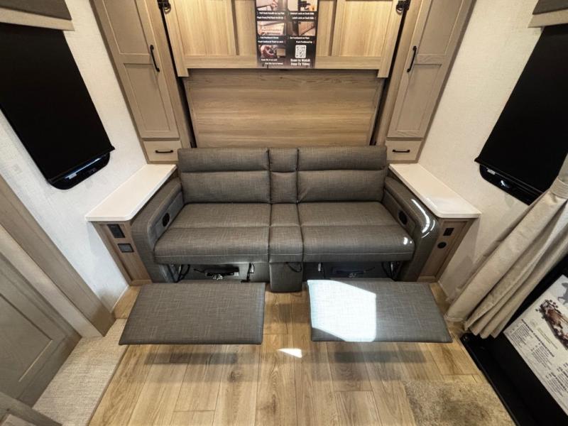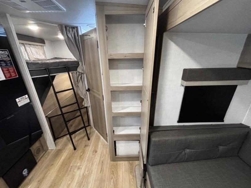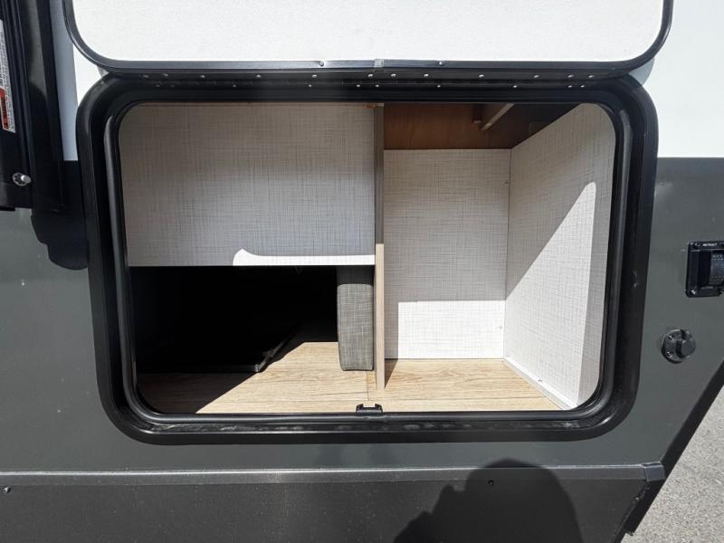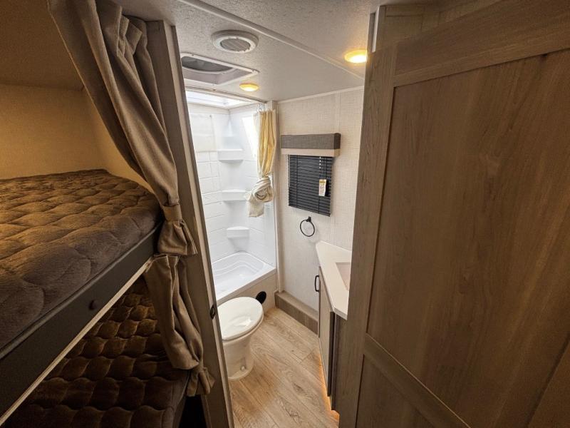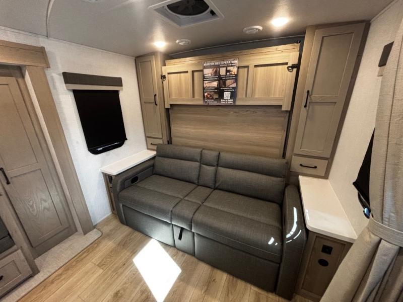Finally, a lightweight travel trailer with double-size bunks for the kids or your guests! You'll find the versatile Murphy bed up front will be super convenient when you need more space to move around, and the 72" sofa will provide comfy seating space when the bed is put up. This model also includes a U-shaped dinette slide perfect to dine around, play games, and sleep additional guests. A 32" TV in the main living area will allow you to watch your favorite shows in the evenings, or you may just find yourselves outdoors under the 18' power awning with LED lights. And check out the pass-through storage, plus additional exterior storage for your hiking gear!