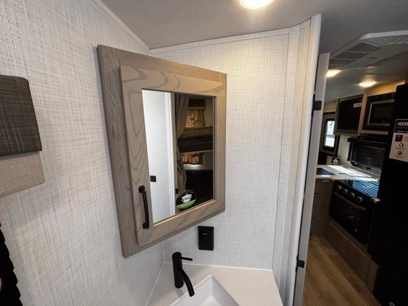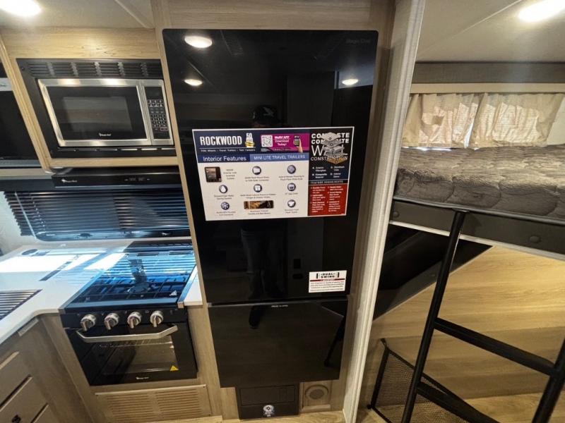 Each Rockwood Mini Lite travel trailer by Forest River is constructed with a fully laminated one-piece walkable roof, sleek frameless windows, and a six-sided full aluminum frame for strength and durability. The 12V thermostatically controlled heated tanks, plus radiant foil in the underbelly and slide out floors will allow you to camp well into the colder months, and the 200W roof solar panel will be perfect for a little off-gridding. Each model includes solid surface kitchen countertops, solid wood cabinet doors, night roller shades, plus many more interior features. Having an AIR 360+ omnidirectional antenna with WiFi prep on board gives you the option to get some work done if it's needed, and the power tongue jack provides hassle-free set up, so you can enjoy more time relaxing!