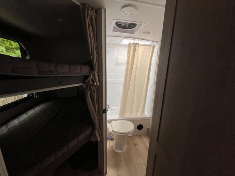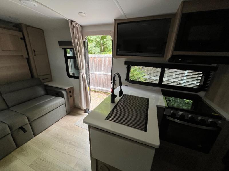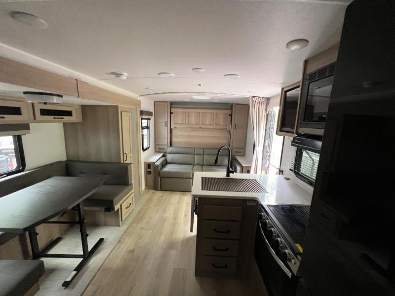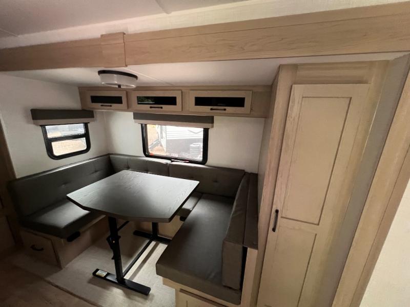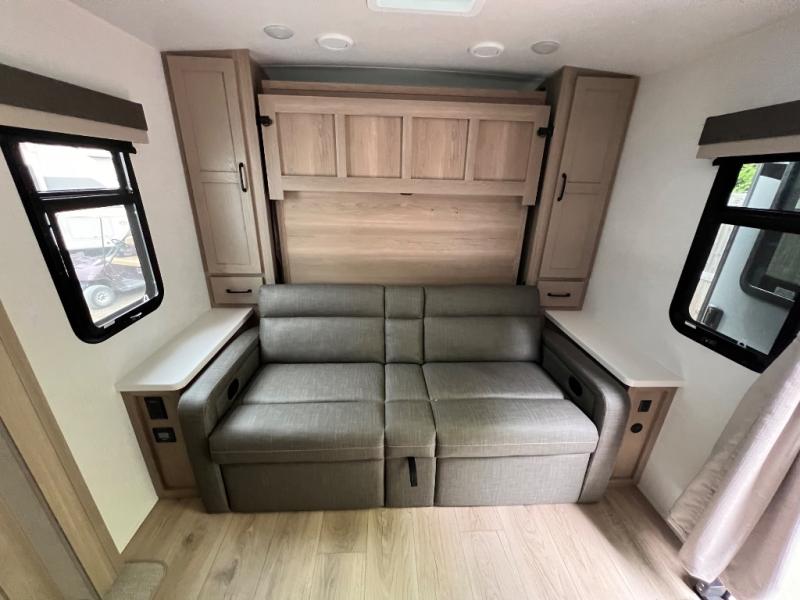 Finally, a lightweight travel trailer with double-size bunks for the kids or your guests! You'll find the versatile Murphy bed up front will be super convenient when you need more space to move around, and the 72" sofa will provide comfy seating space when the bed is put up. This model also includes a U-shaped dinette slide perfect to dine around, play games, and sleep additional guests. A 32" TV in the main living area will allow you to watch your favorite shows in the evenings, or you may just find yourselves outdoors under the 18' power awning with LED lights. And check out the pass-through storage, plus additional exterior storage for your hiking gear!