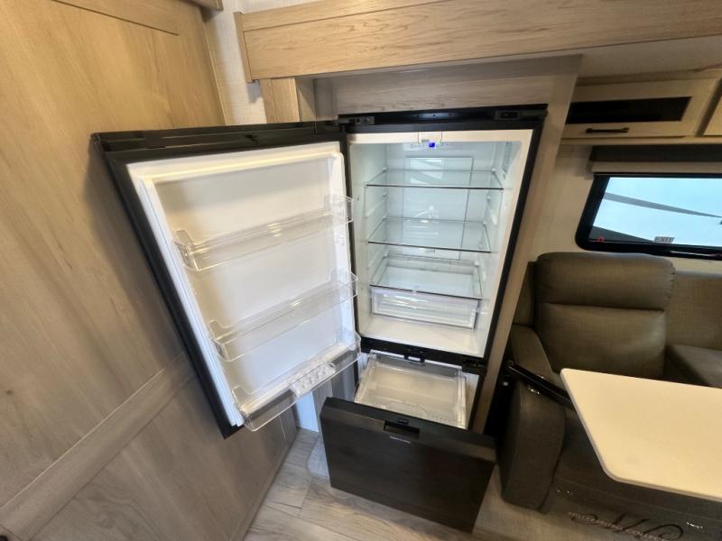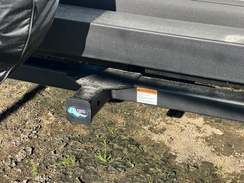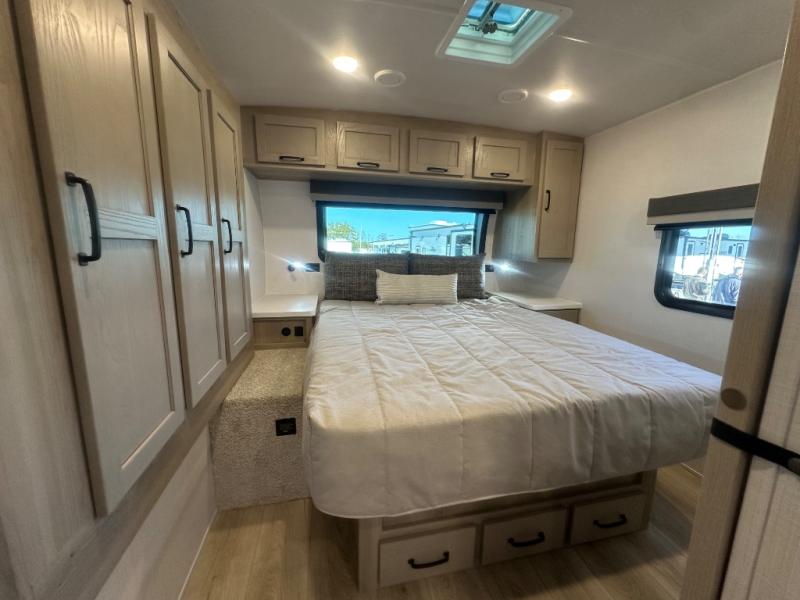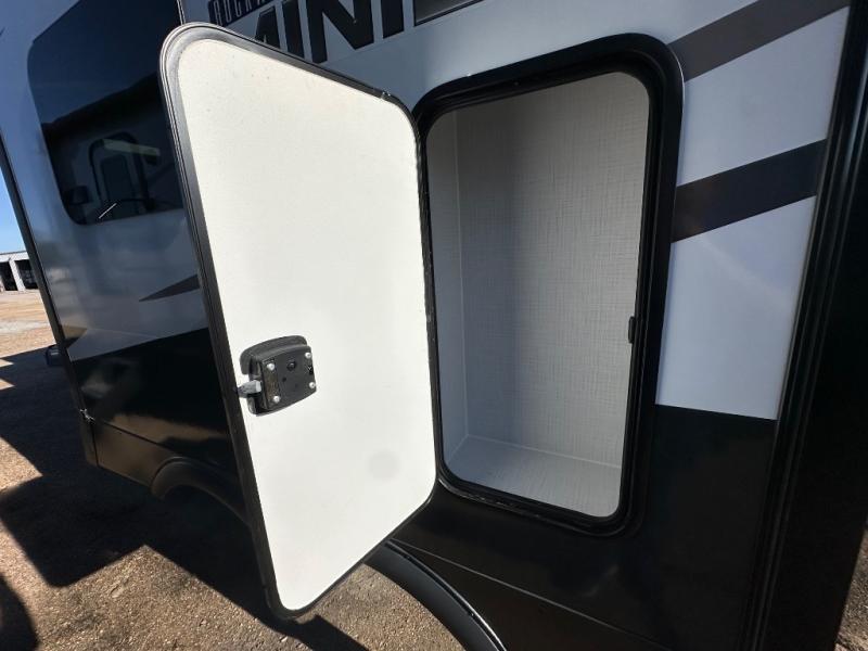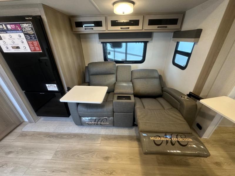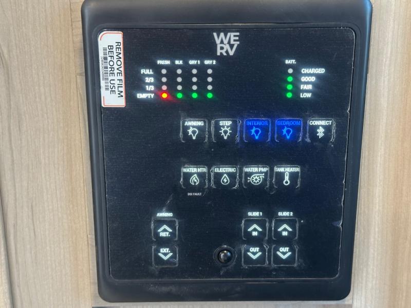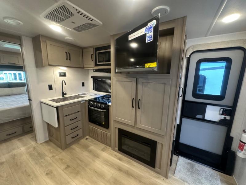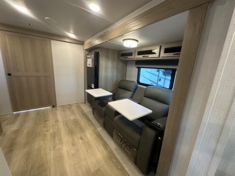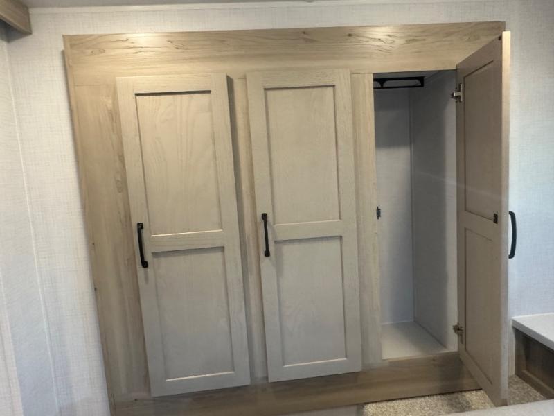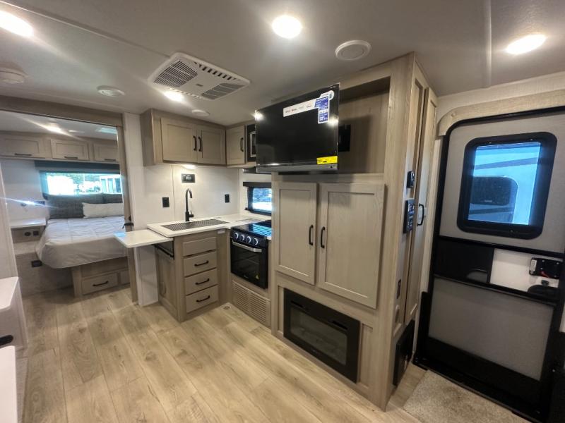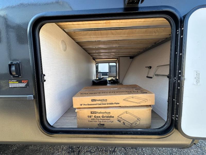 Camping trips to the lake just got sweeter with this dual slide out travel trailer in tow! Once you arrive, unload your gear from the exterior drop-frame pass-through storage, then start lunch on the exterior griddle. If you need a rest after traveling all day, the RV queen bed in the front bedroom is sure to give you comfort, or you can relax on the theater seating. The fireplace and entertainment center with a 32" TV will make this space feel just like home, and check out the spacious full rear bath for added privacy. This model also includes an entryway closet/pantry for jackets, shoes, and food!
