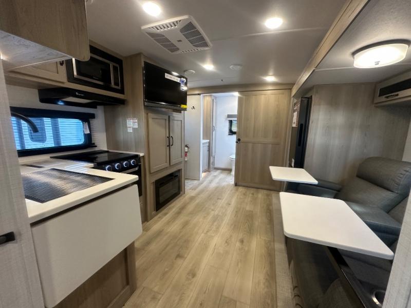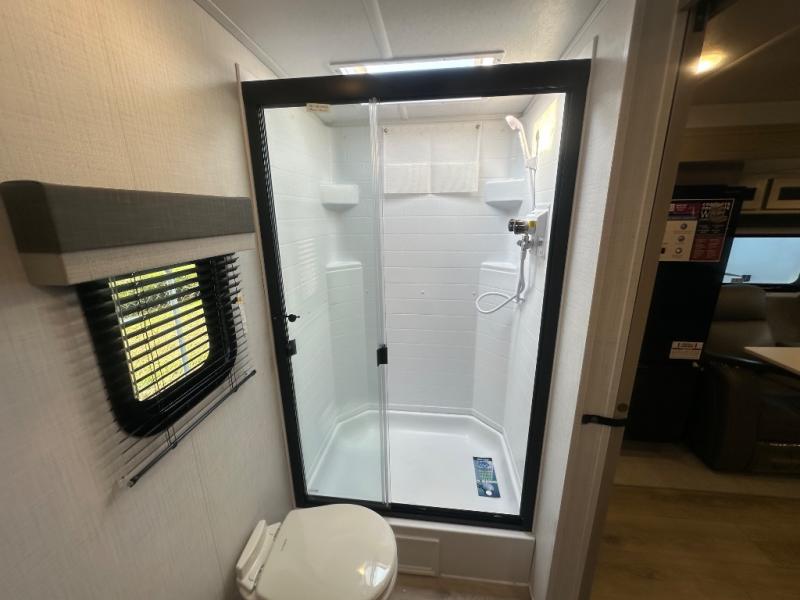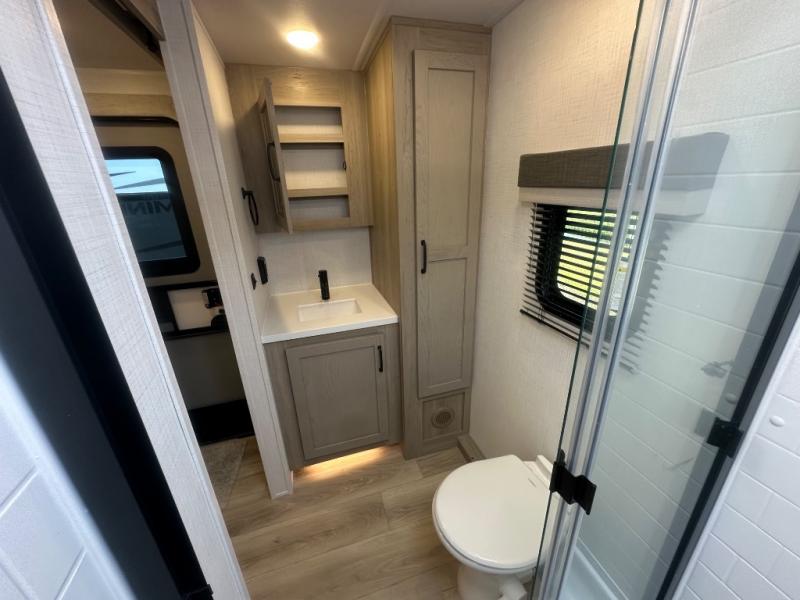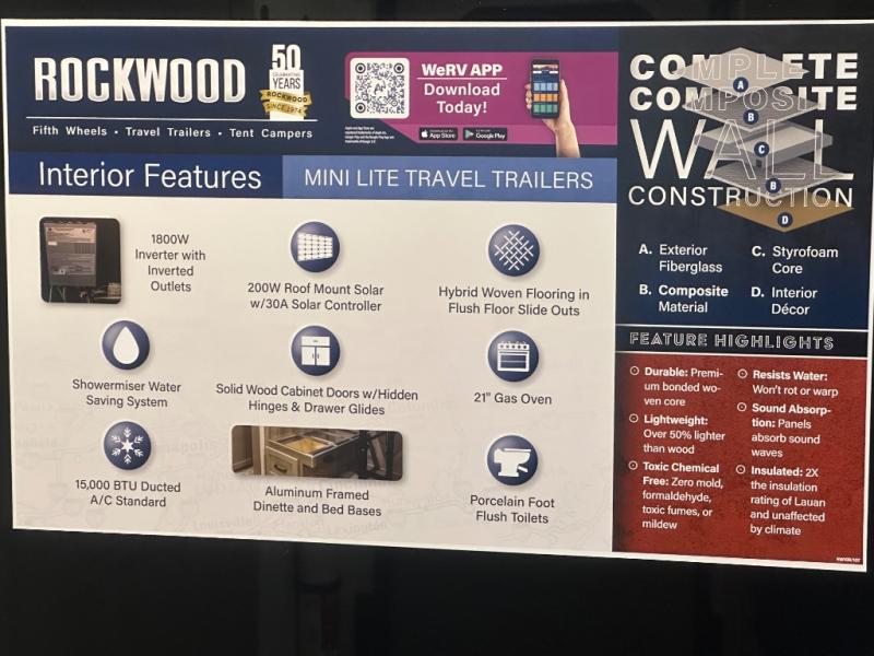 Each Rockwood Mini Lite travel trailer by Forest River is constructed with a fully laminated one-piece walkable roof, sleek frameless windows, and a six-sided full aluminum frame for strength and durability. The 12V thermostatically controlled heated tanks, plus radiant foil in the underbelly and slide out floors will allow you to camp well into the colder months, and the 200W roof solar panel will be perfect for a little off-gridding. Each model includes solid surface kitchen countertops, solid wood cabinet doors, night roller shades, plus many more interior features. Having an AIR 360+ omnidirectional antenna with WiFi prep on board gives you the option to get some work done if it's needed, and the power tongue jack provides hassle-free set up, so you can enjoy more time relaxing!