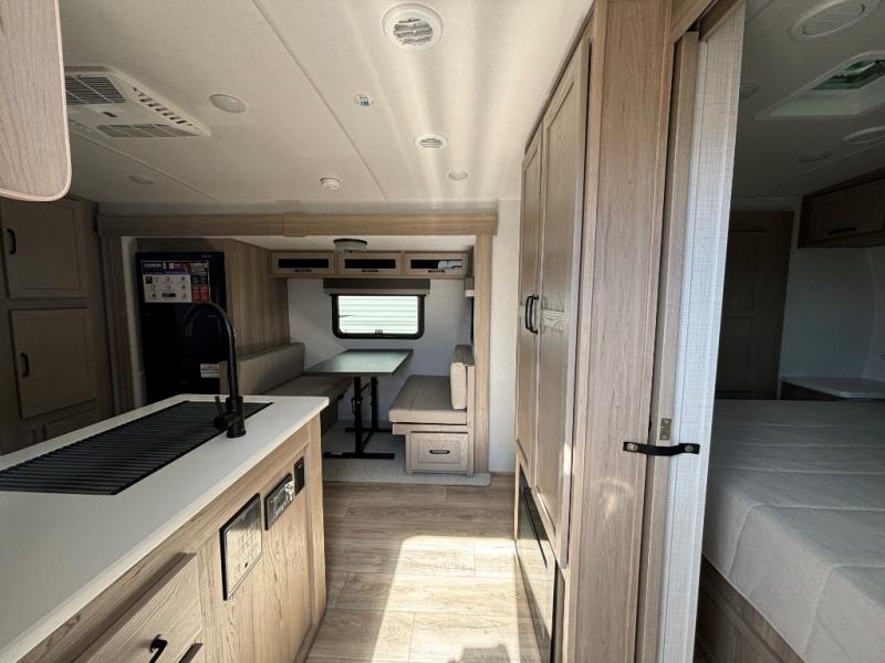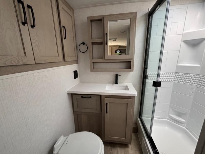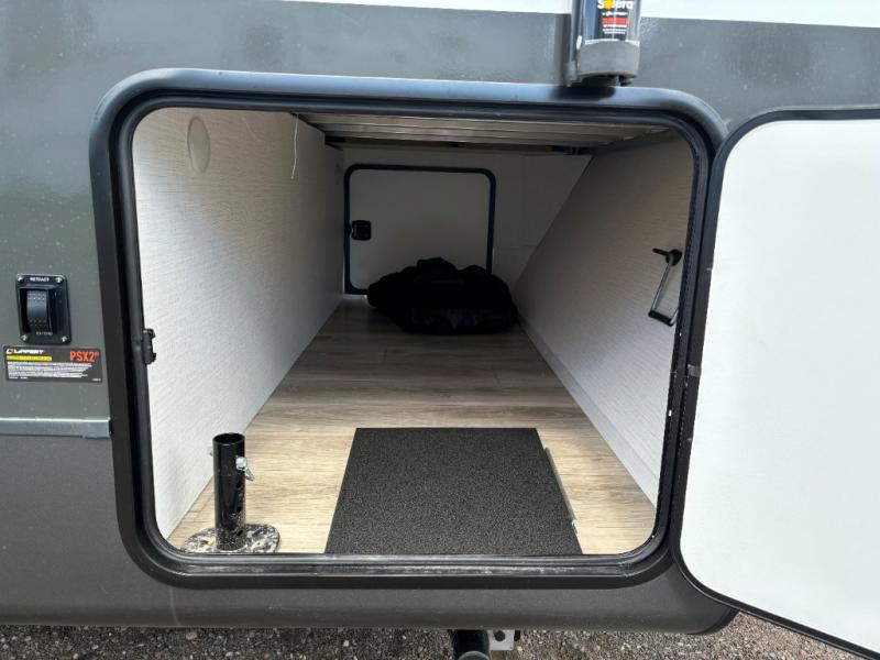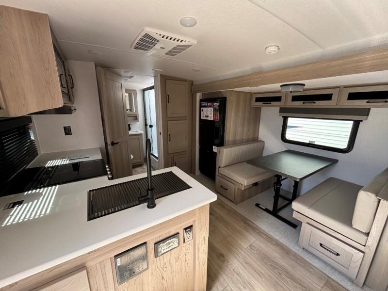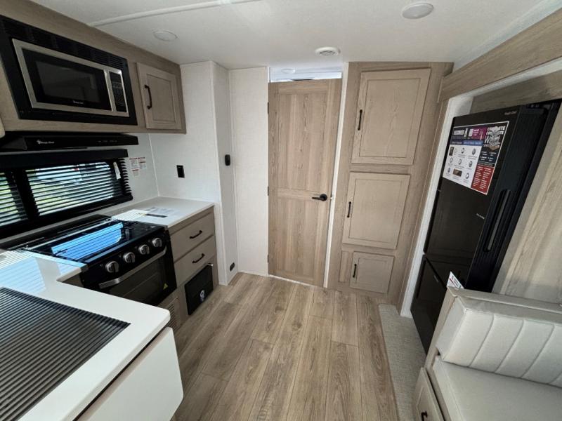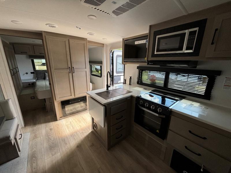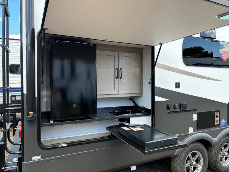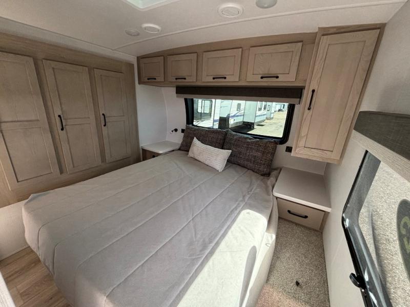 This is the perfect travel trailer for two people looking for comfortable camping trips! You will have your own RV queen bed to sleep on in the front private bedroom, and an optional TV can be added if you enjoy the morning news in bed. Breakfast can be made on the three burner cooktop, or head outdoors to cook on the outside kitchen. The theater seating with a table will provide a place to relax and dine together, and the spacious full rear bath will allow you to clean up before you head out for the day. This model includes plenty of storage space, including two pantries, a wardrobe slide out in the bedroom, plus a drop-frame pass-through storage for larger camp gear!
