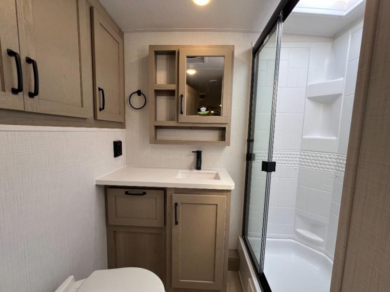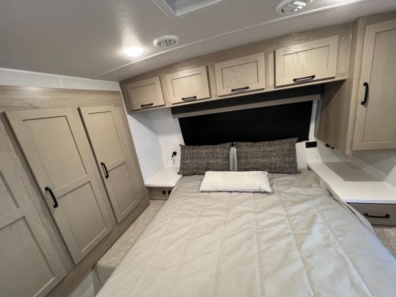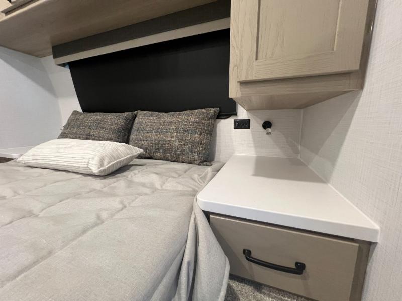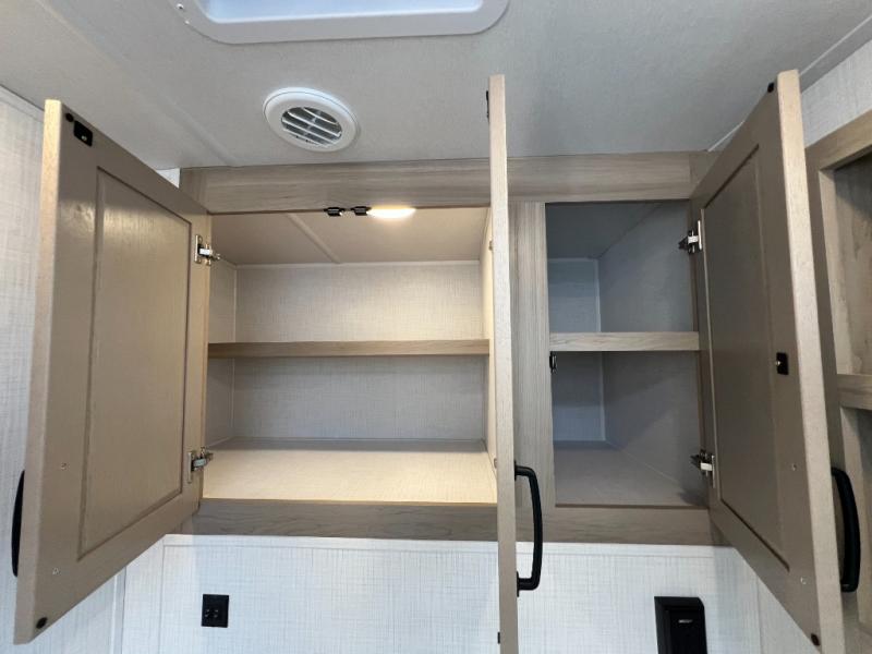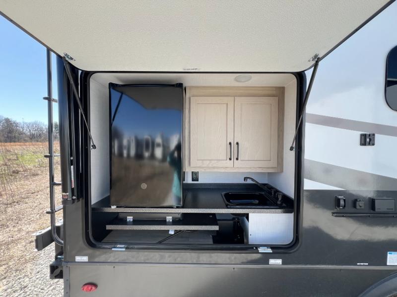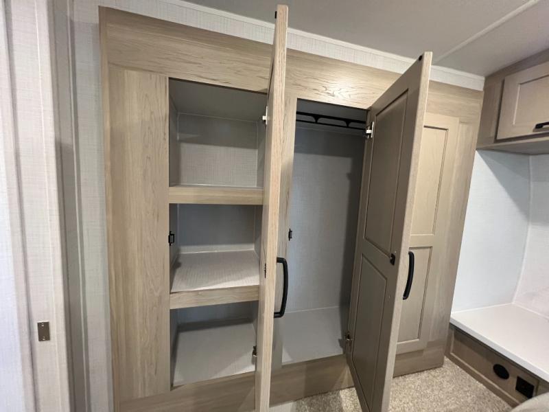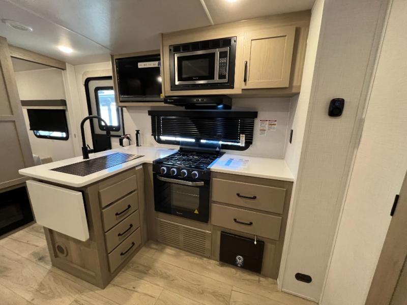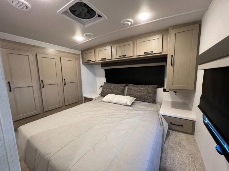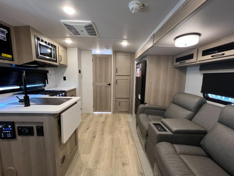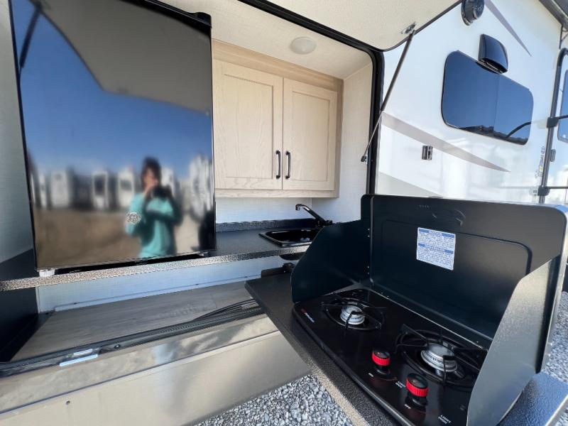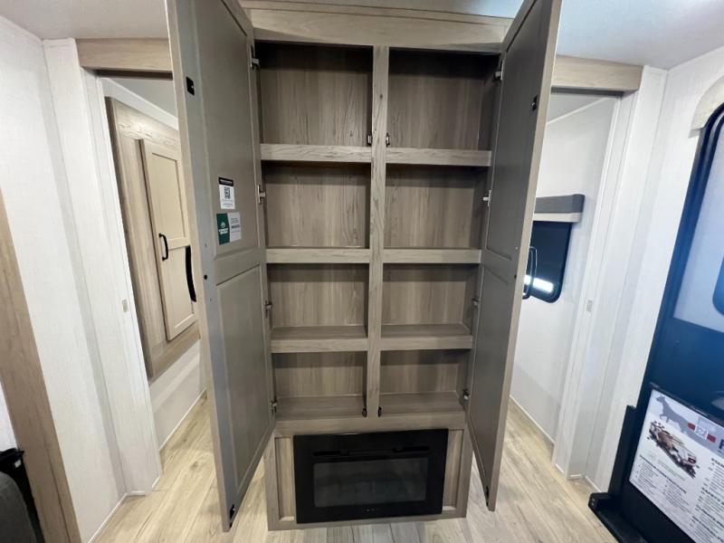 This is the perfect travel trailer for two people looking for comfortable camping trips! You will have your own RV queen bed to sleep on in the front private bedroom, and an optional TV can be added if you enjoy the morning news in bed. Breakfast can be made on the three burner cooktop, or head outdoors to cook on the outside kitchen. The theater seating with a table will provide a place to relax and dine together, and the spacious full rear bath will allow you to clean up before you head out for the day. This model includes plenty of storage space, including two pantries, a wardrobe slide out in the bedroom, plus a drop-frame pass-through storage for larger camp gear!