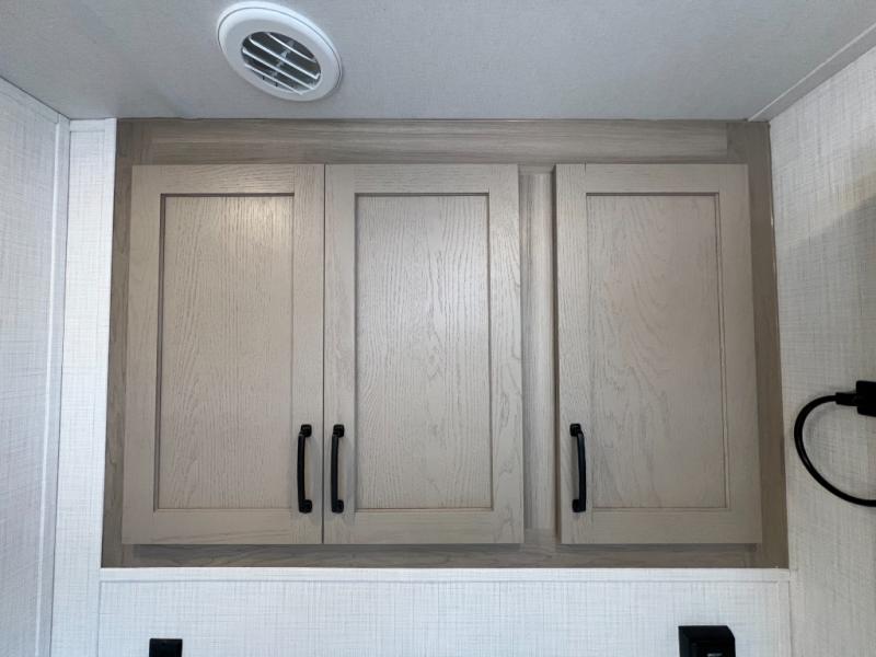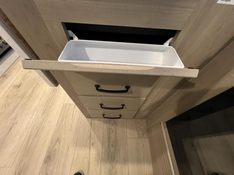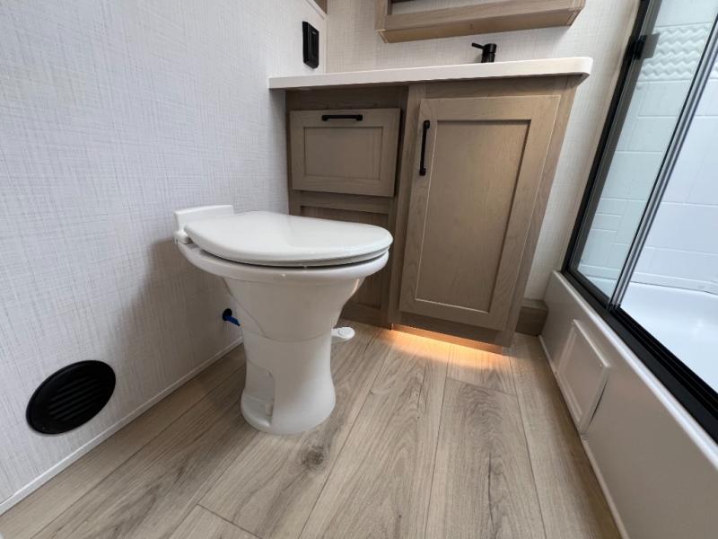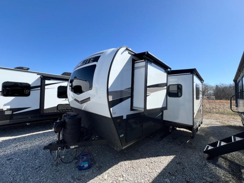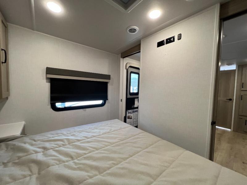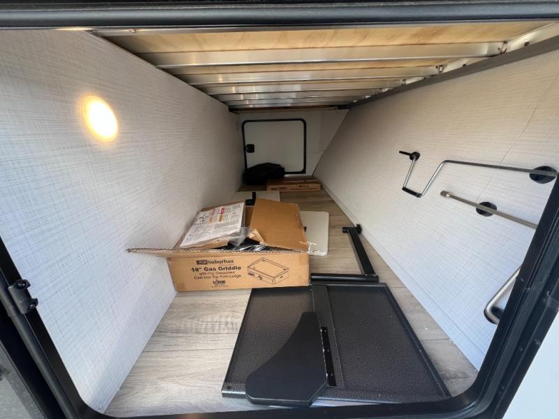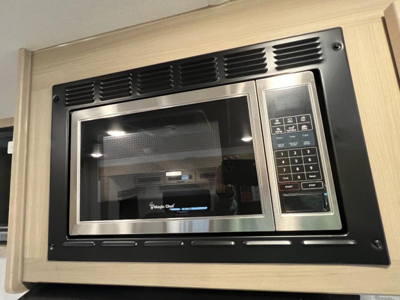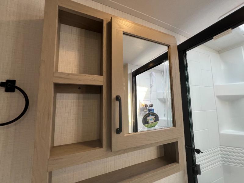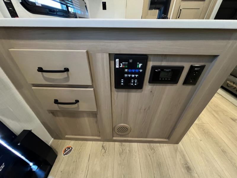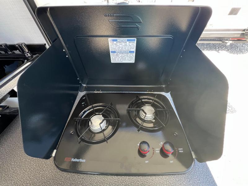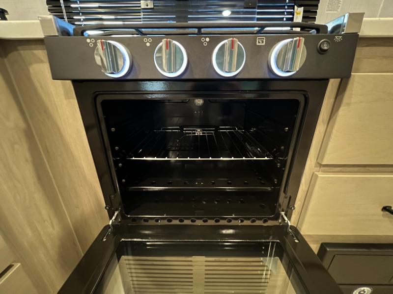 This is the perfect travel trailer for two people looking for comfortable camping trips! You will have your own RV queen bed to sleep on in the front private bedroom, and an optional TV can be added if you enjoy the morning news in bed. Breakfast can be made on the three burner cooktop, or head outdoors to cook on the outside kitchen. The theater seating with a table will provide a place to relax and dine together, and the spacious full rear bath will allow you to clean up before you head out for the day. This model includes plenty of storage space, including two pantries, a wardrobe slide out in the bedroom, plus a drop-frame pass-through storage for larger camp gear!