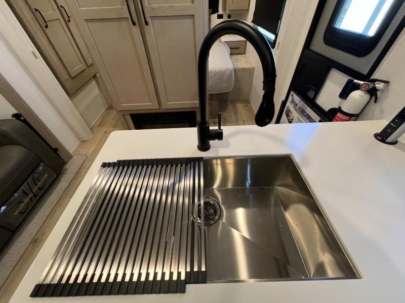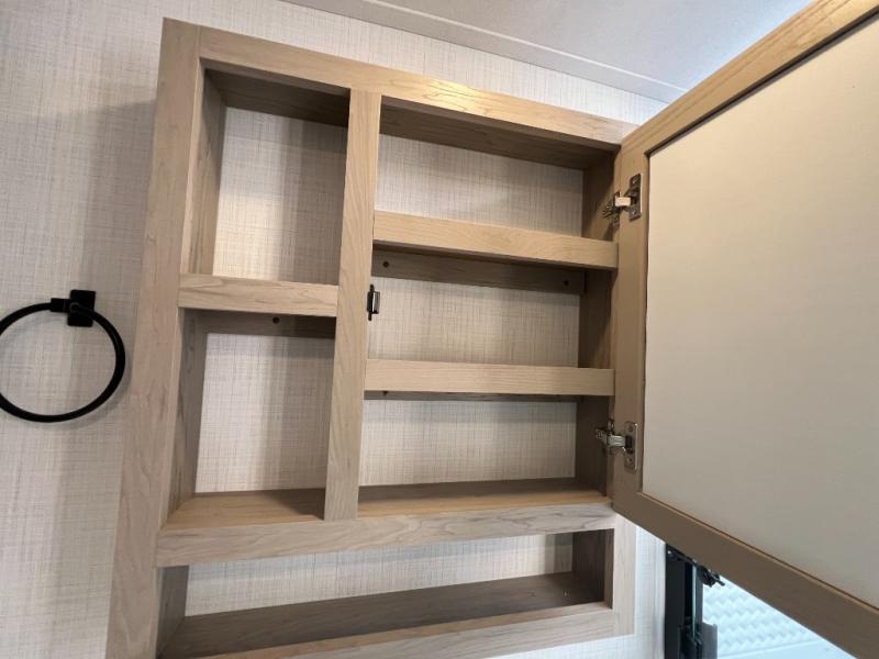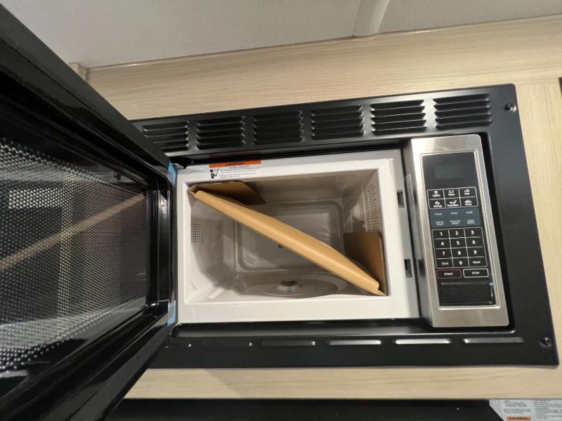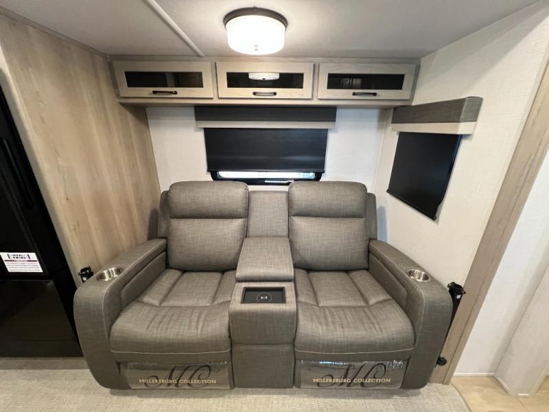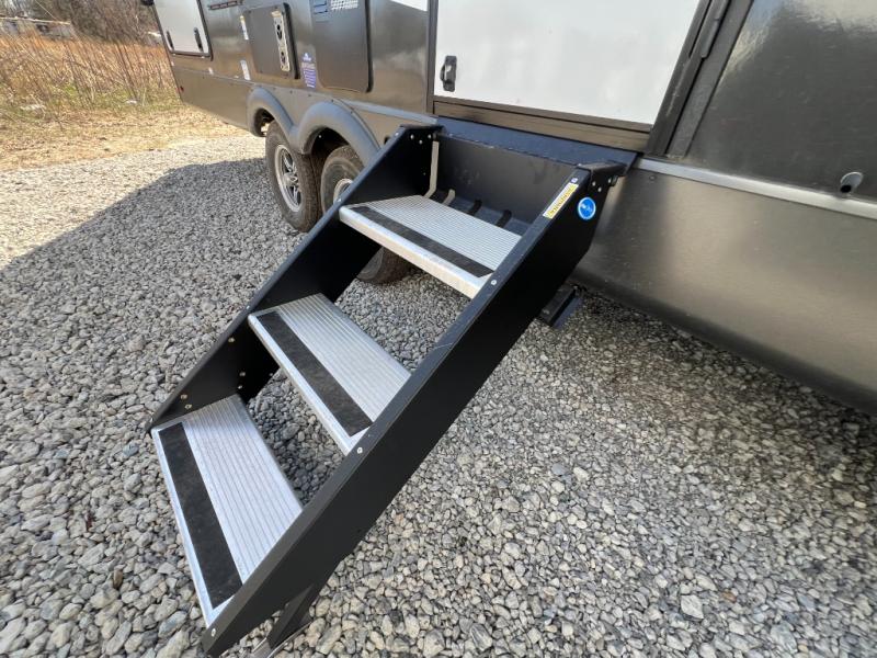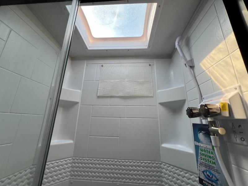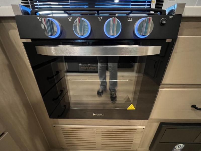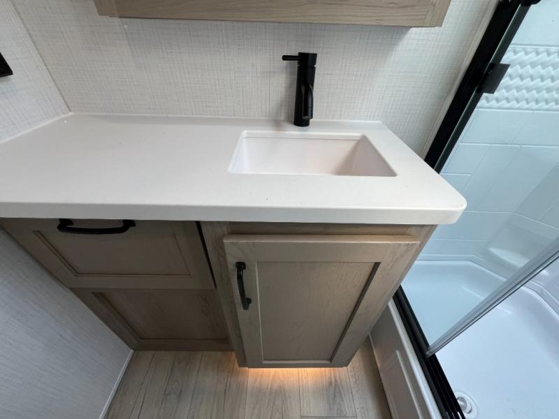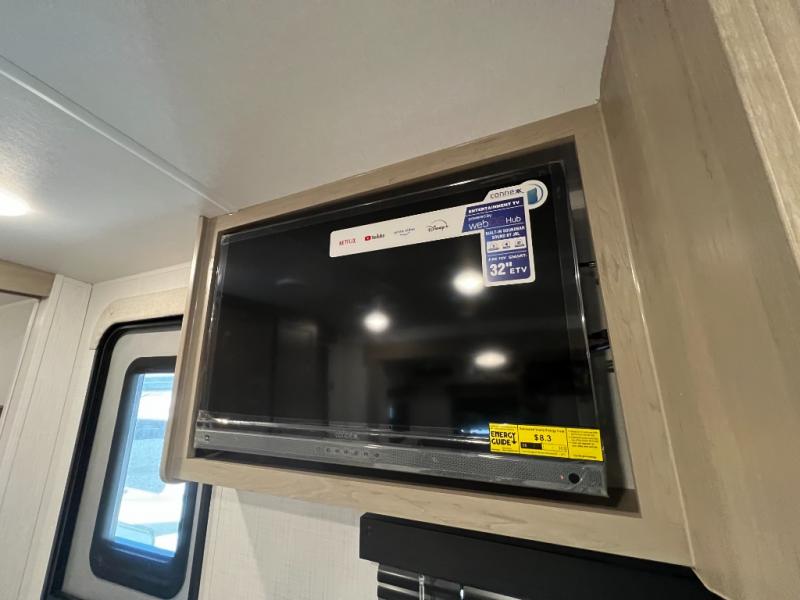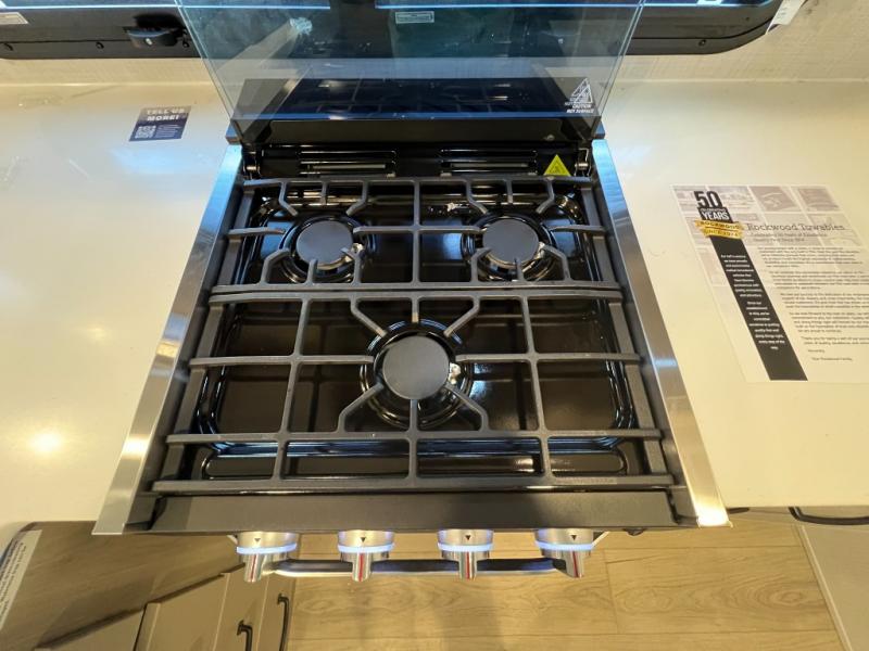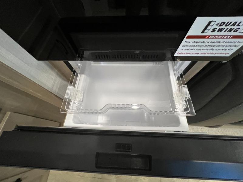 This is the perfect travel trailer for two people looking for comfortable camping trips! You will have your own RV queen bed to sleep on in the front private bedroom, and an optional TV can be added if you enjoy the morning news in bed. Breakfast can be made on the three burner cooktop, or head outdoors to cook on the outside kitchen. The theater seating with a table will provide a place to relax and dine together, and the spacious full rear bath will allow you to clean up before you head out for the day. This model includes plenty of storage space, including two pantries, a wardrobe slide out in the bedroom, plus a drop-frame pass-through storage for larger camp gear!