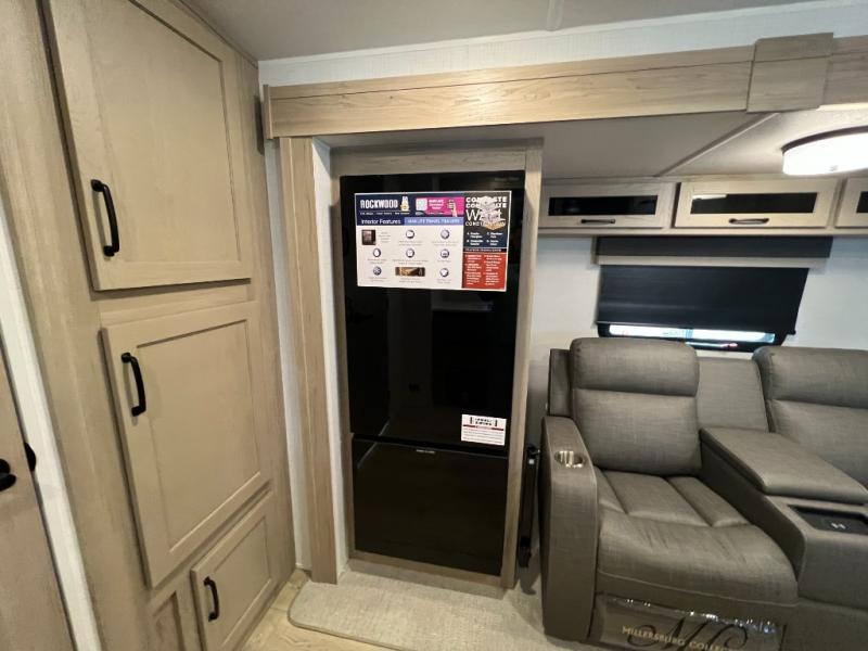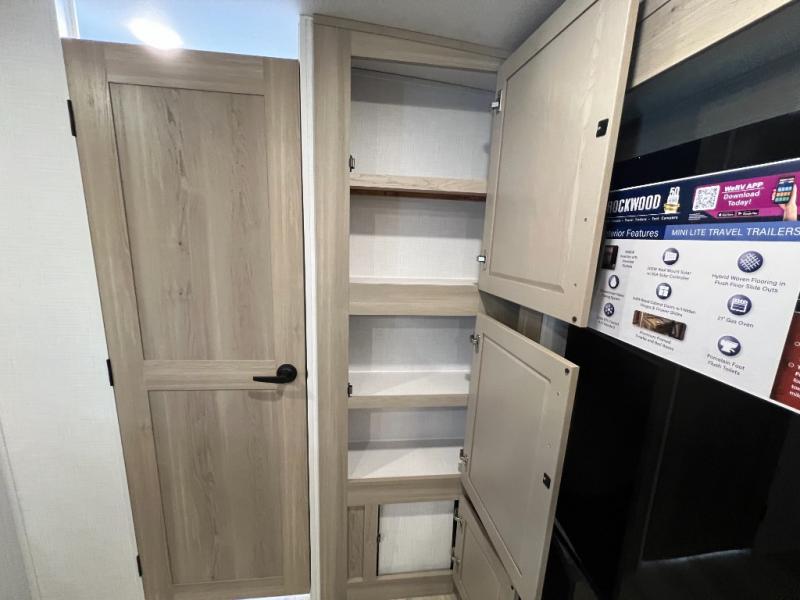 Each Rockwood Mini Lite travel trailer by Forest River is constructed with a fully laminated one-piece walkable roof, sleek frameless windows, and a six-sided full aluminum frame for strength and durability. The 12V thermostatically controlled heated tanks, plus radiant foil in the underbelly and slide out floors will allow you to camp well into the colder months, and the 200W roof solar panel will be perfect for a little off-gridding. Each model includes solid surface kitchen countertops, solid wood cabinet doors, night roller shades, plus many more interior features. Having an AIR 360+ omnidirectional antenna with WiFi prep on board gives you the option to get some work done if it's needed, and the power tongue jack provides hassle-free set up, so you can enjoy more time relaxing!