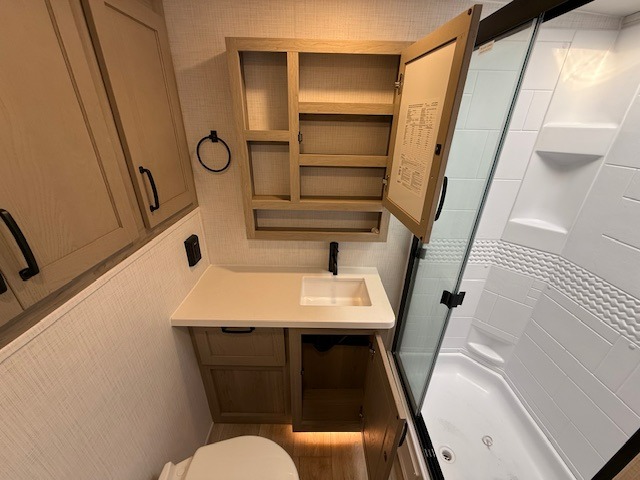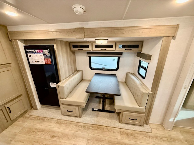 The theater seating with a table provides a perfect spot to dine or unwind while watching the entertainment center with fireplace. When it’s time to get ready for your next adventure, the spacious rear bath offers room to move, a large shower, and plenty of storage space for towels and toiletries.